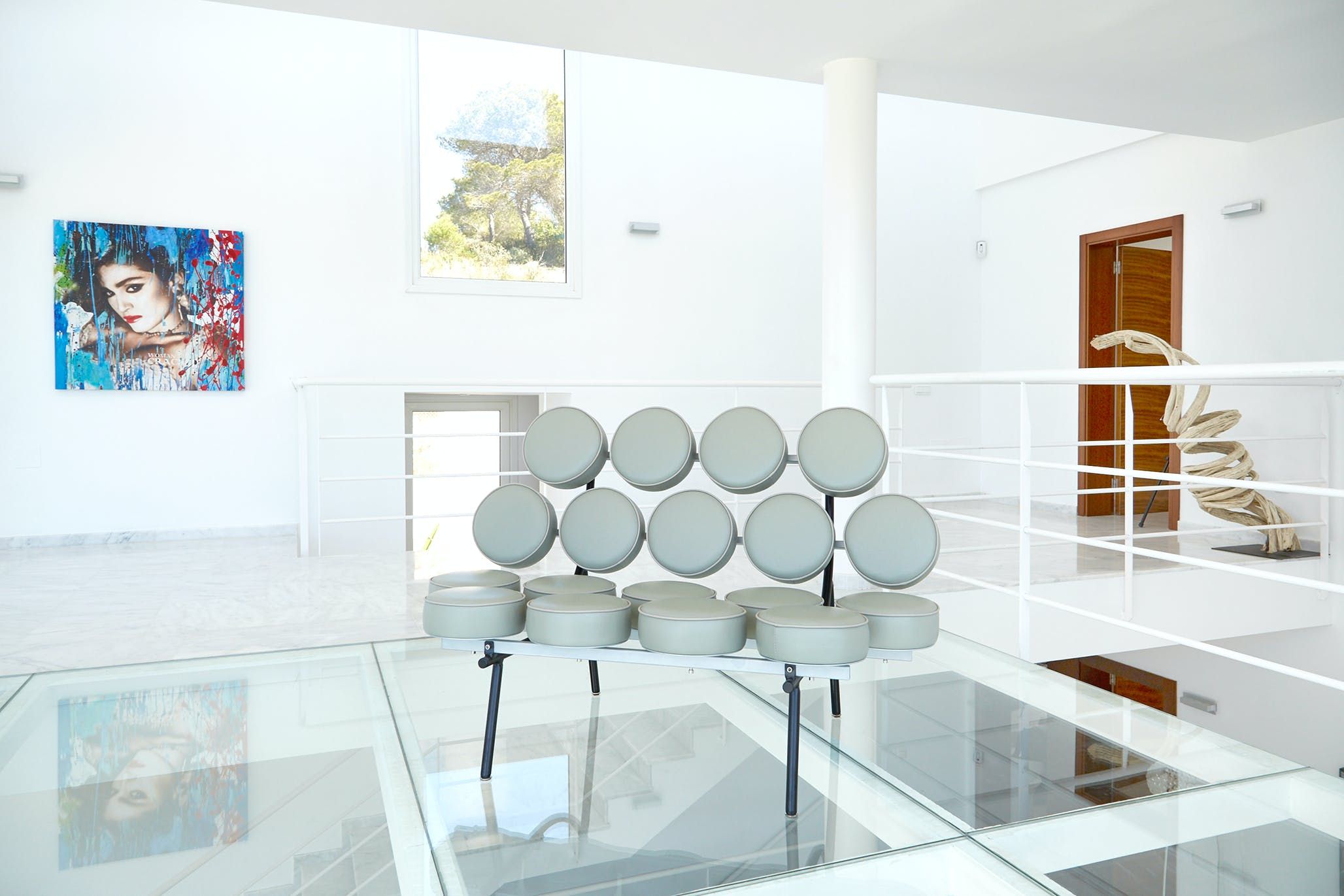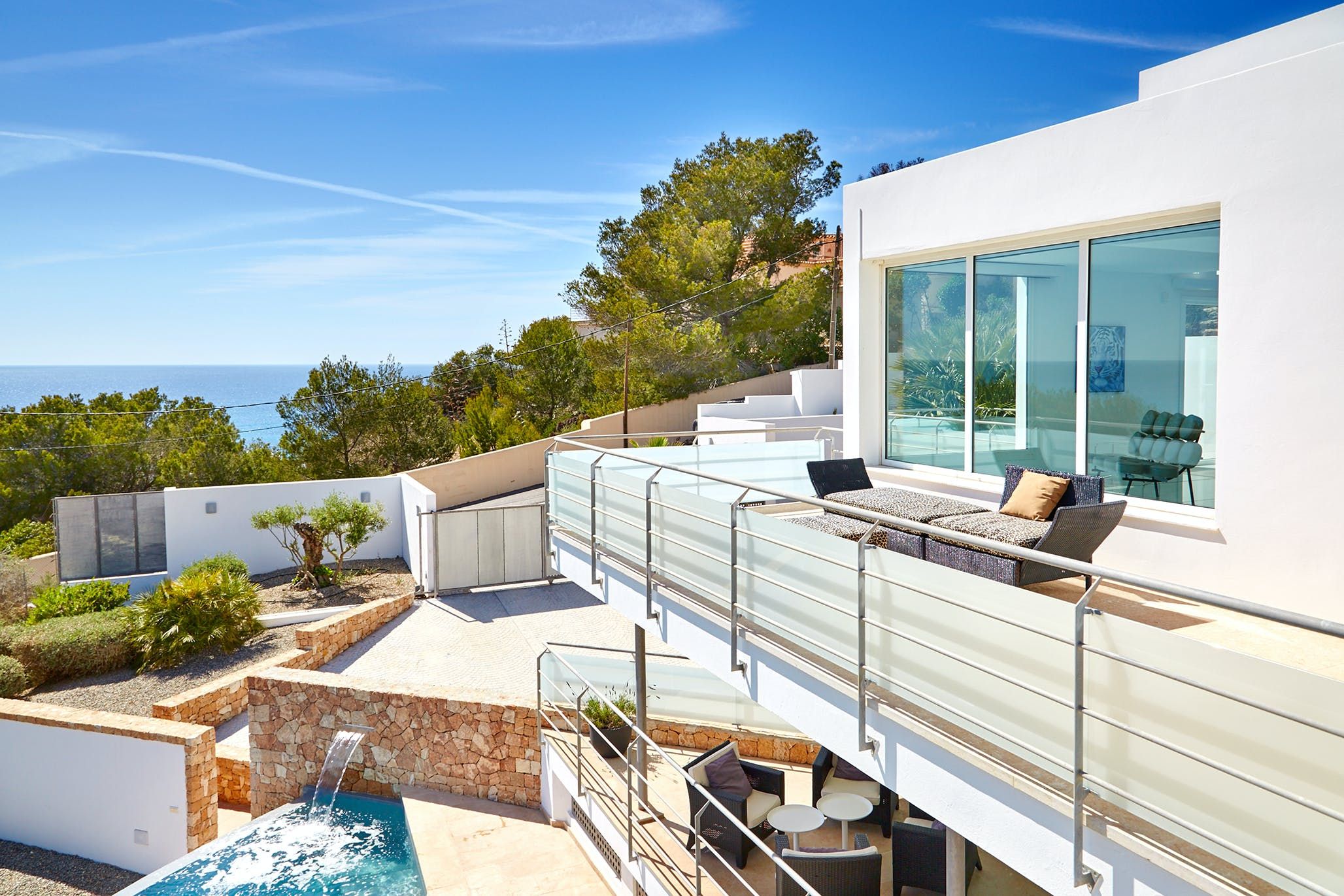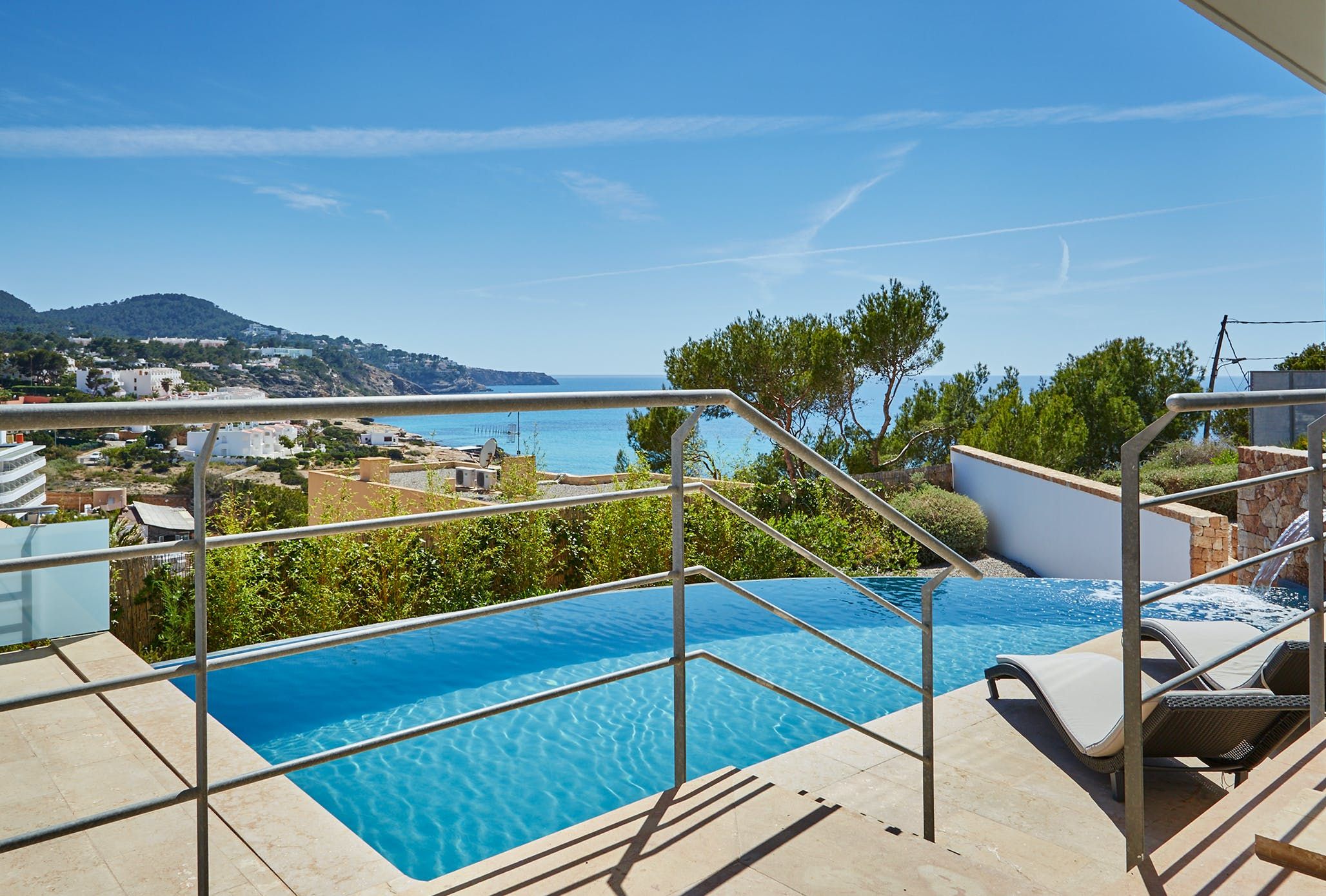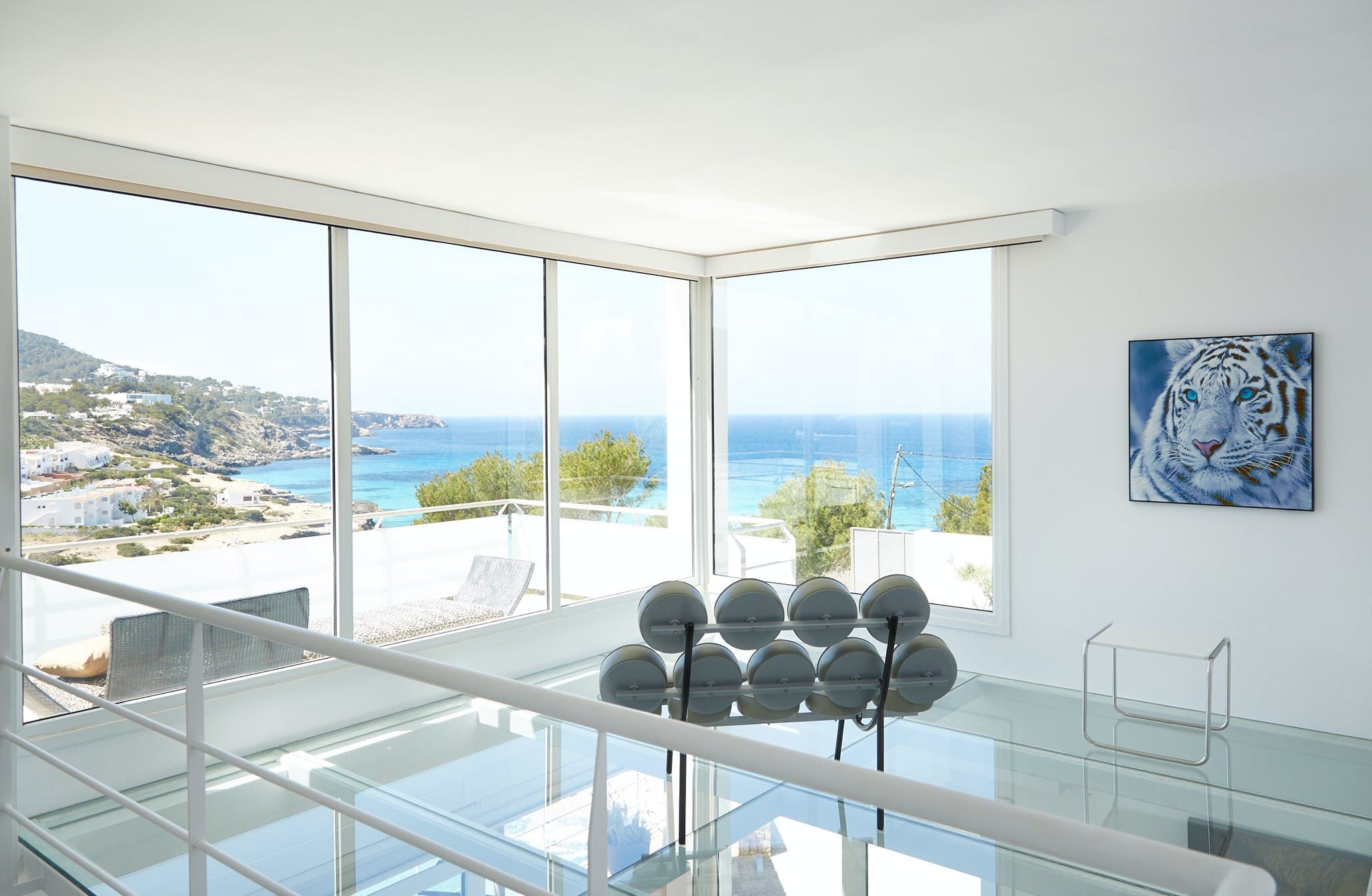 Sleek, modern and brilliant white both inside and out, this home is the quintessential Ibizan villa – just steps away from one of the island's best and most family-friendly beaches. A contemporary take on Art Deco, it's all clean lines, big windows and plentiful outdoor terraces. Luxury is the name of the game here, with a touch of Hollywood glamour in practically every room and plenty of bold design features. We love the open staircase, galleried landing and reinforced glass flooring area – the perfect spot to sit and look out at the sparkling sea.