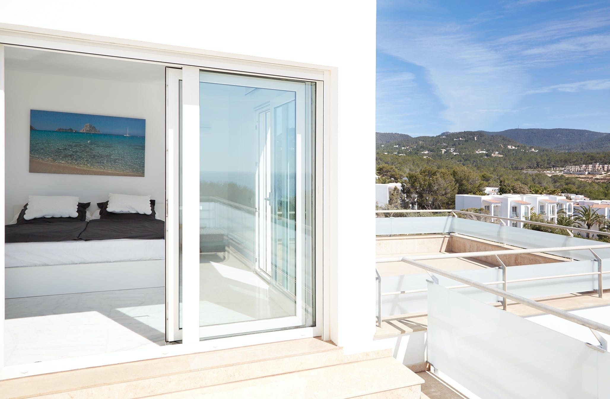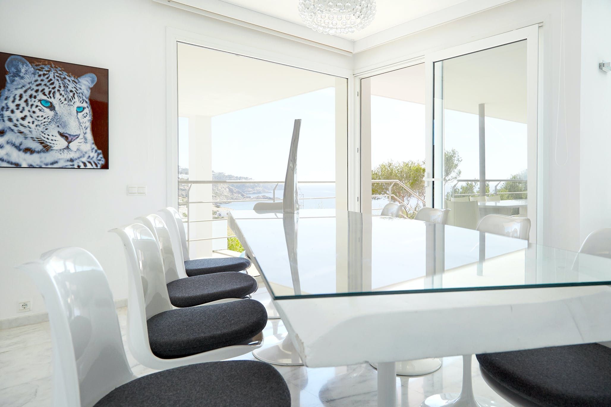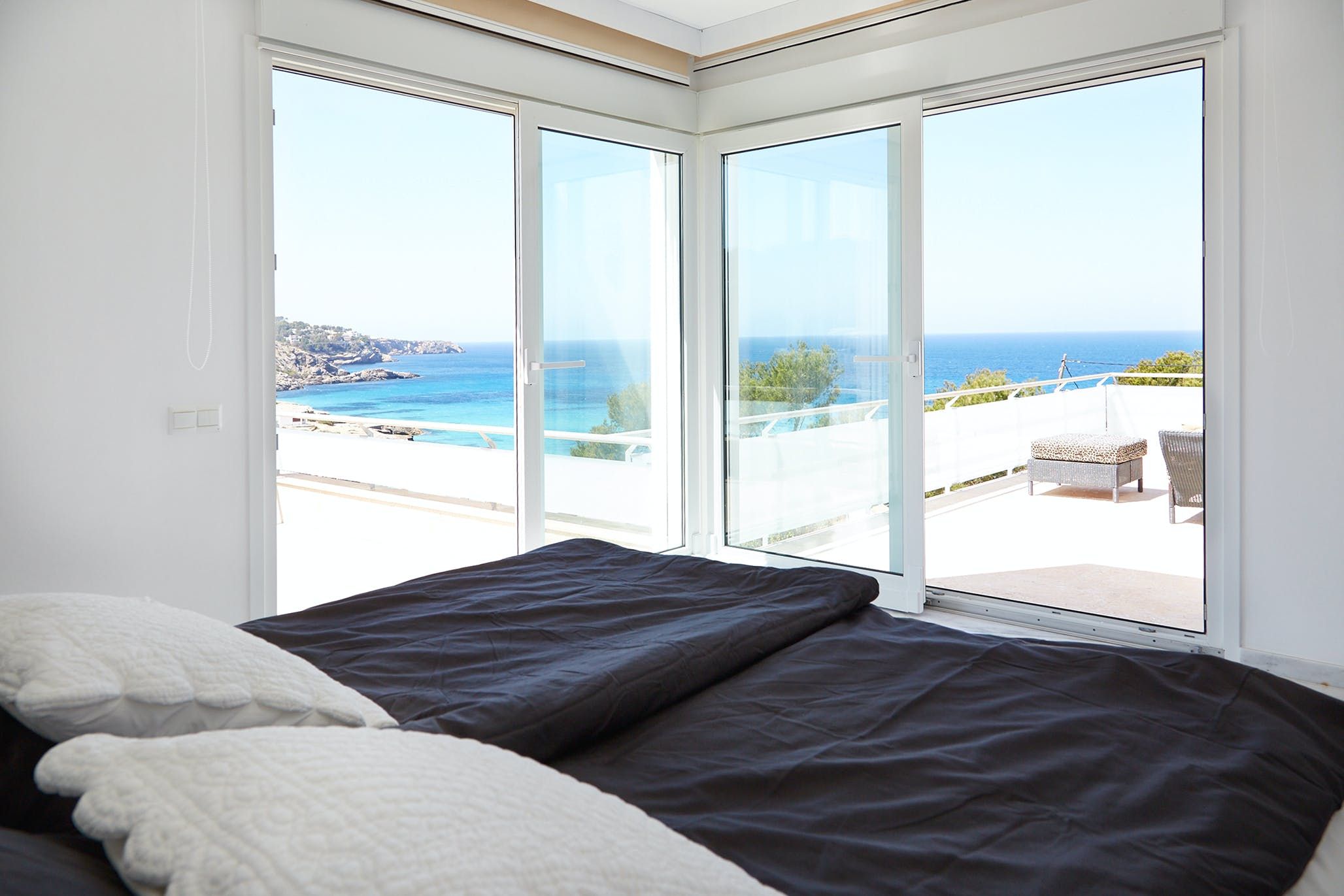 Sleek, modern and brilliant white both inside and out, this home is the quintessential Ibizan villa – just steps away from one of the island's best and most family-friendly beaches. A contemporary take on Art Deco, it's all clean lines, big windows and plentiful outdoor terraces. Luxury is the name of the game here, with a touch of Hollywood glamour in practically every room and plenty of bold design features. We love the open staircase, galleried landing and reinforced glass flooring area – the perfect spot to sit and look out at the sparkling sea.
