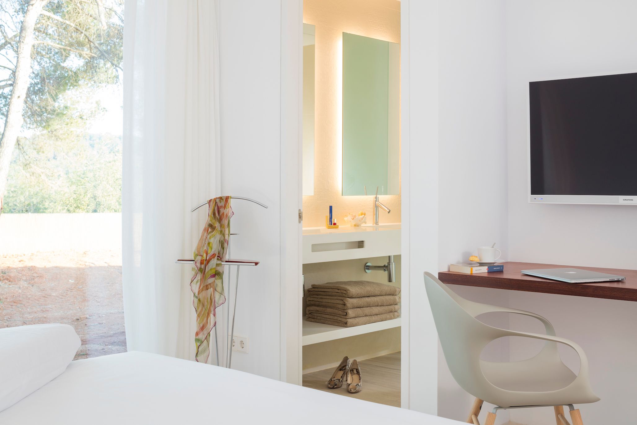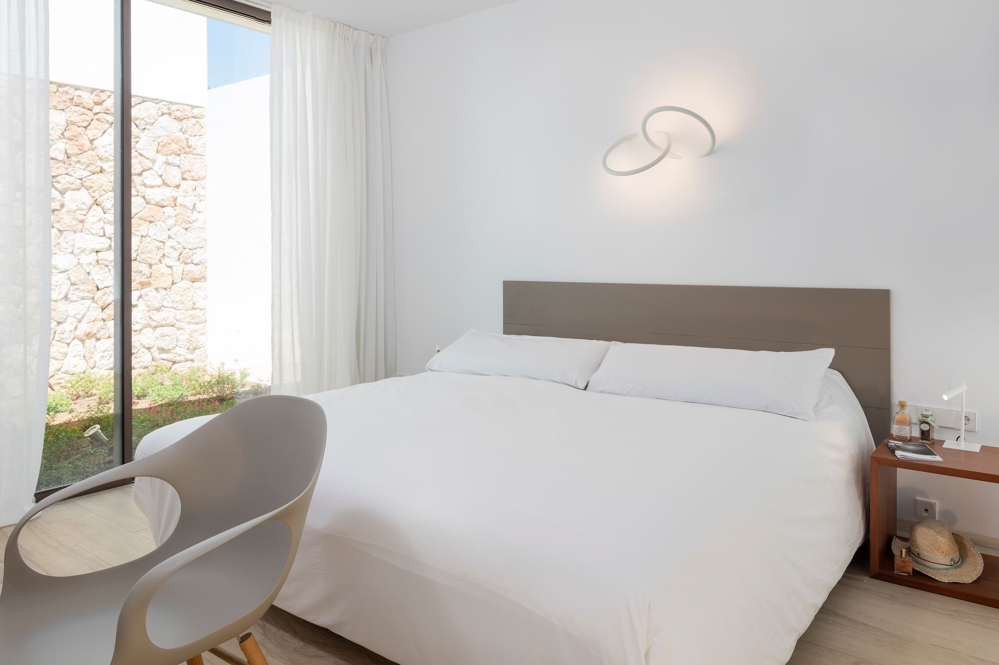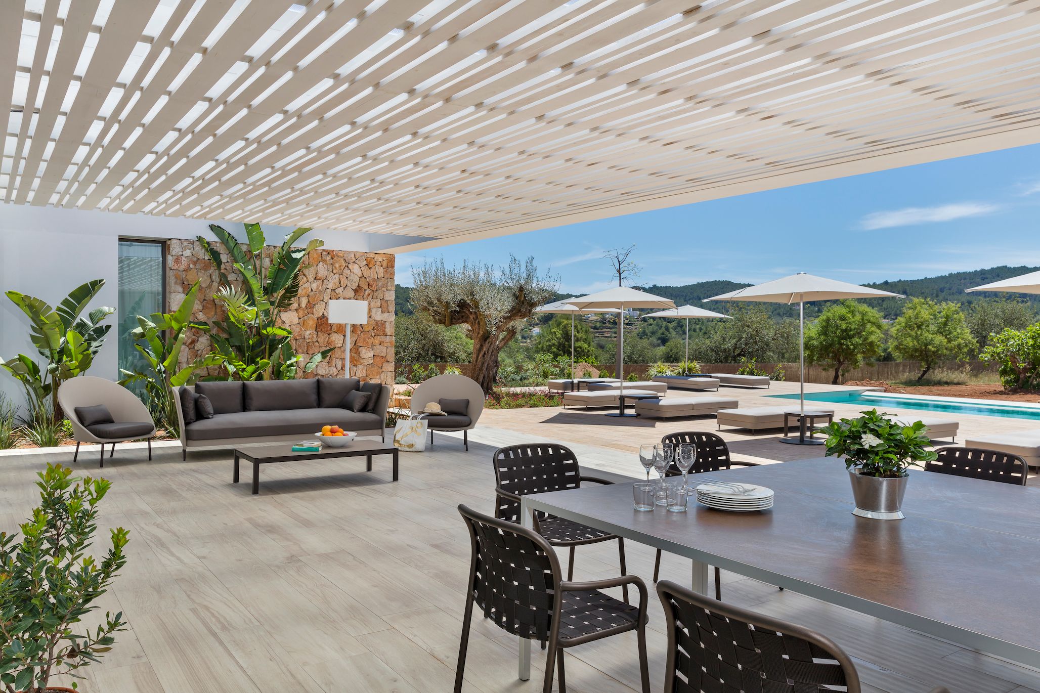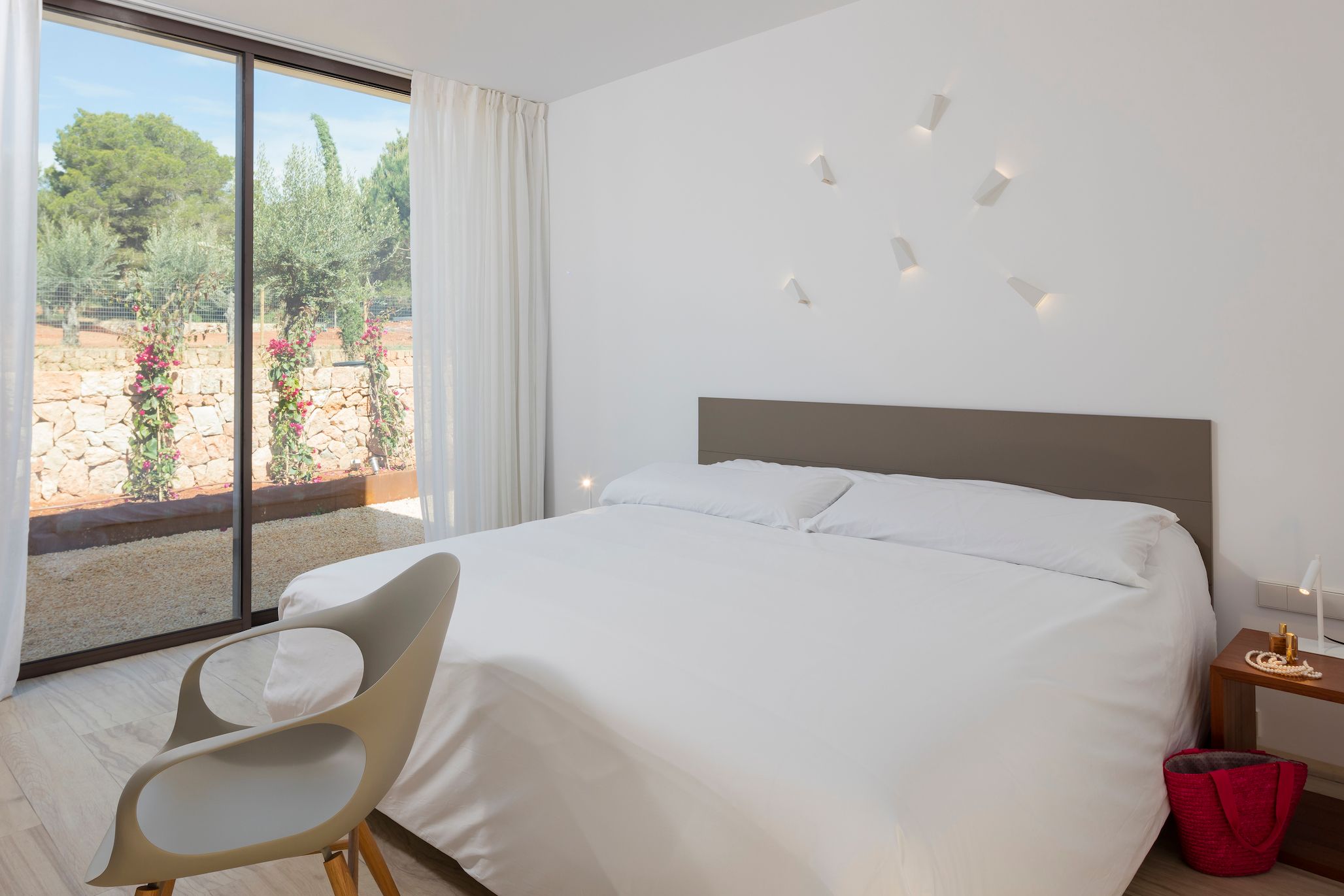 This contemporary villa is bathed in sunlight. While the decor indoors is sleek and spacious (if a bit simple), the outside area really shines. The sprawling terrace is ideal for sunbathing, swimming, and sharing alfresco meals. After a dip in the private pool, stretch out on one of the lounge chairs and admire the tree-studded mountain views. For day trips, it's an easy drive to Cala Llonga and Cala Blanca beach, and about fifteen minutes by car from lively Ibiza Town.