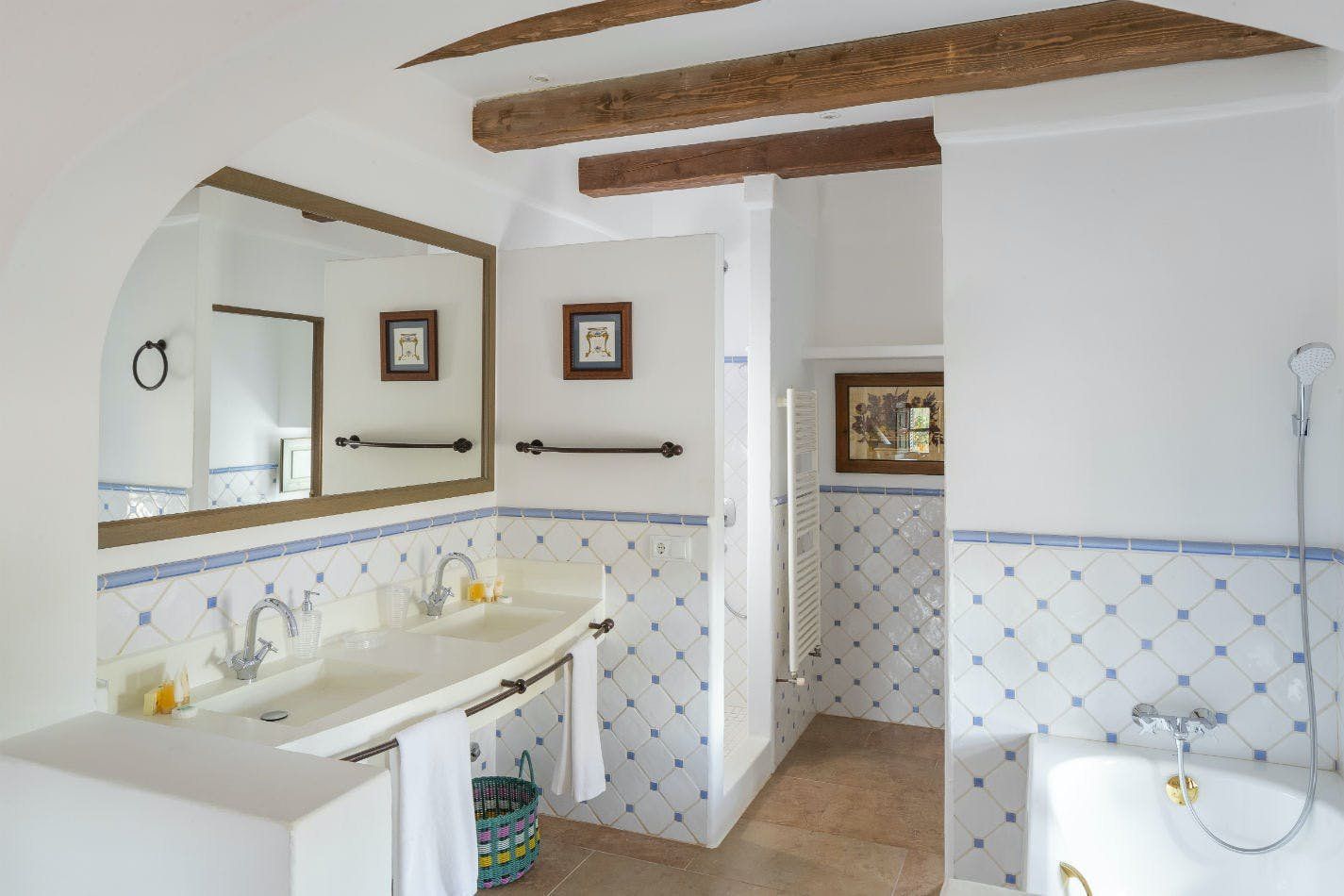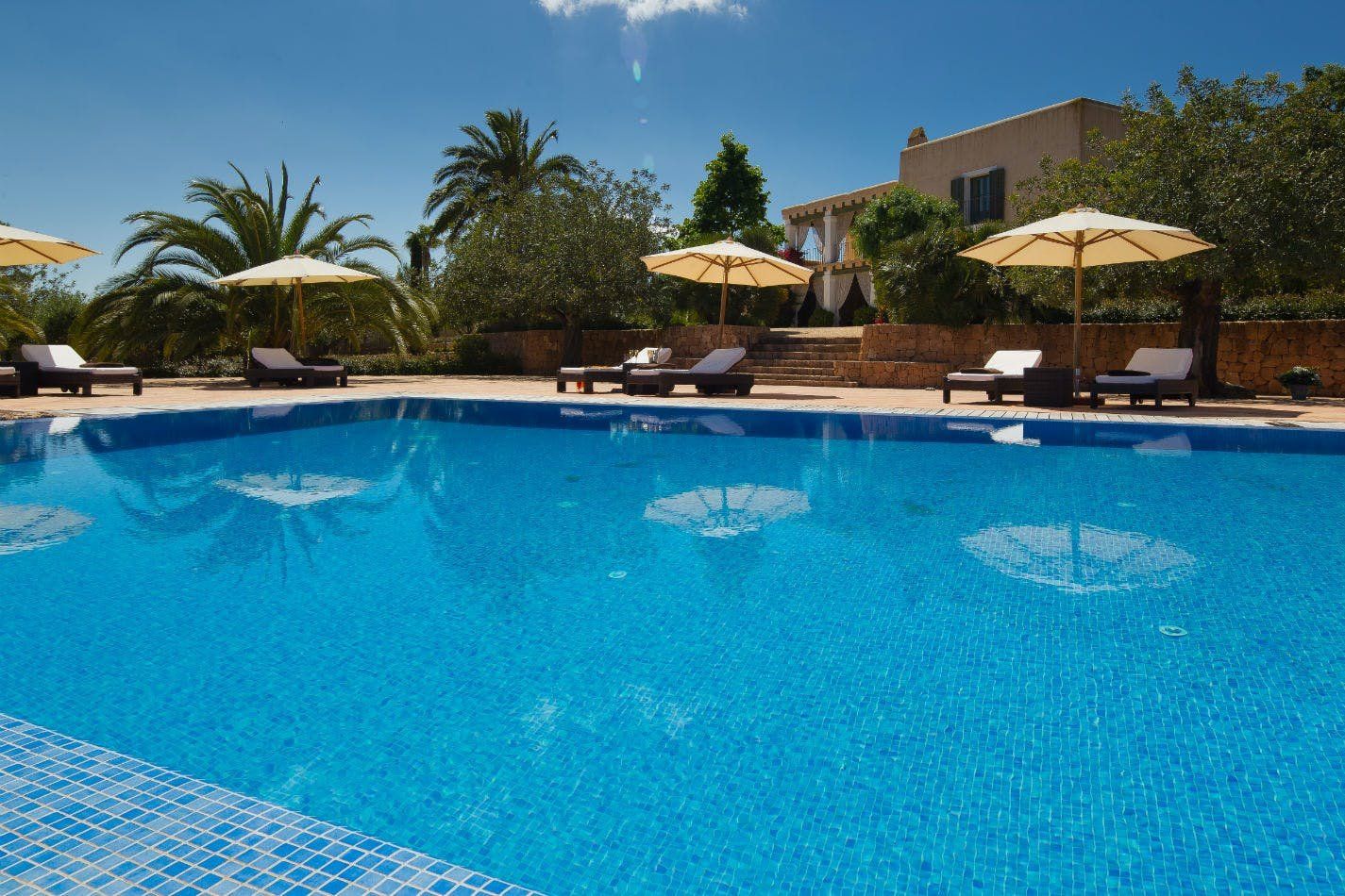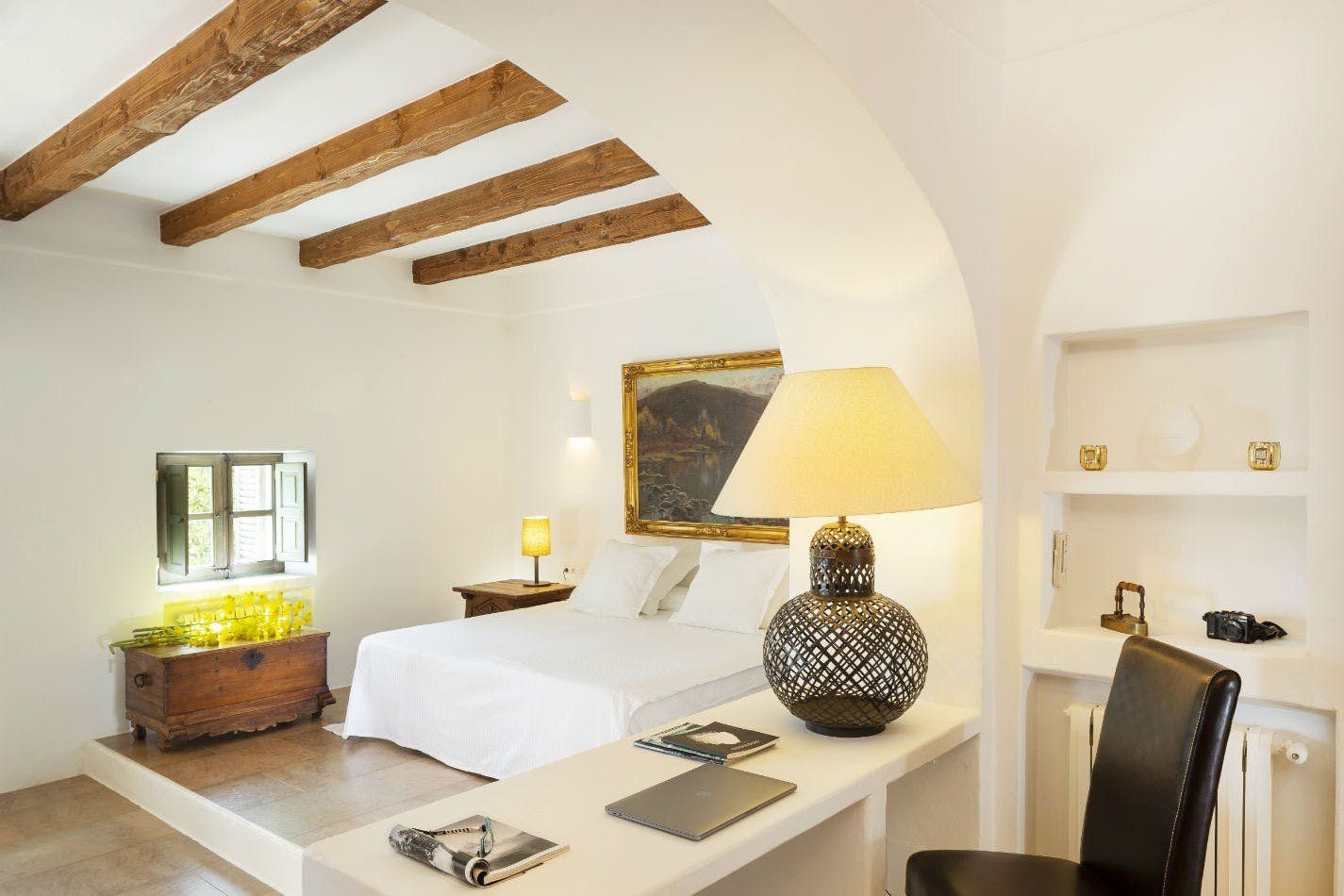 If watching the sunset from your infinity pool sounds like your idea of heaven, then this may be the place for you. Surrounded by swaying palm trees and delicious fruit trees, the home sits in over nine acres of land, allowing you to relax in complete privacy. Outdoors is set up for every hour of the day, with a sunken stone jacuzzi, three covered terraces decked out with dining tables and huge sofas, and a wet bar with a built-in barbecue. With the option to upgrade to a private chef you don’t even have to lift a finger. Sink back into the plump outdoor sofas on the upper terrace and drink in the sublime views over Santa Eulalia past the billowing curtains. Step inside to find colloquial-style interiors of pretty wooden shutters, white-wash stone archways and statement beamed ceilings. The grand living room has a double-height ceiling with rows and rows of books on the mezzanine level above, as if you're unwinding in a private library. Each bedroom has its own en-suite, allowing guests the space and privacy to get ready before an evening in Ibiza Town, only 15 minutes away. Take the stress out of making plans, and opt for the concierge service to arrange bookings and a range of bespoke events around the island. The daily villa cleaning means you’ll always return home to a tidy space and freshly turned-down beds. Bliss!