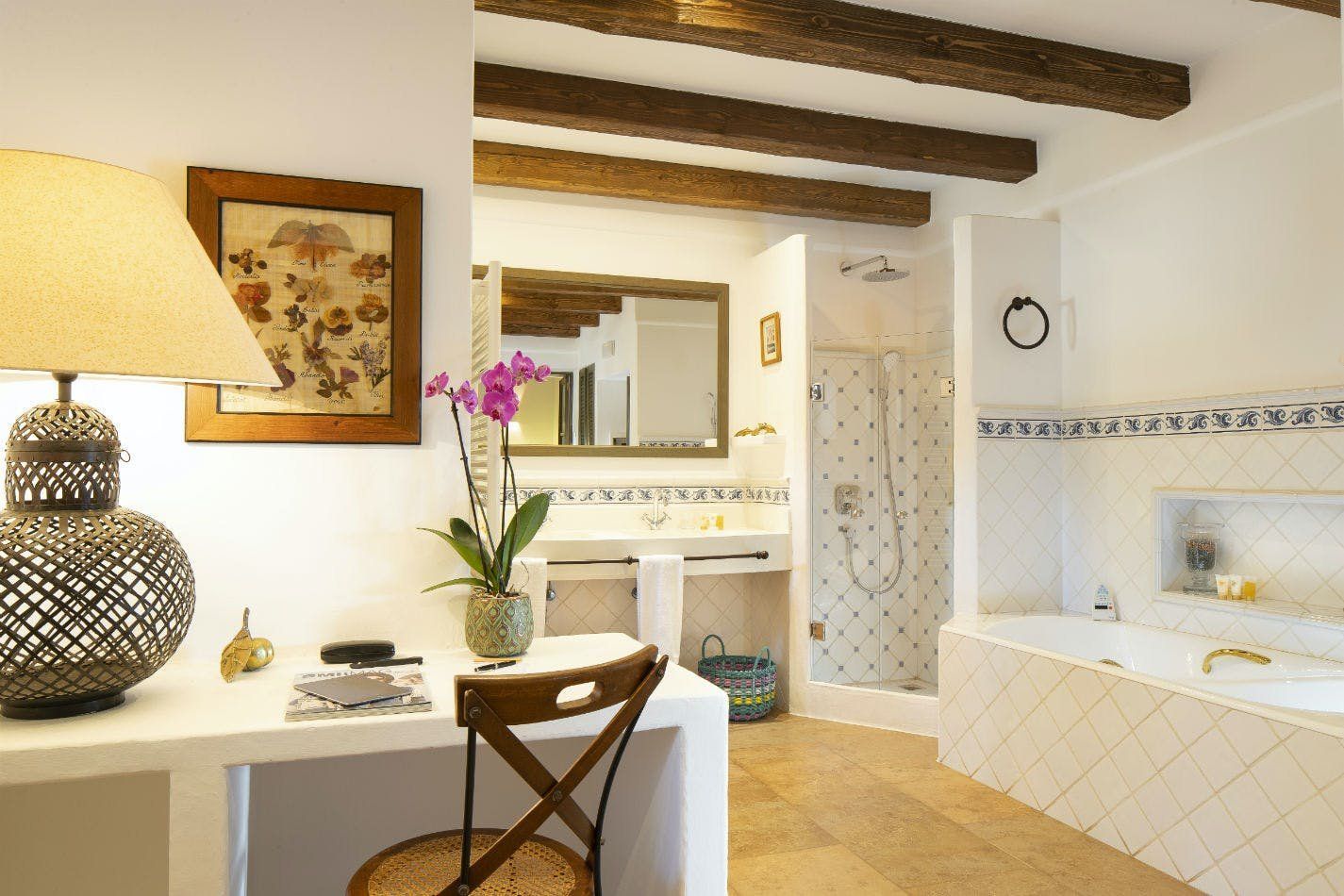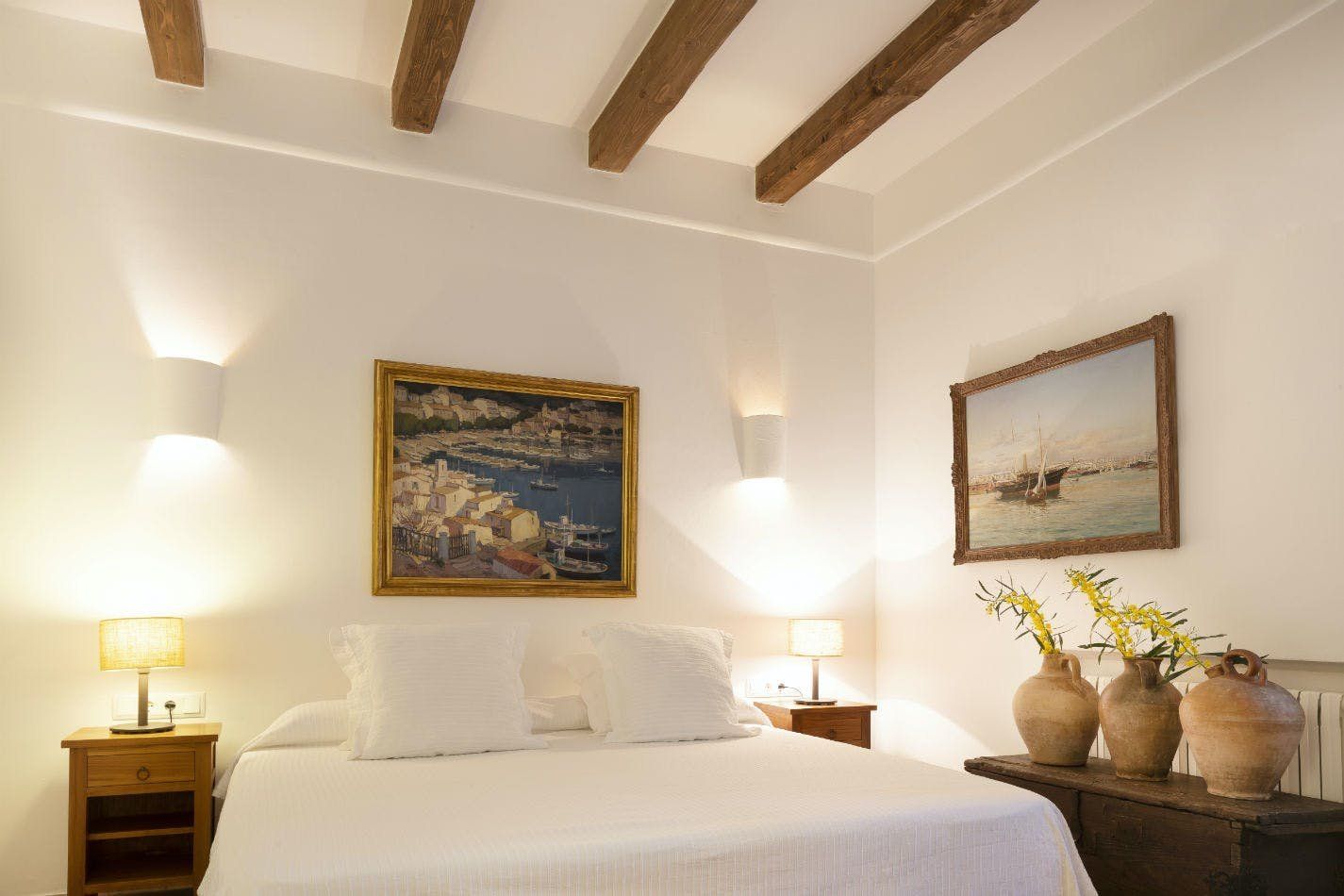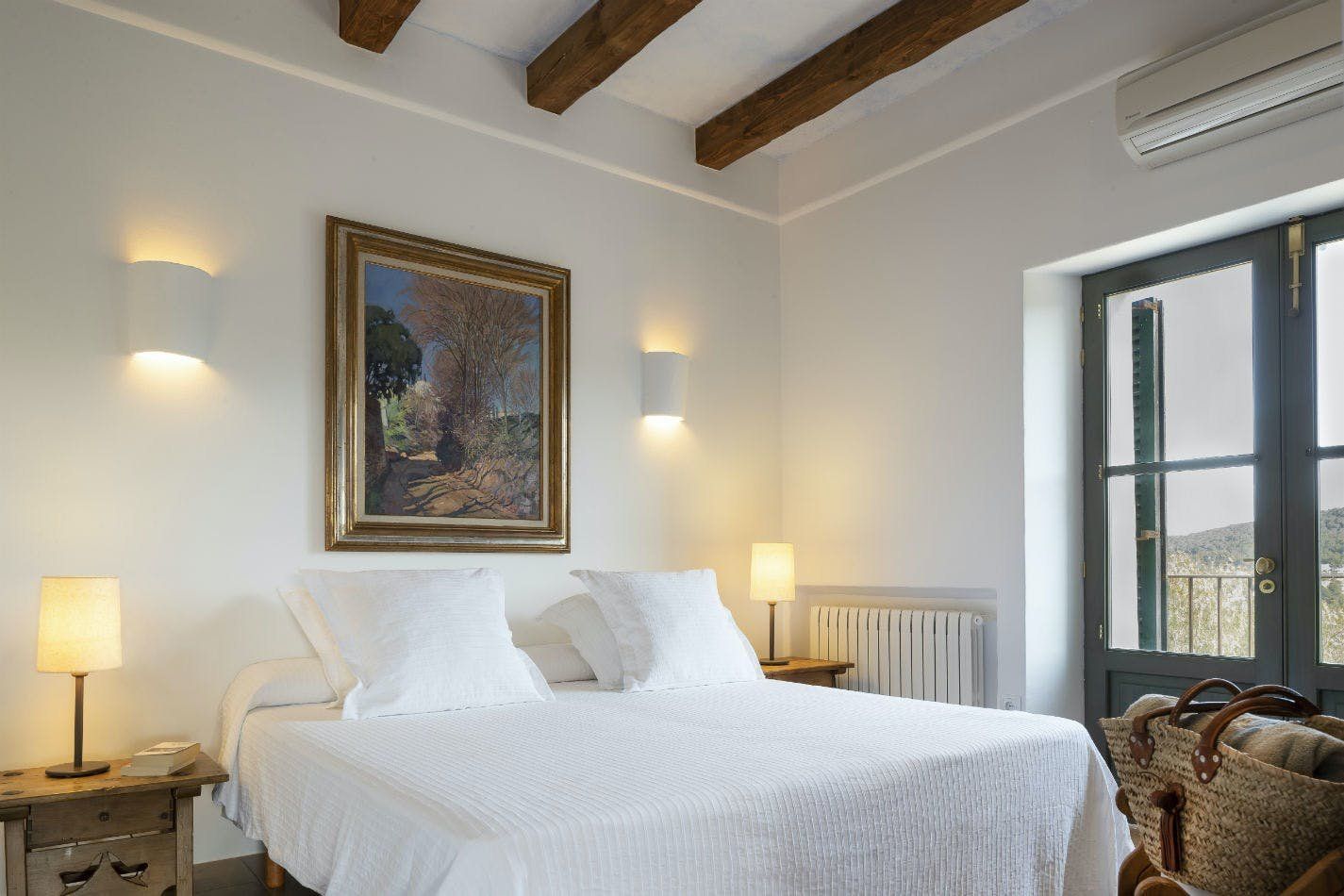 If watching the sunset from your infinity pool sounds like your idea of heaven, then this may be the place for you. Surrounded by swaying palm trees and delicious fruit trees, the home sits in over nine acres of land, allowing you to relax in complete privacy. Outdoors is set up for every hour of the day, with a sunken stone jacuzzi, three covered terraces decked out with dining tables and huge sofas, and a wet bar with a built-in barbecue. With the option to upgrade to a private chef you don’t even have to lift a finger. Sink back into the plump outdoor sofas on the upper terrace and drink in the sublime views over Santa Eulalia past the billowing curtains. Step inside to find colloquial-style interiors of pretty wooden shutters, white-wash stone archways and statement beamed ceilings. The grand living room has a double-height ceiling with rows and rows of books on the mezzanine level above, as if you're unwinding in a private library. Each bedroom has its own en-suite, allowing guests the space and privacy to get ready before an evening in Ibiza Town, only 15 minutes away. Take the stress out of making plans, and opt for the concierge service to arrange bookings and a range of bespoke events around the island. The daily villa cleaning means you’ll always return home to a tidy space and freshly turned-down beds. Bliss!