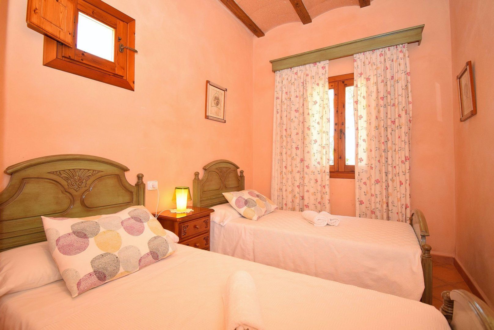 Inside, this villa is the epitome of rural Balearic style – think high ceilings, characterful beams, warm exposed stone walls and pale terracotta-coloured walls.