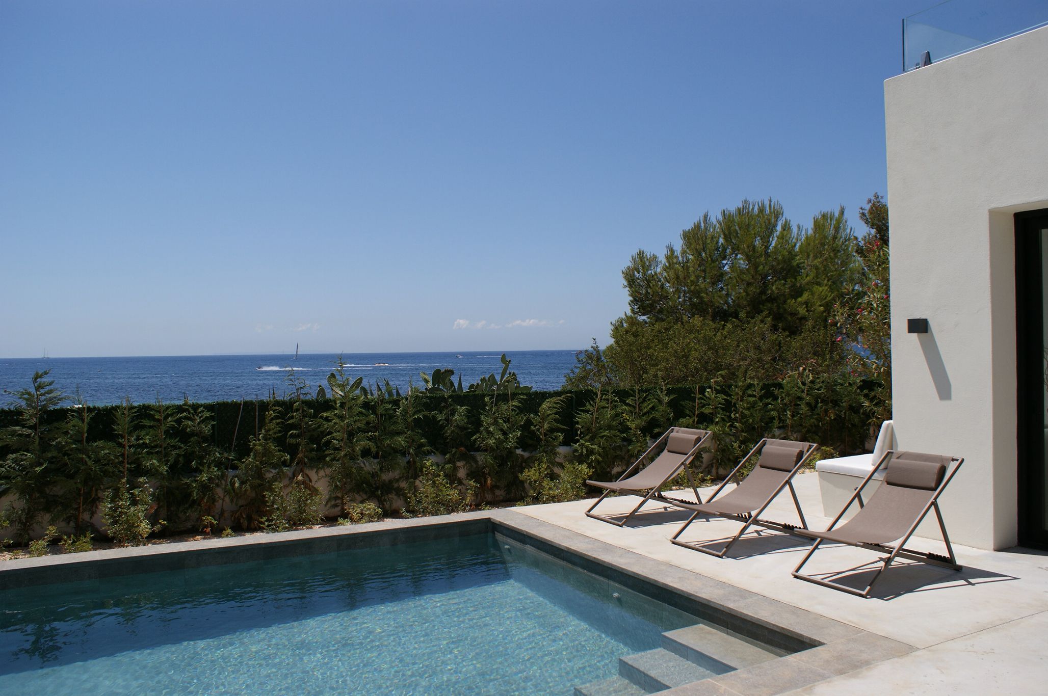 This frontline home has wonderful sea views from its poolside and upper terrace. There’s an alfresco dining space, with a table seating eight and barbeque, also alongside the pool. Inside, there’s an open-plan living area and a well-equipped kitchen. Also, all of the bedrooms are on the ground floor – we especially love the main bedroom with its French doors onto the patio. Another highlight of this home is the beach is only 20 metres away. The villa is situated in S’Argamassa, a beachfront destination most famous for the Nikki Beach Club. Just to the north, you’ll also find the family-friendly town of Santa Eulalia.