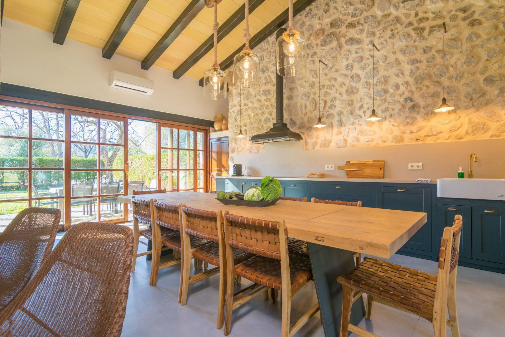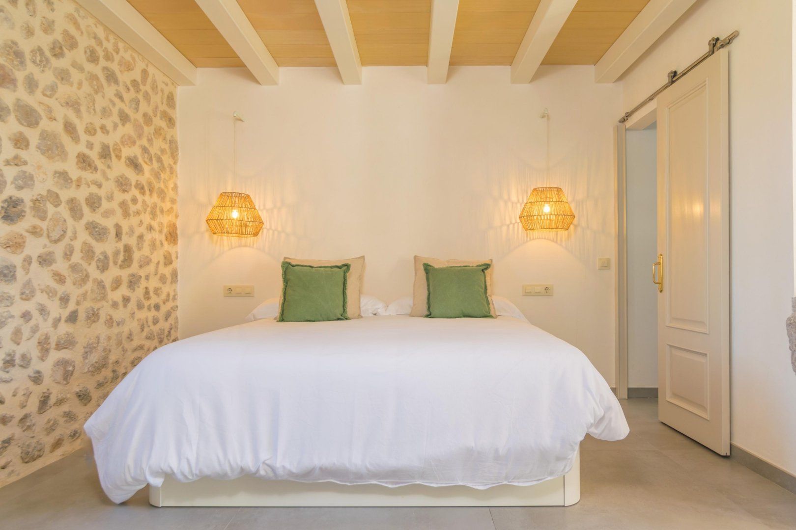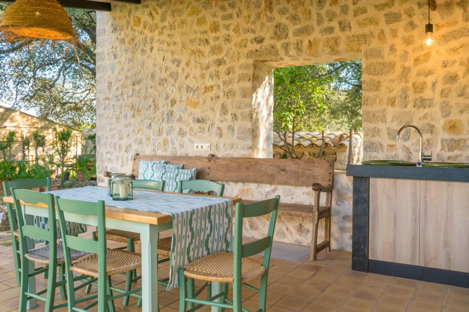 In the rolling Mallorcan countryside between the medieval hilltop towns, this villa embraces island traditional and farmhouse rusticana. Honey-hued stone is on display inside and out, and the home’s original stone archways and alcoves whisper of the past. The double-height kitchen and dining room is almost cathedral-like in their old grandeur, yet furnishings are modern and stylish. An archway leads to the living room, set around an iron-cast wood-burner that can keep things cosy in the cooler months. The rusticana continues in bedrooms with wood-beamed ceilings and ensuites with sinks hewn from stone.