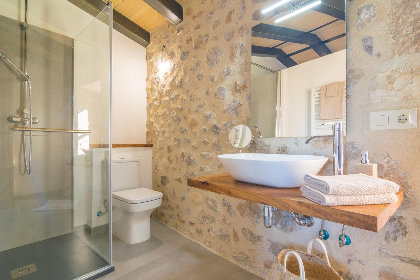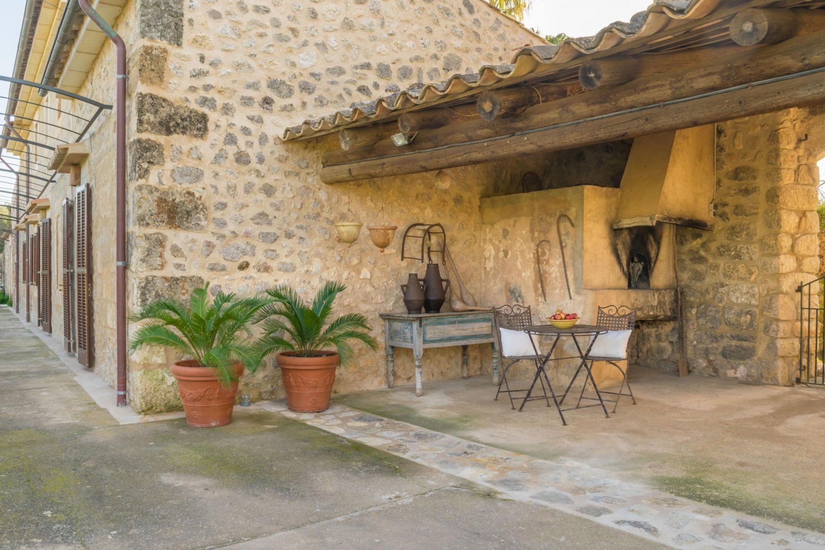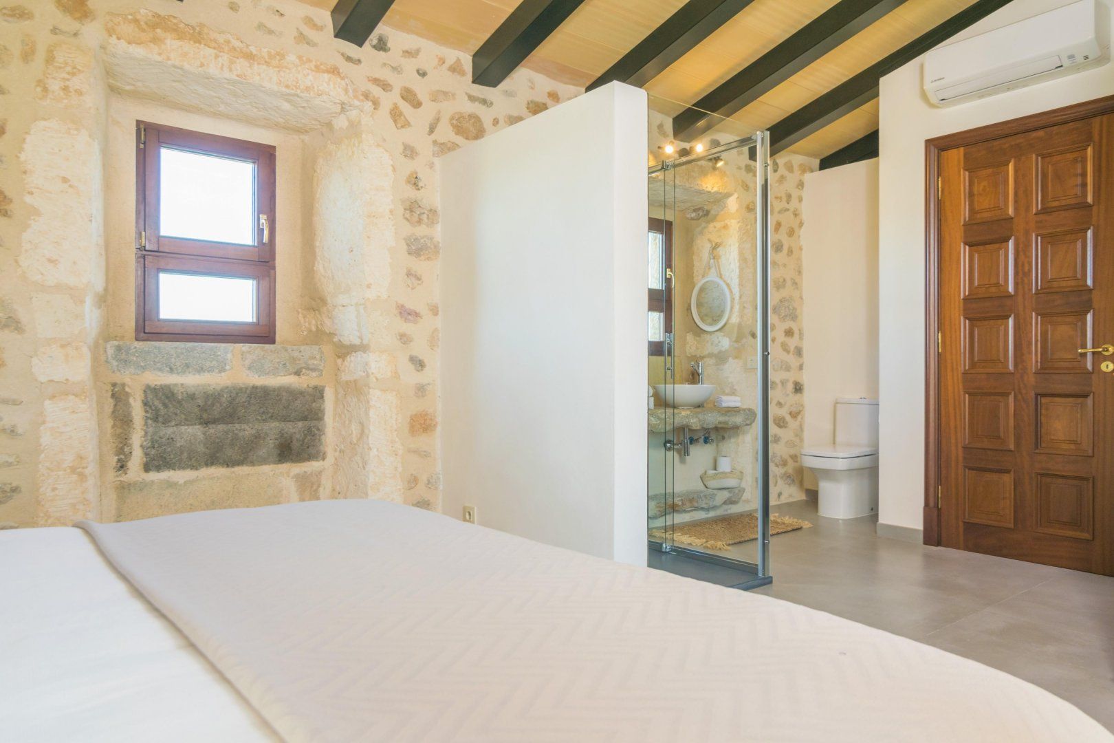 In the rolling Mallorcan countryside between the medieval hilltop towns, this villa embraces island traditional and farmhouse rusticana. Honey-hued stone is on display inside and out, and the home’s original stone archways and alcoves whisper of the past. The double-height kitchen and dining room is almost cathedral-like in their old grandeur, yet furnishings are modern and stylish. An archway leads to the living room, set around an iron-cast wood-burner that can keep things cosy in the cooler months. The rusticana continues in bedrooms with wood-beamed ceilings and ensuites with sinks hewn from stone.