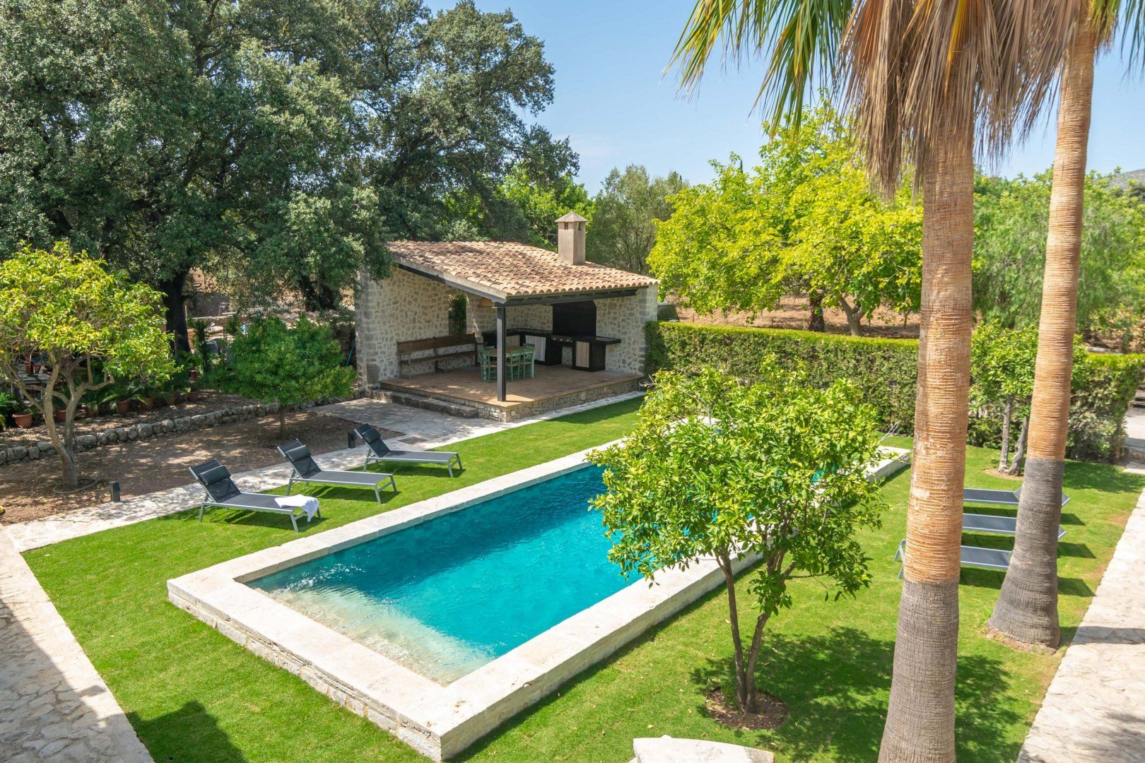 The highlight of this home, though, is the outside space. Stone steps lead into the turquoise swimming pool – the perfect tonic to the Balearic heat. A full outdoor kitchen with a built-in grill and bread oven can cater for long lunches at the rustic wooden dining table, and palm trees rise up from the lawn to shade poolside loungers.