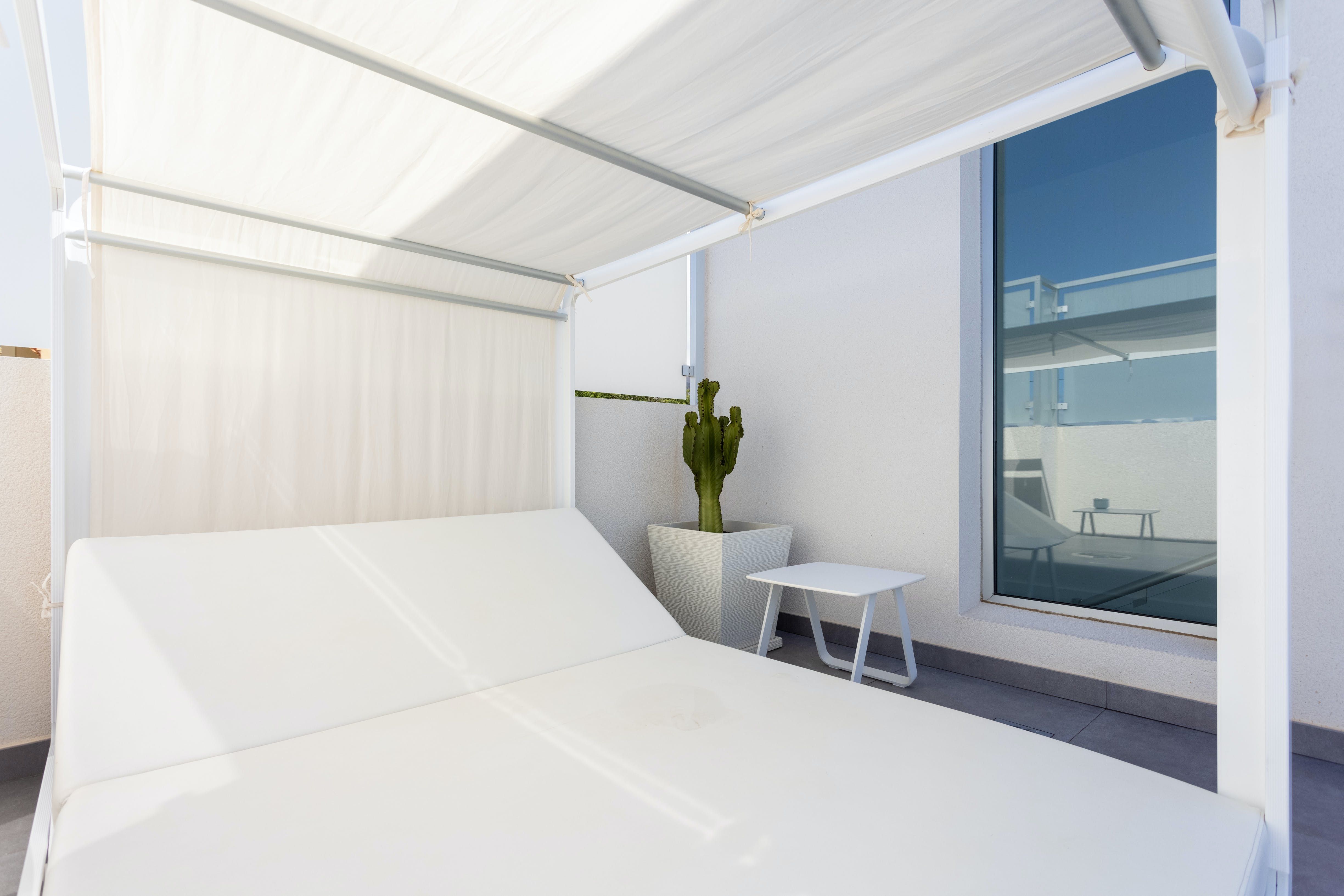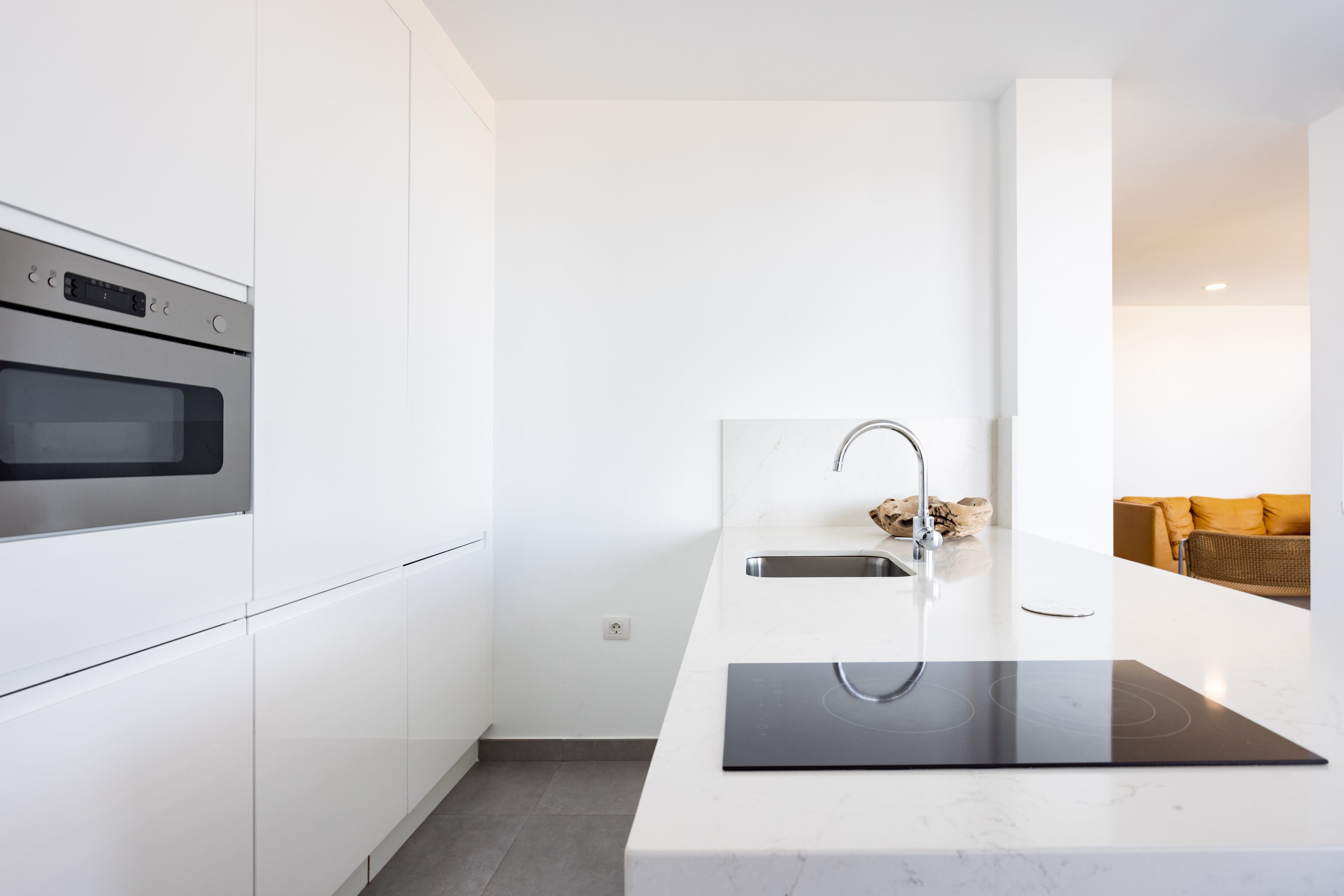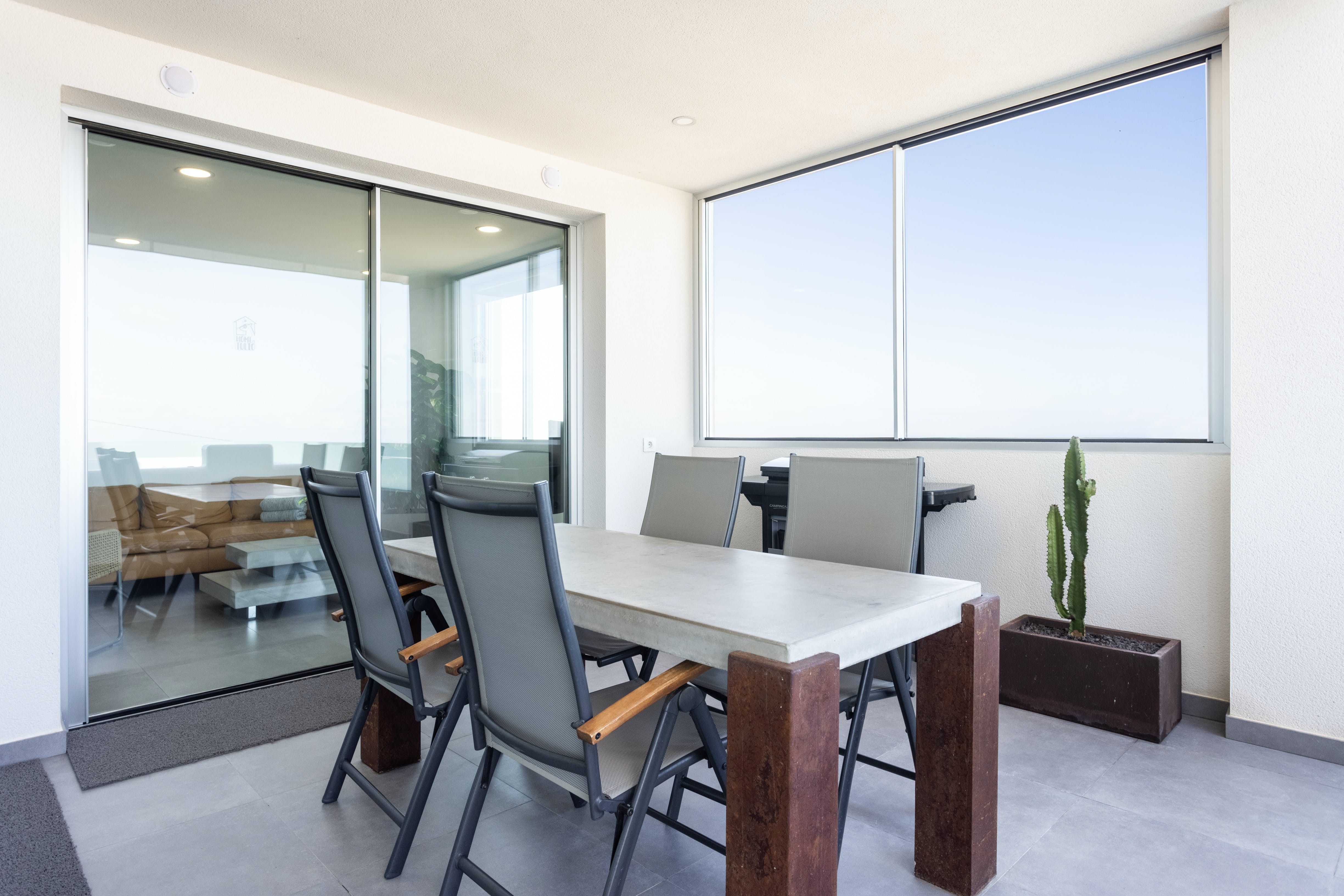 Inside, a calm, natural colour palette and a chic, minimalist decor will put you immediately at ease in the open-plan living space. We love the collection of leafy houseplants that brings that island feeling inside, as well as the large windows proferring ocean views. Kick back on the sofa with one of the books on the shelves or slide open the glass doors here to step out onto a private terrace. Equipped with a shaded dining table and chairs, as well as a barbecue, this is where you’ll want to gather for celebratory alfresco meals while feasting on the stunning views. You'll also find a day bed that invites you to catch up on your holiday reading between luxurious dips in the hot tub.