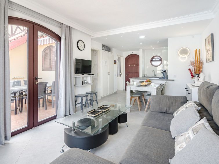 "Tagoro Solarium & Pool View", 2-room maisonette 50 m2, on the upper floor. Object suitable for 2 adults. Bright, renovated, practical and modern furnishings: living/dining room with dining table, digital TV, international TV channels and flat screen. Exit to the terrace. 1 room with 2 beds (80 cm, length 200 cm).