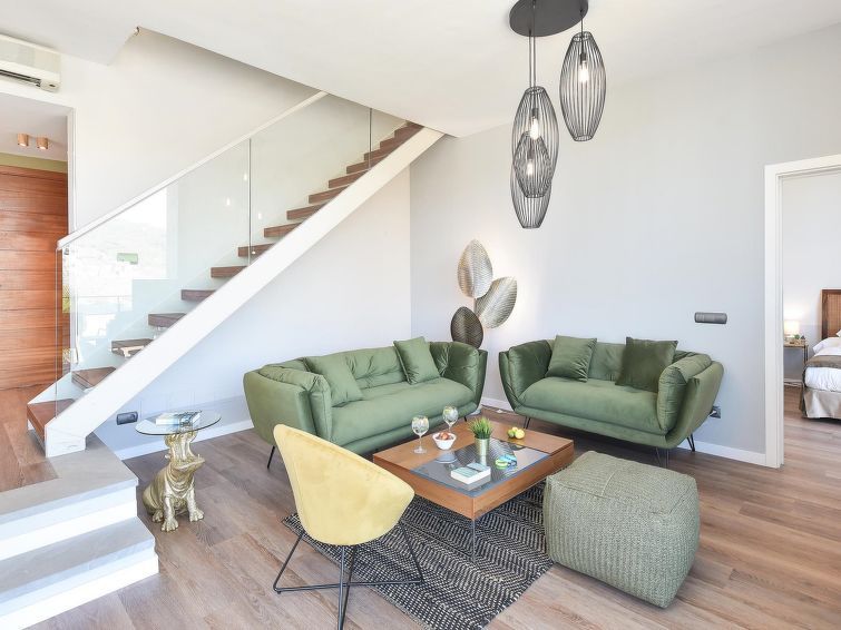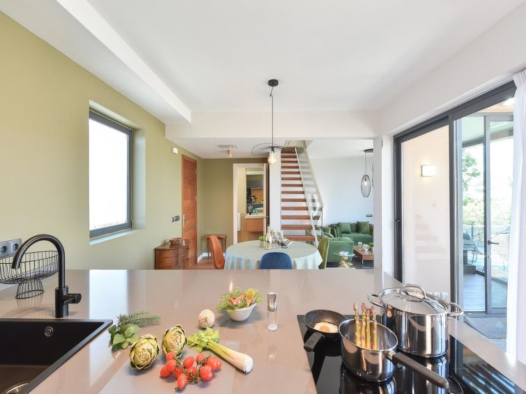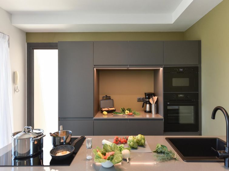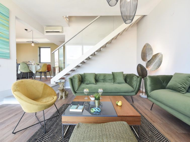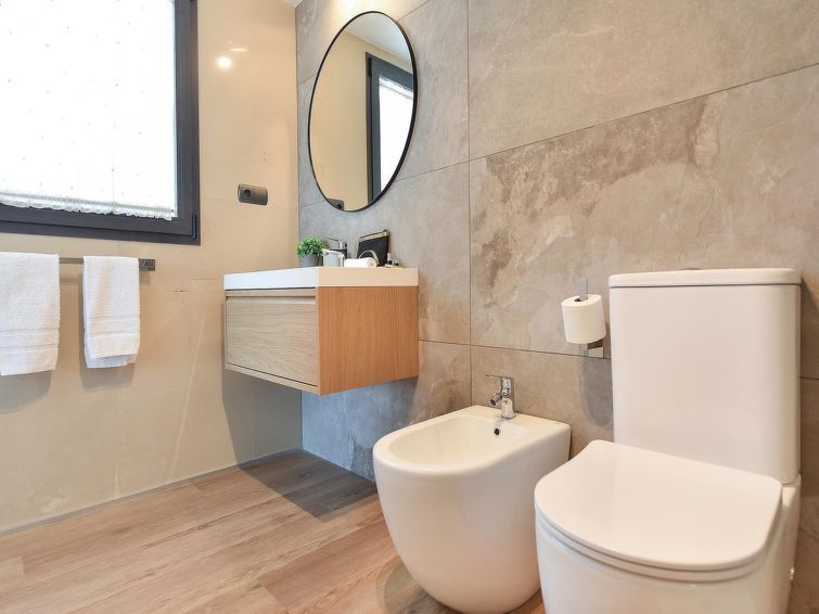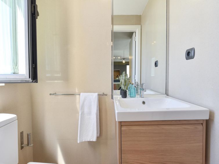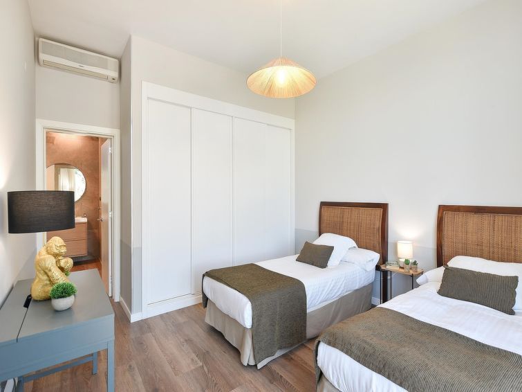 4-room house 115 m2. Modern furnishings: living/dining room with dining table, satellite TV, cable TV, digital TV, DVD and air conditioning. Exit to the patio. 1 room with 2 beds and shower/WC. Open kitchen (oven, dishwasher, 4 ceramic glass hob hotplates, toaster, kettle, microwave, freezer, electric coffee machine).
