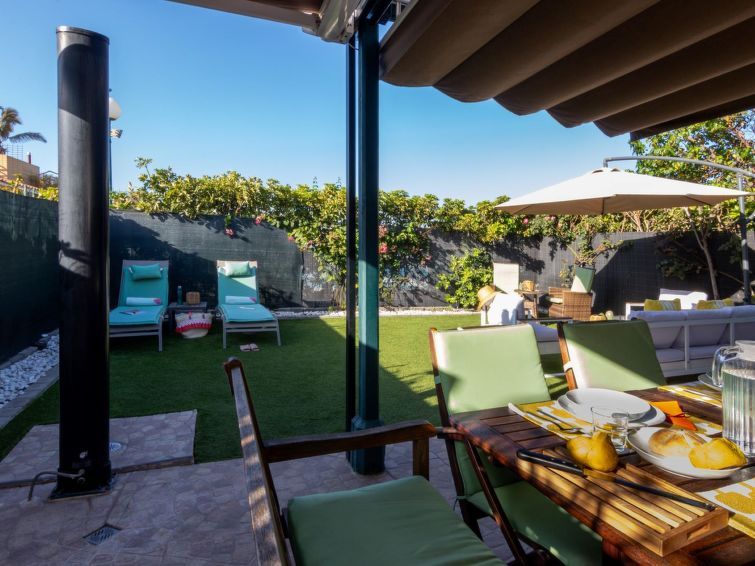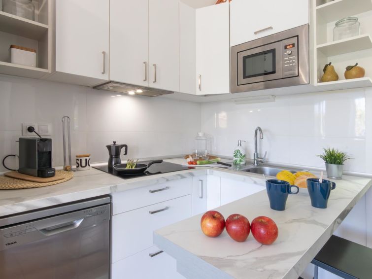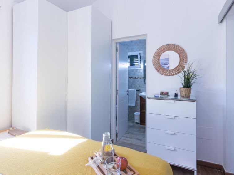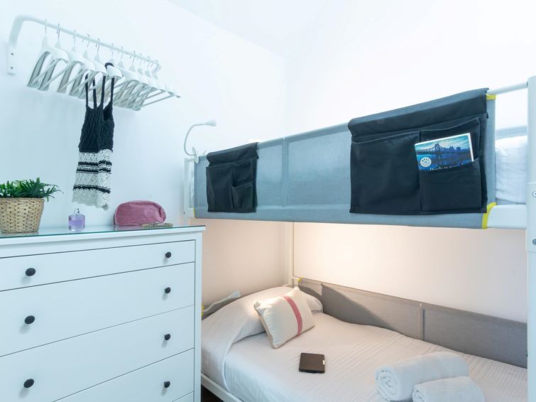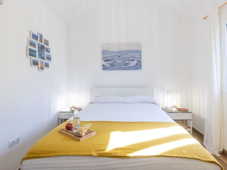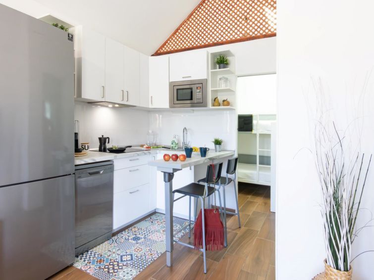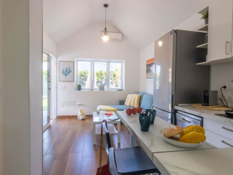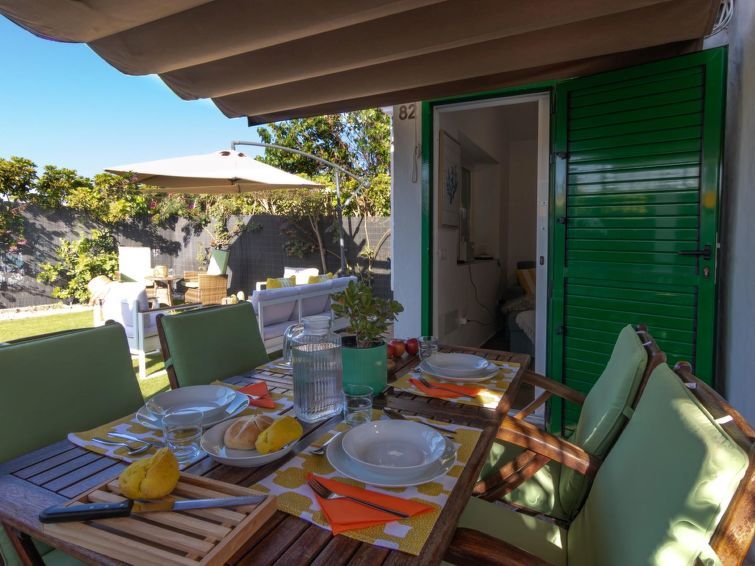 "Playa Flor 82", 3-room bungalow 45 m2. Object suitable for 2 adults + 2 children. Bright, very simple and cosy furnishings: open living/dining room with TV, flat screen and air conditioning. Exit to the patio. 1 room with 1 double bed. 1 room with 1 x 2 bunk beds. Open kitchen (oven, dishwasher, 4 ceramic glass hob hotplates, toaster, microwave, freezer, electric coffee machine) with dining table.