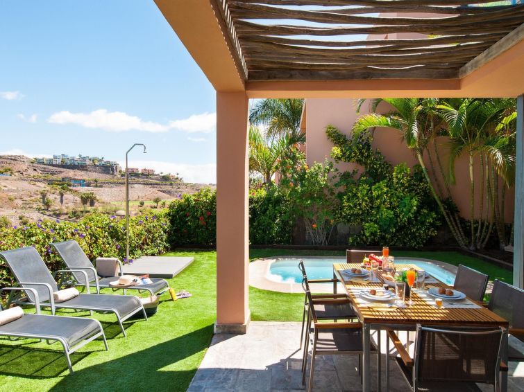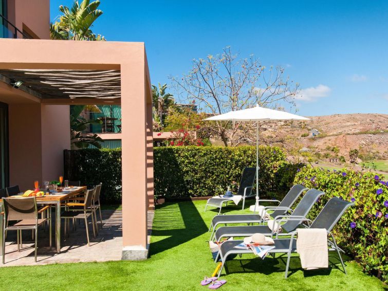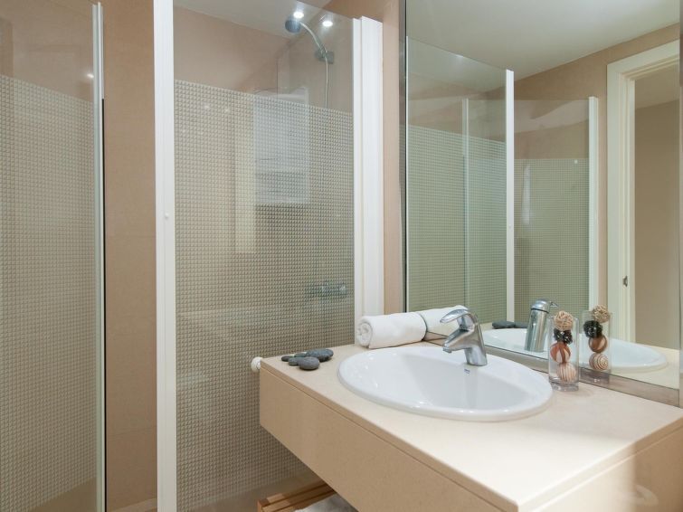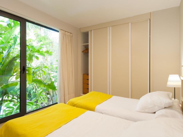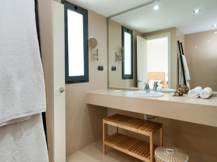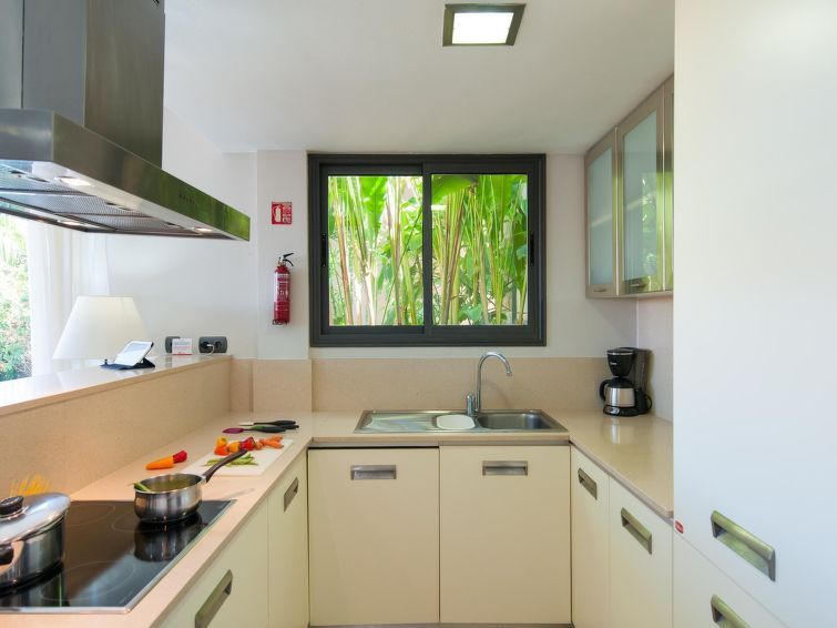 "Tipo 2 dormitorios", 3-room house 85 m2 on 2 levels. Modern and luxurious furnishings: living/dining room with dining table, satellite TV, cable TV, digital TV, DVD and air conditioning. Exit to the patio, to the swimming pool. 1 room with shower/WC and air conditioning. Open kitchen (oven, dishwasher, 4 ceramic glass hob hotplates, toaster, kettle, microwave, freezer, electric coffee machine).