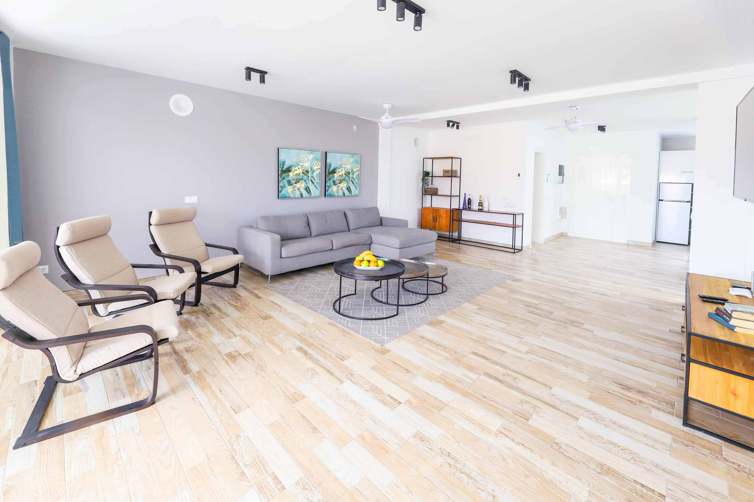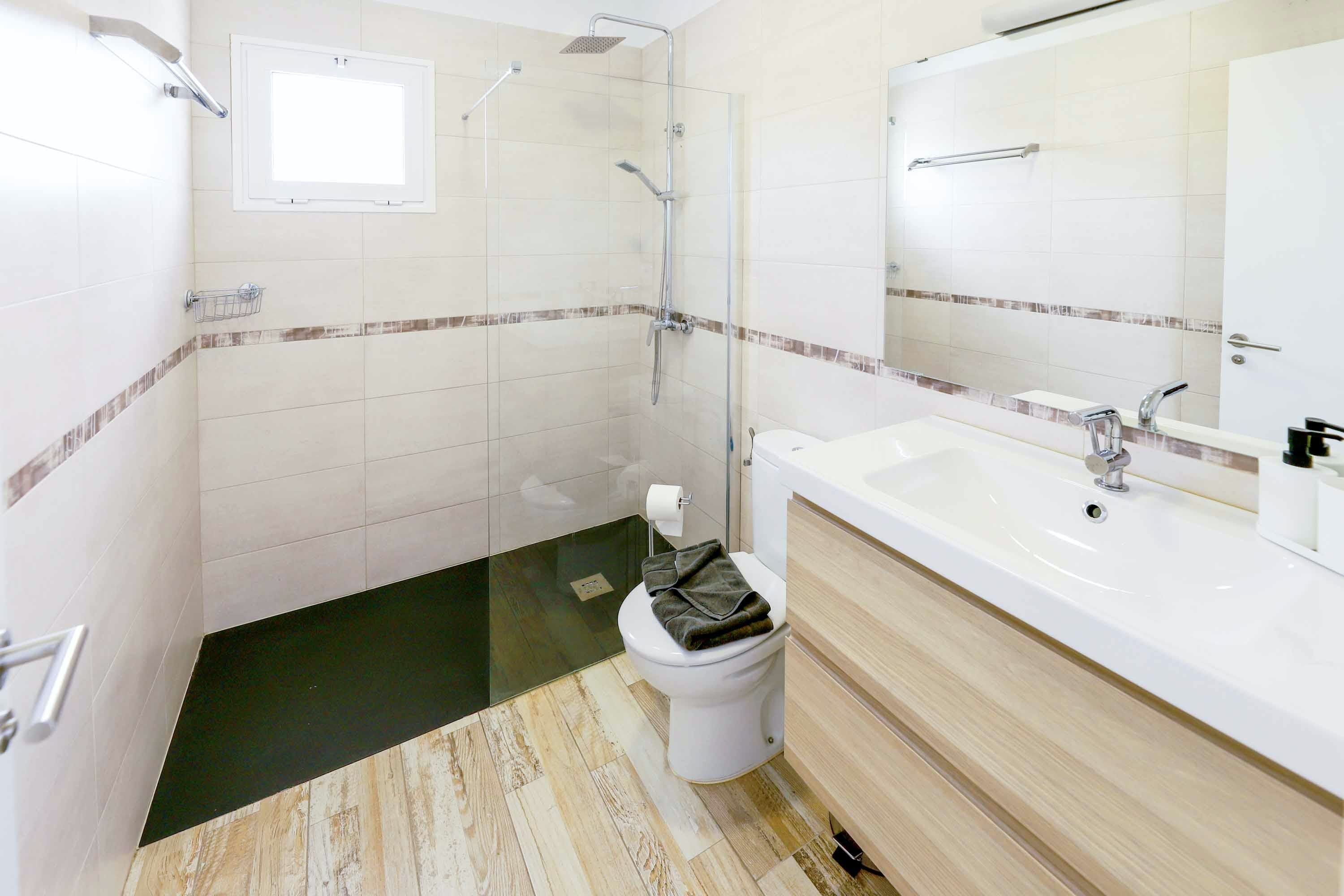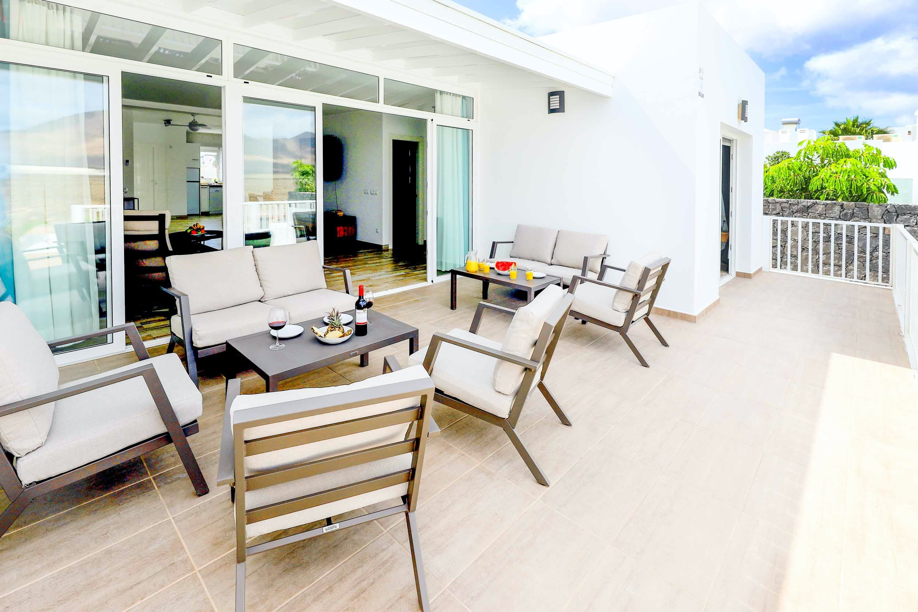 Inside the villa is split into two levels. Patio doors lead from the terrace to the lower ground floor where we find two ensuite bedrooms, one double and one twin. There's also a lounge area and a small kitchenette. With its own living quarters, this property is ideal for those traveling together who want a little extra space. Internal and external stairs lead up to the ground floor, where we find the remaining two bedrooms, another double and twin room with access to a separate shower room. There's a further living room and a full kitchen on this level, as well as indoor dining facilities. As an added bonus, this villa also has an upper terrace that leads off the ground floor and overlooks the pool area."