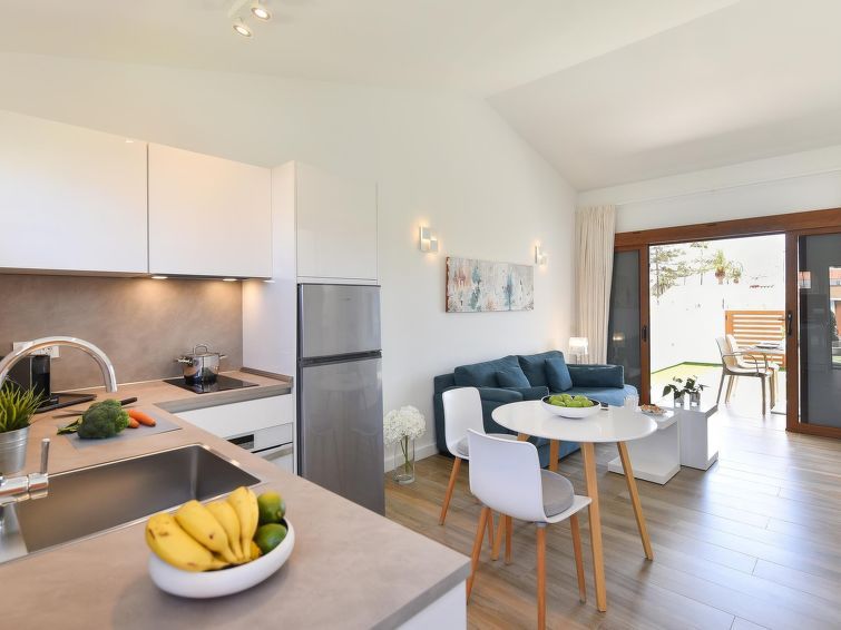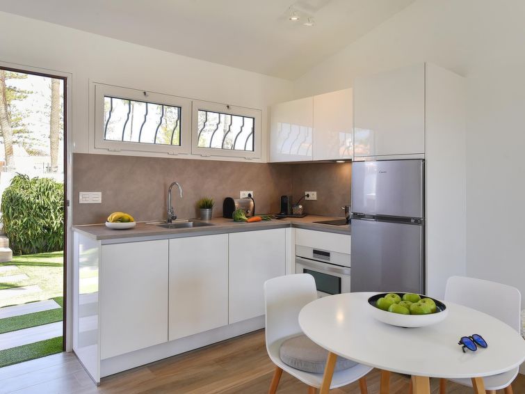 "Santa Barbara", 3-room house 75 m2. Simple and modern furnishings: living/dining room with satellite TV, digital TV, DVD and air conditioning. Exit to the garden. 1 room with 1 french bed and air conditioning. 1 room with 2 beds and air conditioning. Open kitchen (oven, dishwasher, 3 ceramic glass hob hotplates, toaster, kettle, microwave, freezer, grill, electric coffee machine).