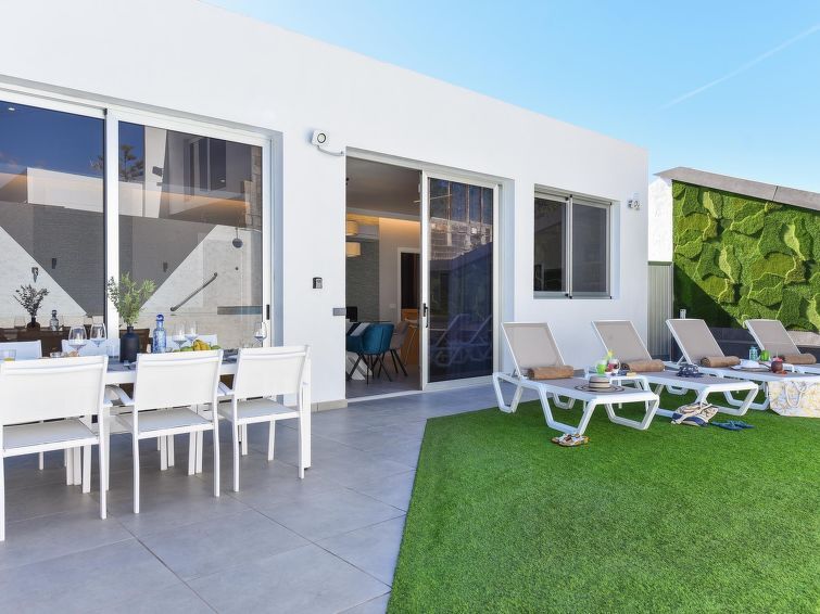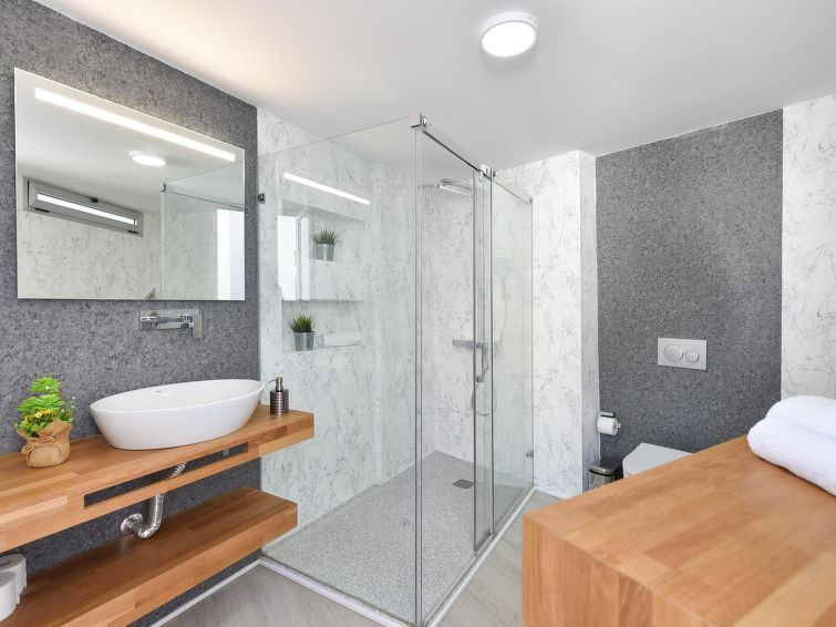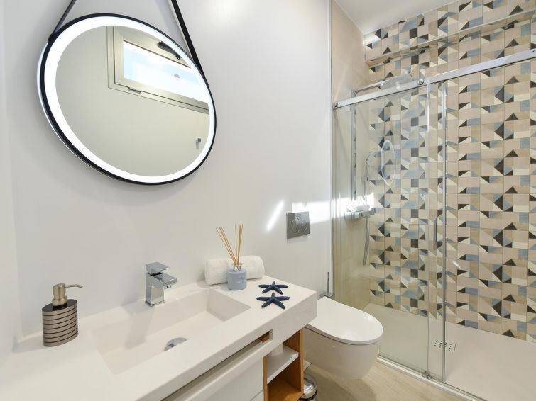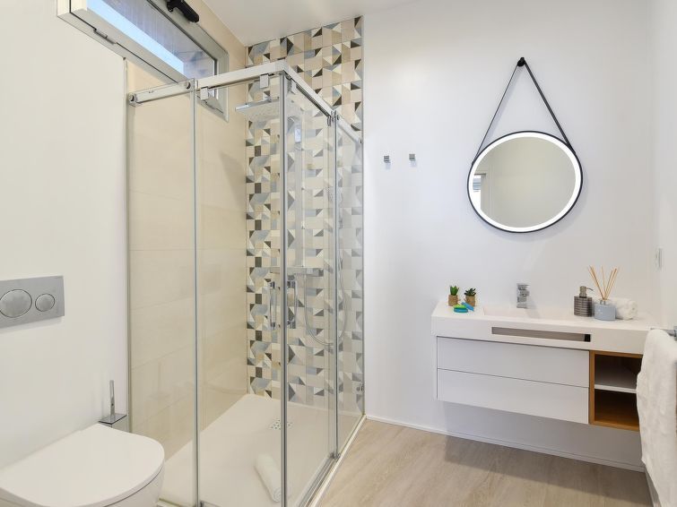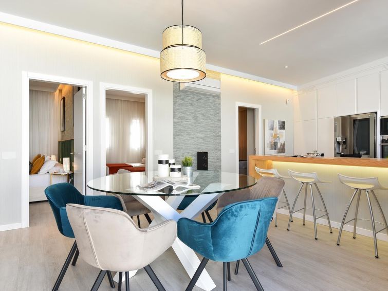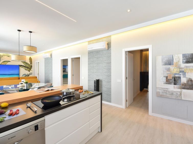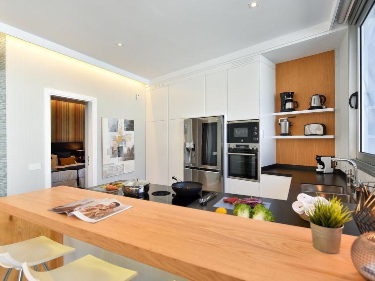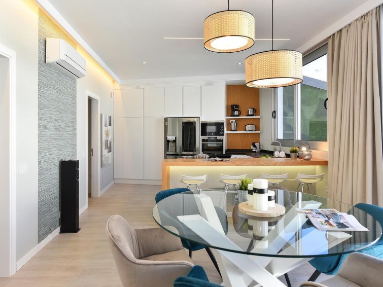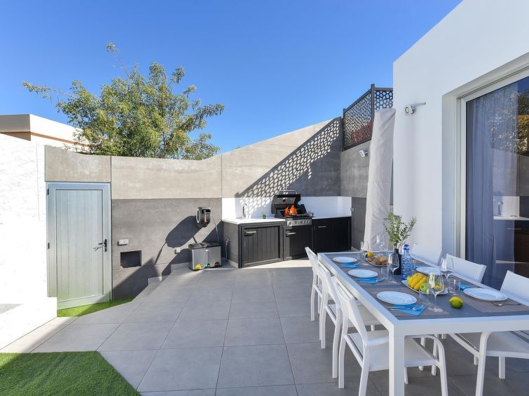 "Villa Joviano", 4-room house 150 m2. Comfortable and modern furnishings: living/dining room with dining table, digital TV and air conditioning. Exit to the patio. 1 room with 1 french bed, shower/WC and air conditioning. 2 rooms, each room with 2 beds and air conditioning. Kitchen (oven, dishwasher, 3 ceramic glass hob hotplates, toaster, kettle, microwave, freezer, electric coffee machine) with dining nook.