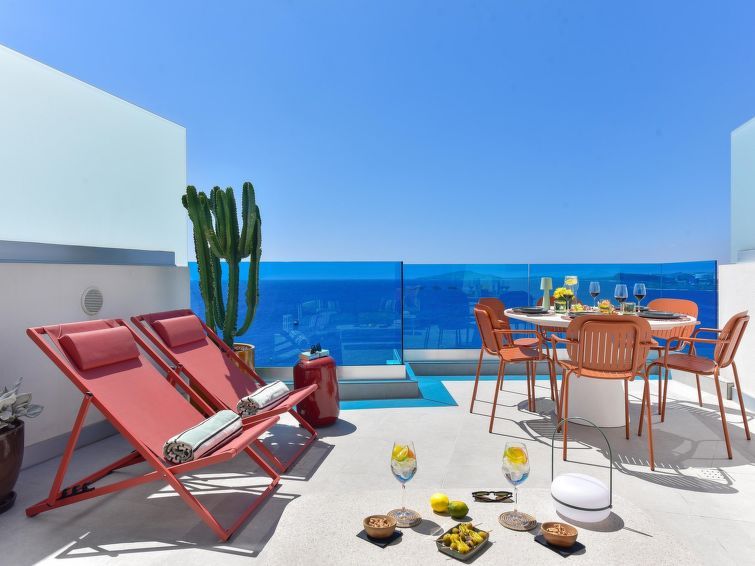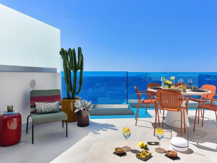 "Neptuno Suite Playa", 3-room apartment. Object suitable for 4 adults. Very simple and cosy furnishings: living room with TV, flat screen and air conditioning. Exit to the terrace. 2 rooms, each room with 1 french bed (150 cm, length 200 cm). Open kitchen (oven, dishwasher, 4 ceramic glass hob hotplates, toaster, kettle, microwave, freezer, electric coffee machine).