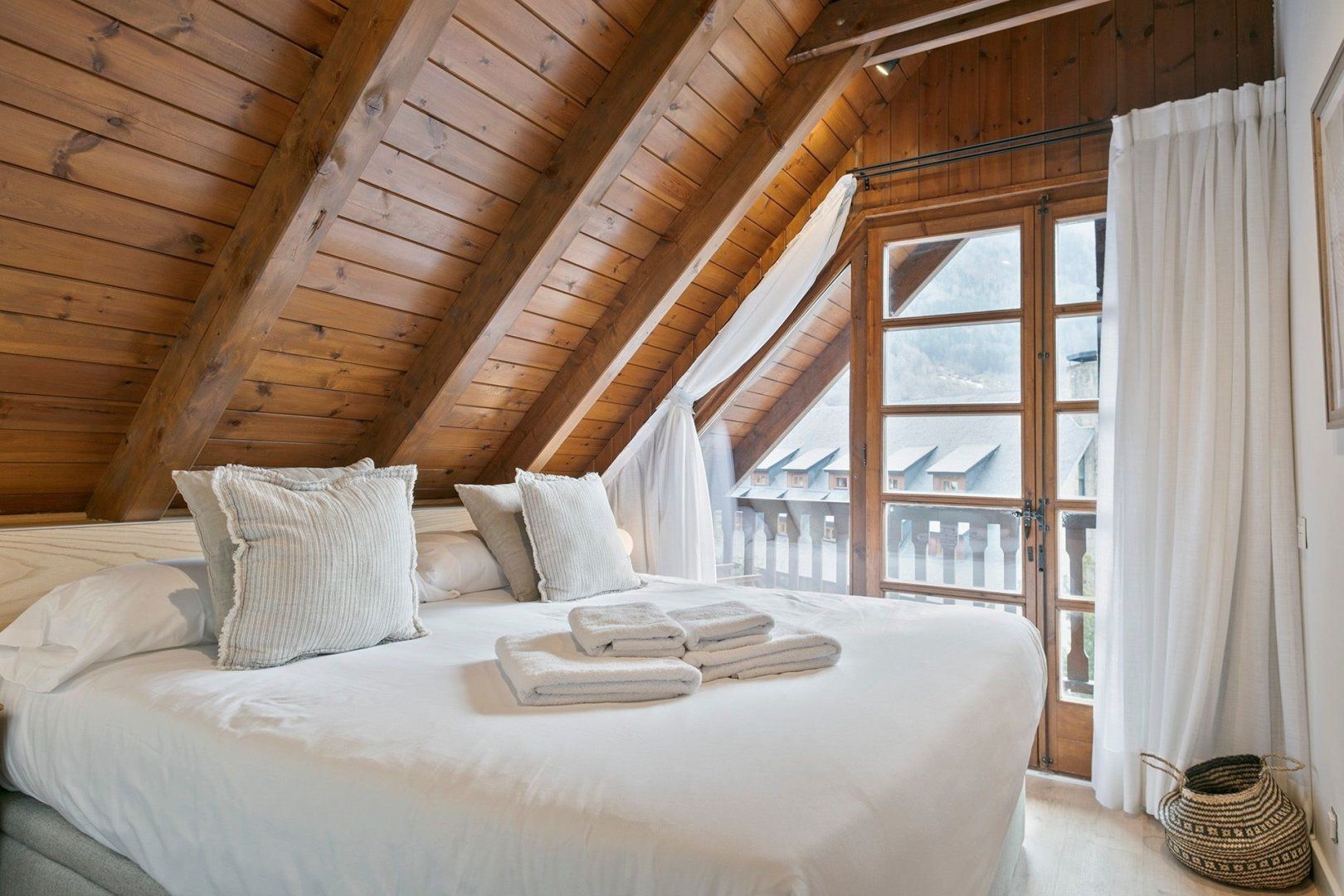 Located in Arties, an epicentre of the Naut Aran activity and aprés-ski. We love the pale tones throughout and the wood elements that add to the homely feel, tempting you to cosy up around the fireplace in the wintertime, but ultimately, we imagine you'll spend a lot of time relaxing on the balcony with your cup of coffee and croissant for a lovely start to the day, admiring the views over the church of Santa Mara and Montarto in the background.