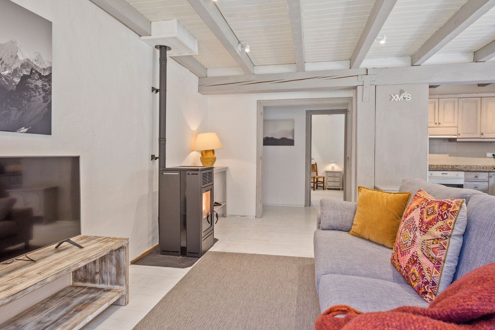 During the frostier times of year, head inside to the charming living area and get cosy in front of the pellet fireplace. White-washed beams, black-and-white artwork and clean-lined furniture give the place a distinctly Scandinavian feel – it's a modern take on cabin chic and we can't help but love it. You can easily rustle up hearty meals in the kitchen for dinner – and you'll never miss a beat while doing so, thanks to the open-plan layout.
