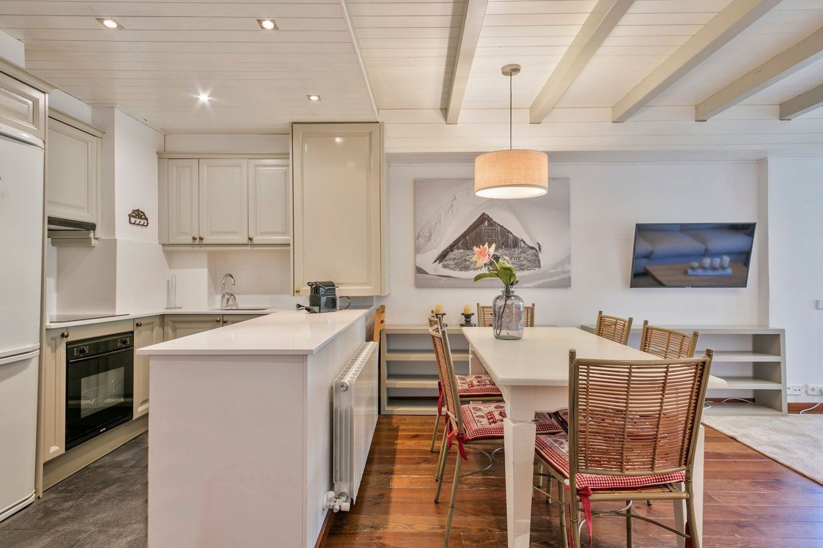 Arrive at your home to be greeted by a stylish and light-filled living room, featuring a generous, plush sofa, inviting you to kick back and relax after a long day of mountain adventures. Enjoy cosy movie nights with your loved ones and gather everyone for scrumptious suppers at the dinner table – rustling up quick and delicious meals will be a breeze thanks to the well-equipped kitchen. You can also step out onto the balcony with a glass of wine and contemplate the stunning panorama before you.