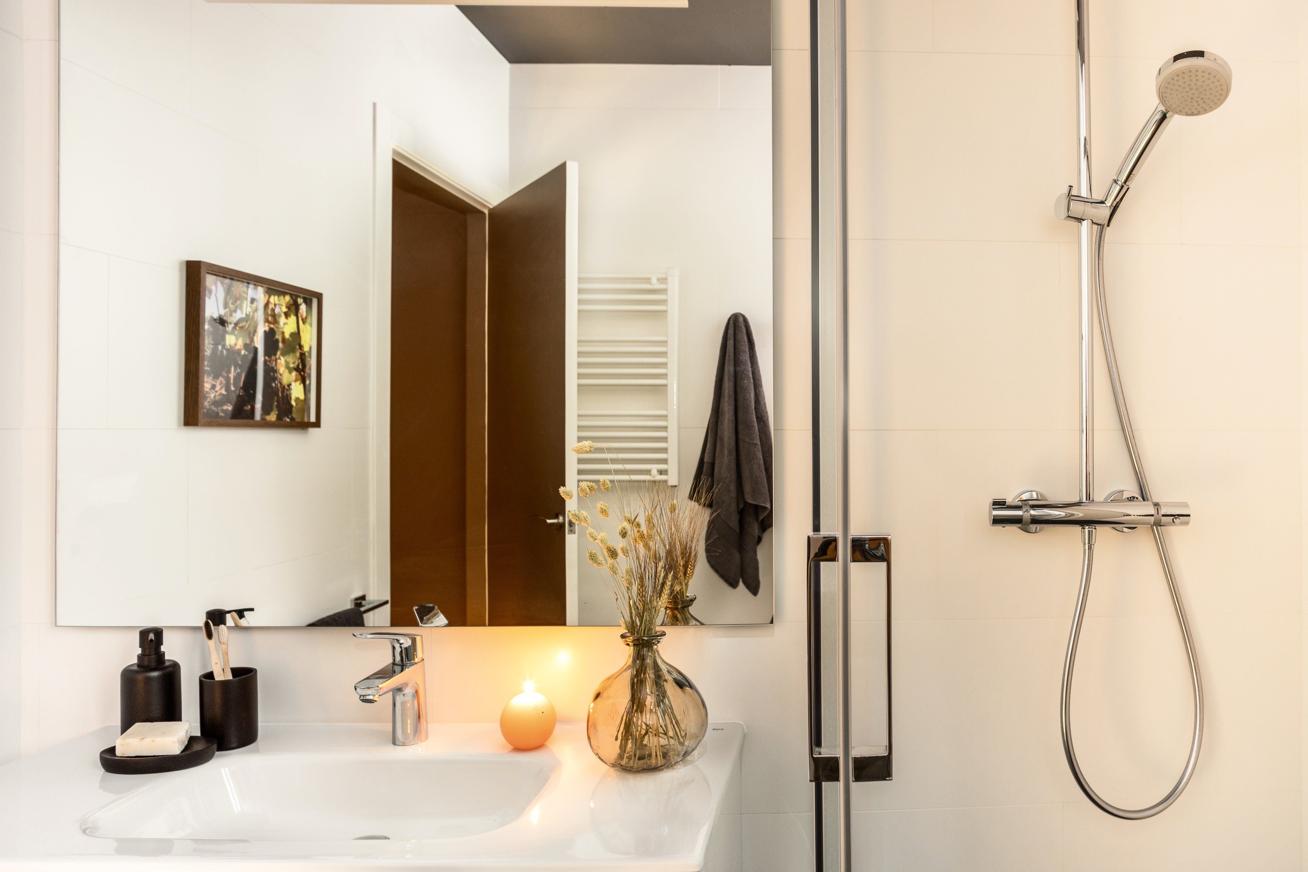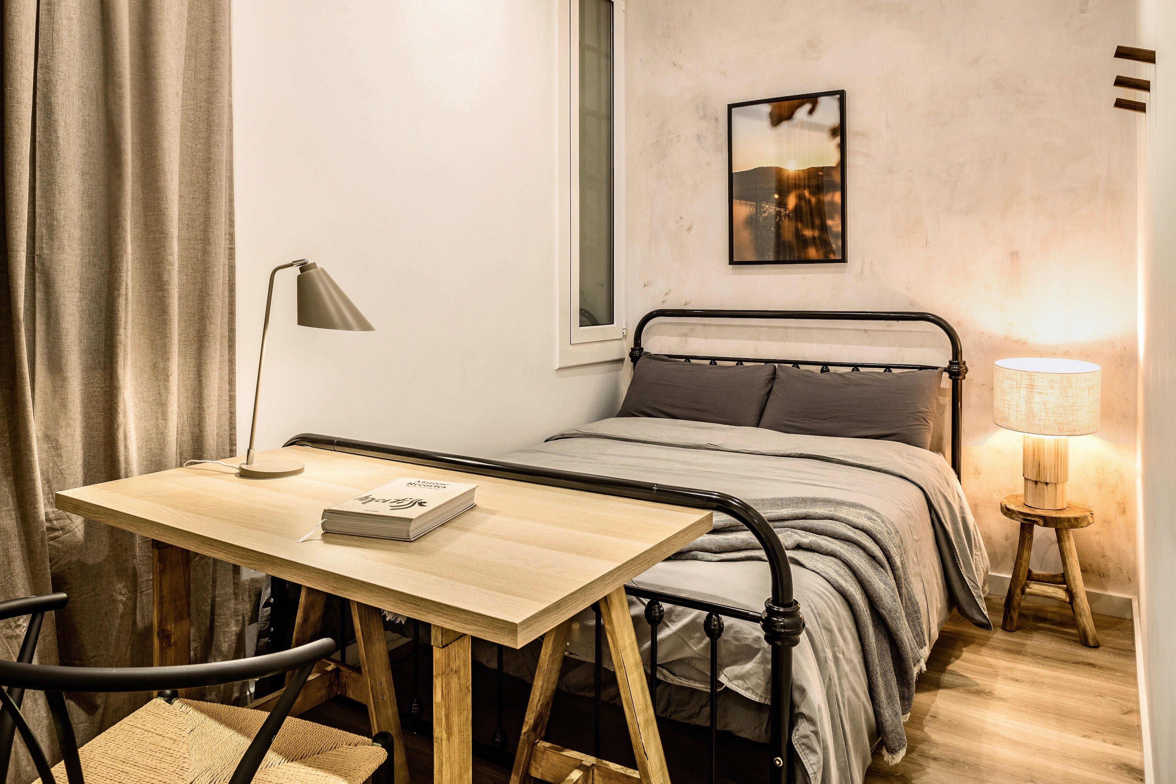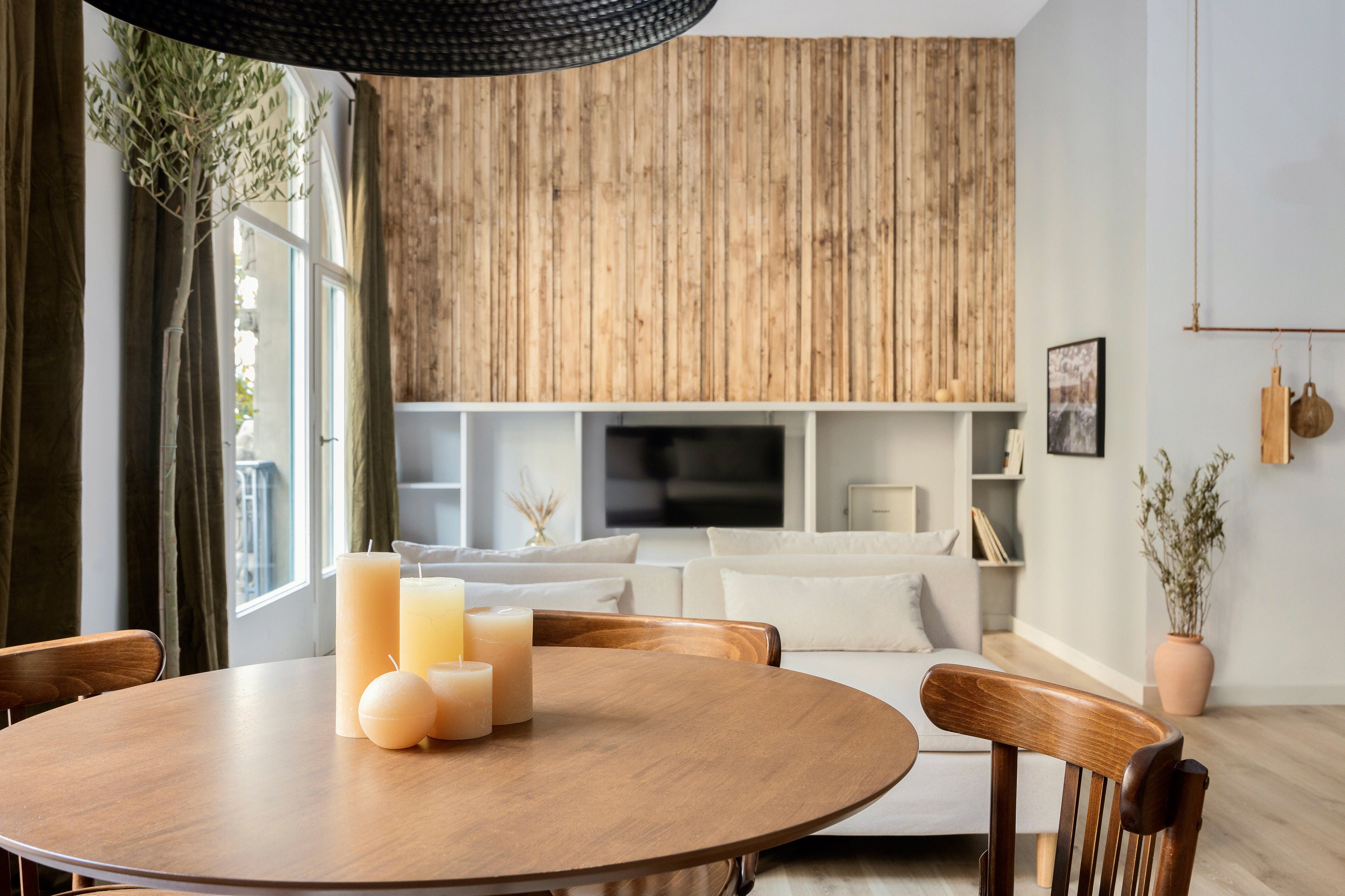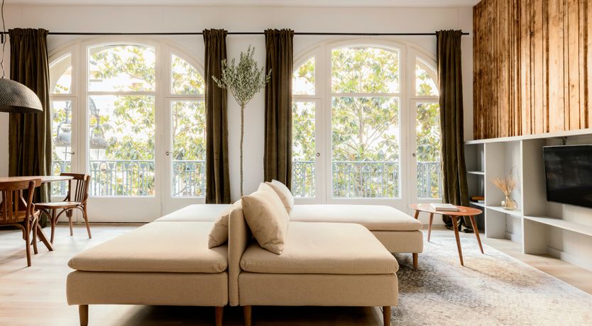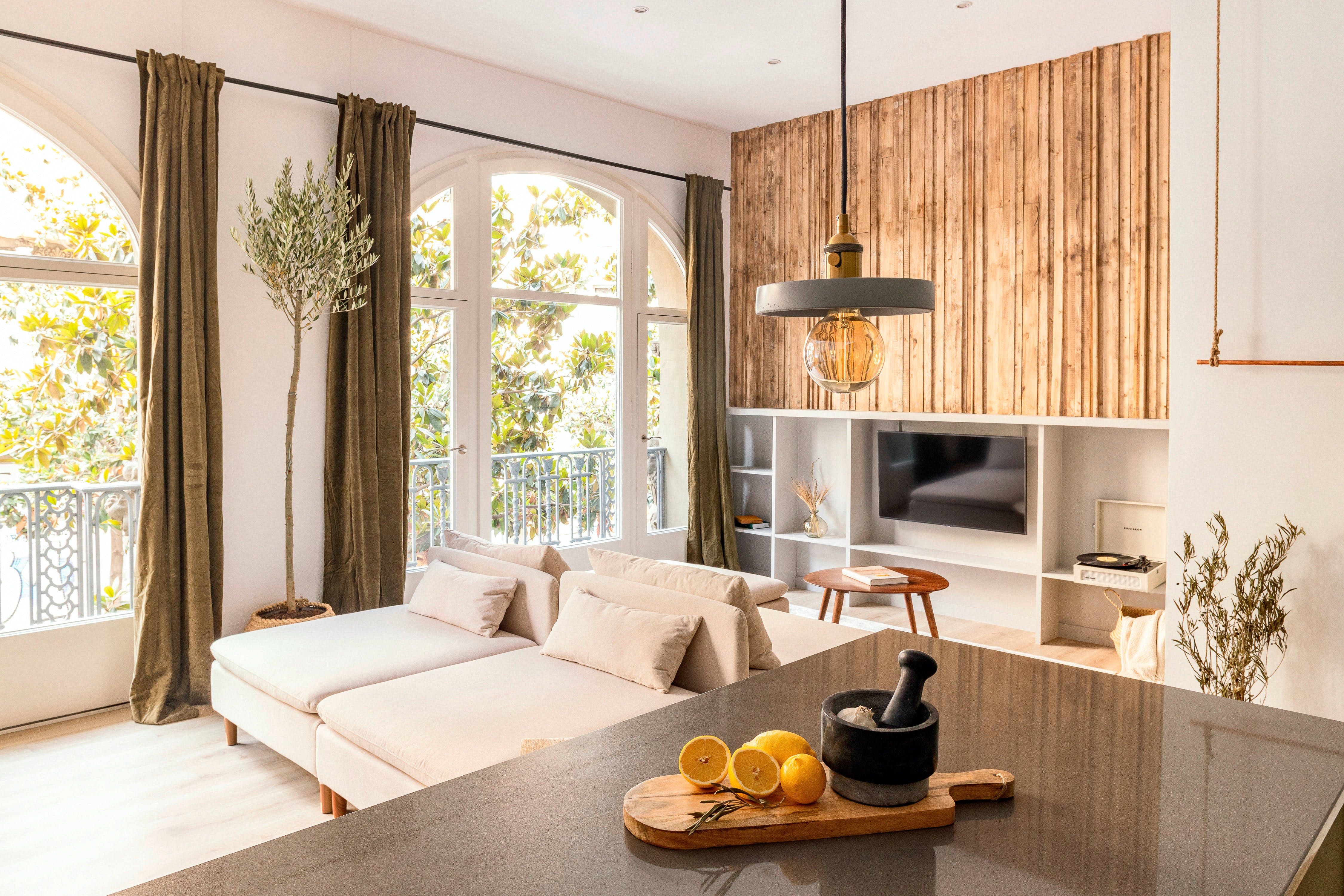 Located on one of the main veins of Gràcia’s network of elegant streets, this apartment has every reason to be so tasteful. While this vibrant barrio is awash with boutiques, restaurants, and bars, you’re sure to find serenity in this home. Right from the offset, there’s a natural and organic feel from the striking, handmade, wooden feature wall in the living space. Accompanied by an olive-green colour scheme, fresh plants, and tree-lined views coming in from the huge windows, the apartment feels incredibly earthy and relaxed. While there are modern accents such as industrial-style hanging lamps, and sleek stools at the breakfast bar, the vintage touches reign supreme. We love the old-school cool vibe from the record player, along with wicker baskets, woven throws, and an antique-style dining set. This effortless balance of modern elegance and traditional comfort is what makes it special. We can’t think of anything better than perching on the ornate, wrought-iron balcony and sipping wine as the sun sets over Gràcia. Unless of course you’re a Gaudí fan, in which case an easy twelve-minute stroll to Casa Milà will make your day.