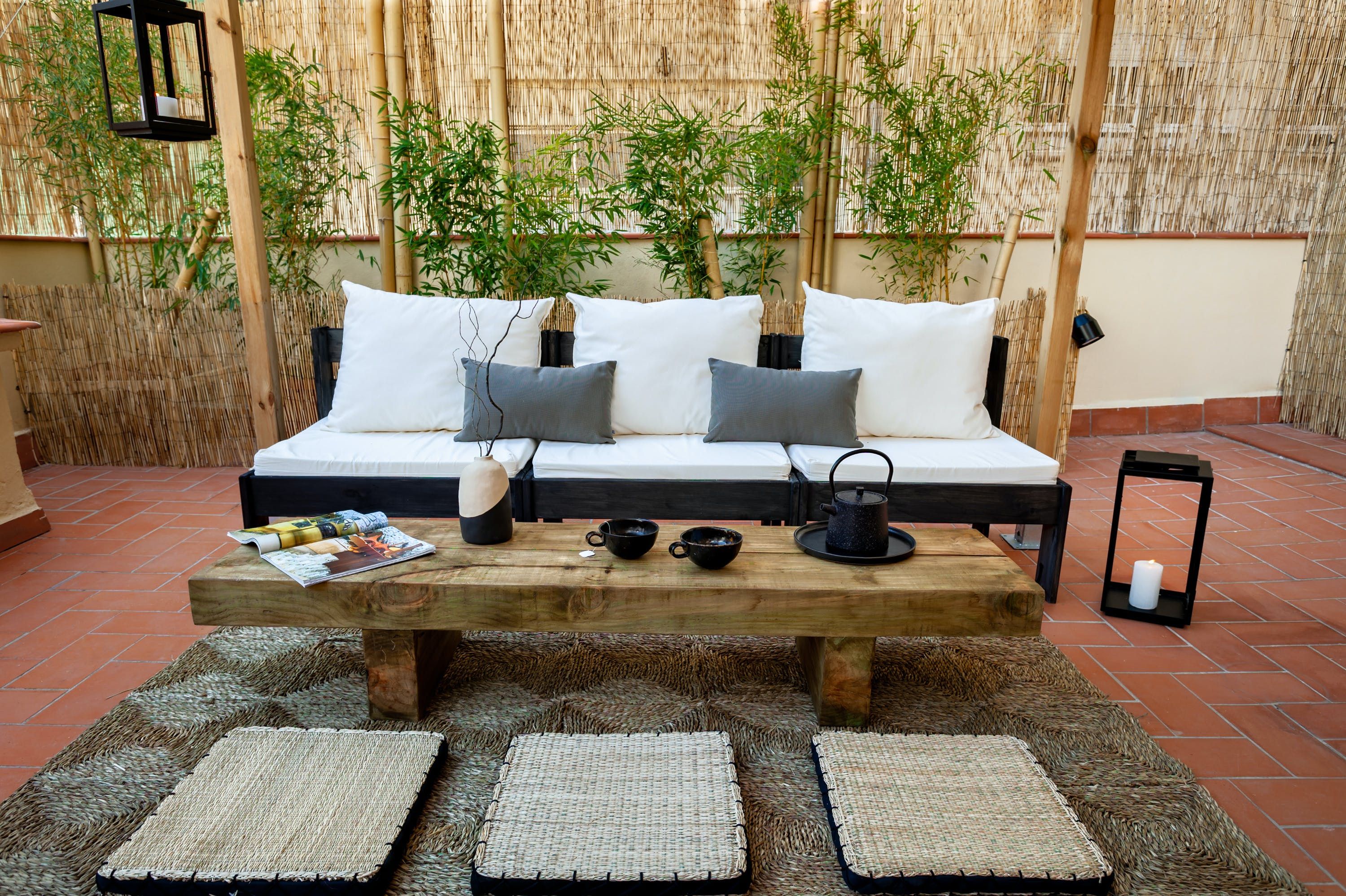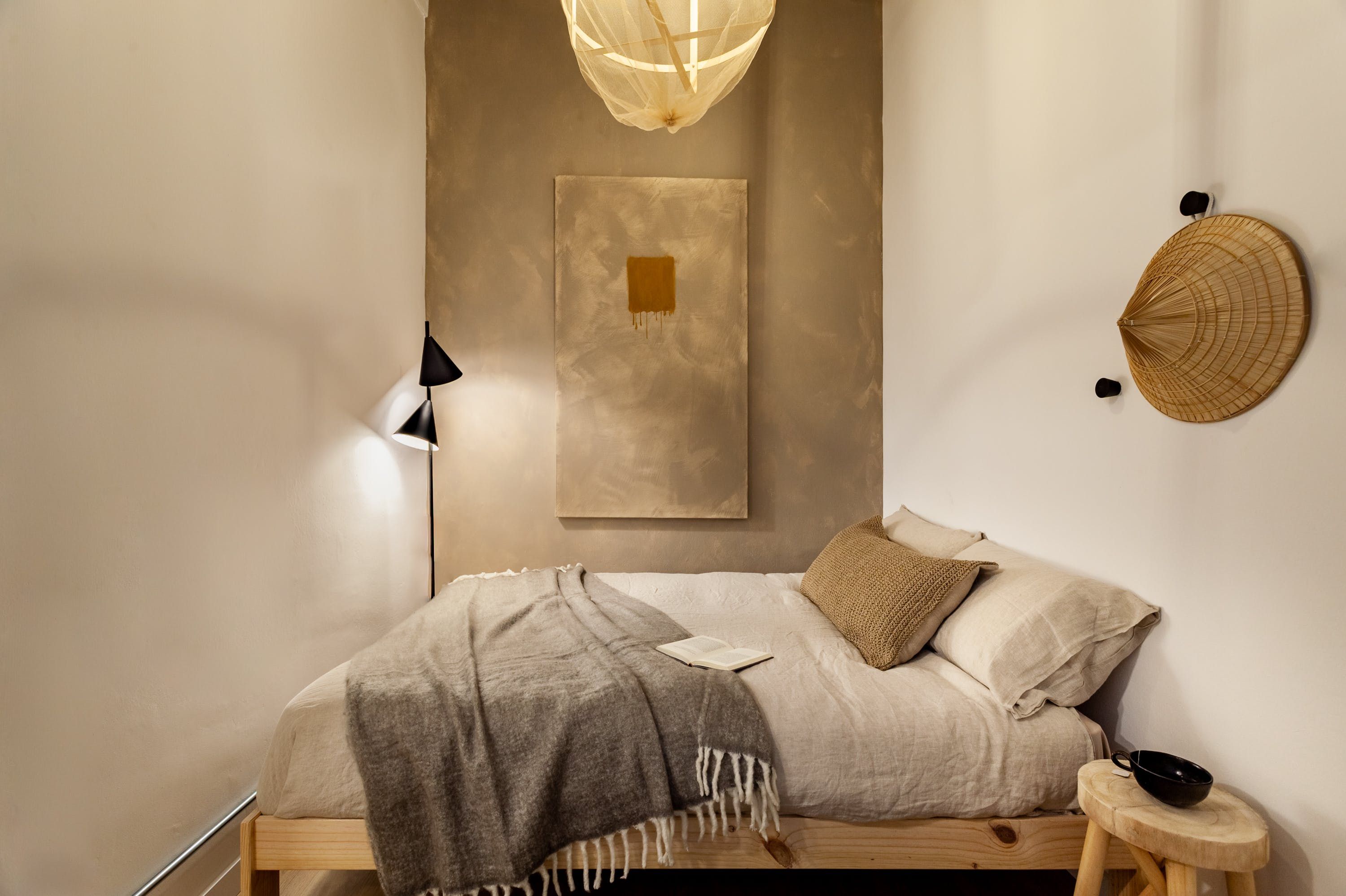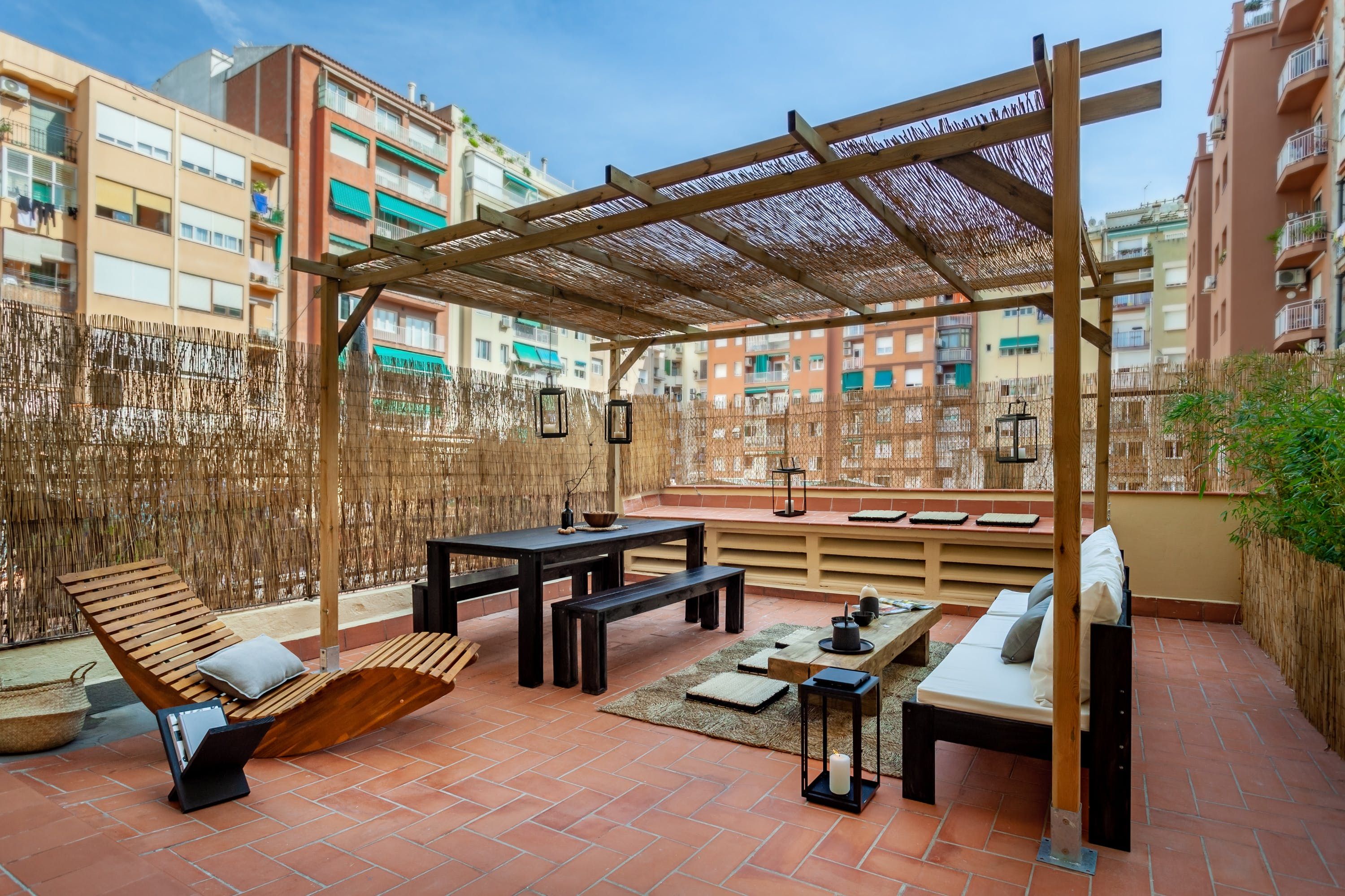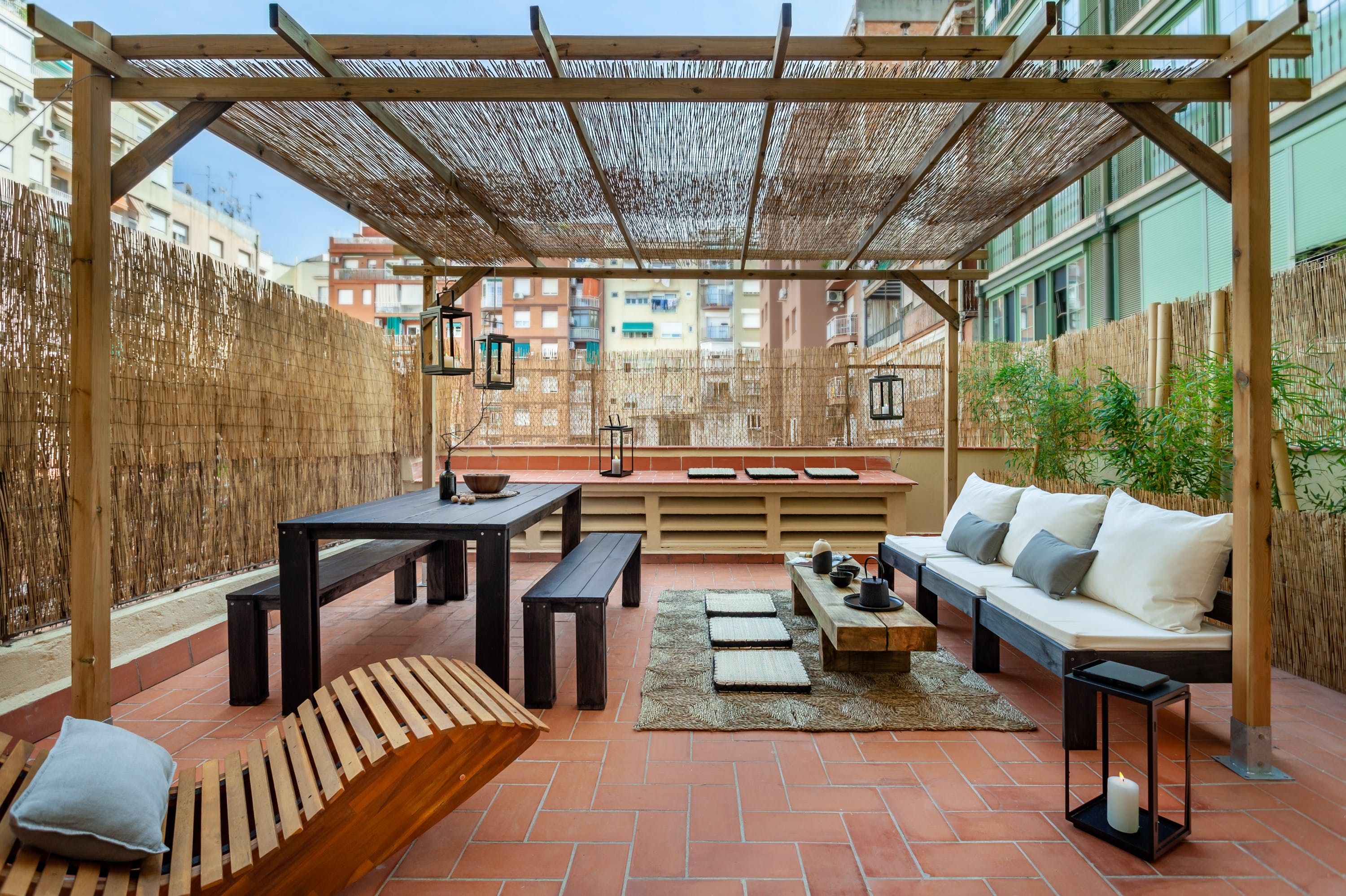 There's nothing average about this stylish apartment, just a fifteen-minute walk from the Sagrada Familia and aimed at longer stays. Set in a traditional period building, it's got all the character features you could hope for – the high, vaulted ceilings and tall French doors – along with a stunning terrace that adds valuable outdoor living space. And what a space it is. Typically backing onto other buildings, it's been cleverly screened with bamboo for privacy. And, like the rest of the apartment, there's a distinctly Japanese feel to the decor here. The host has taken calming elements of feng shui and created an outdoor lounge complete with dining table, sofa area and sun lounger – all underneath a timber pergola. Step inside the flat and you'll find a comfortable living room, a smart kitchen with everything you'll need, two relaxing bedrooms and a modern bathroom. An extra surprise comes in the form of a separate office – ideal if you're going to be working during your long stay.