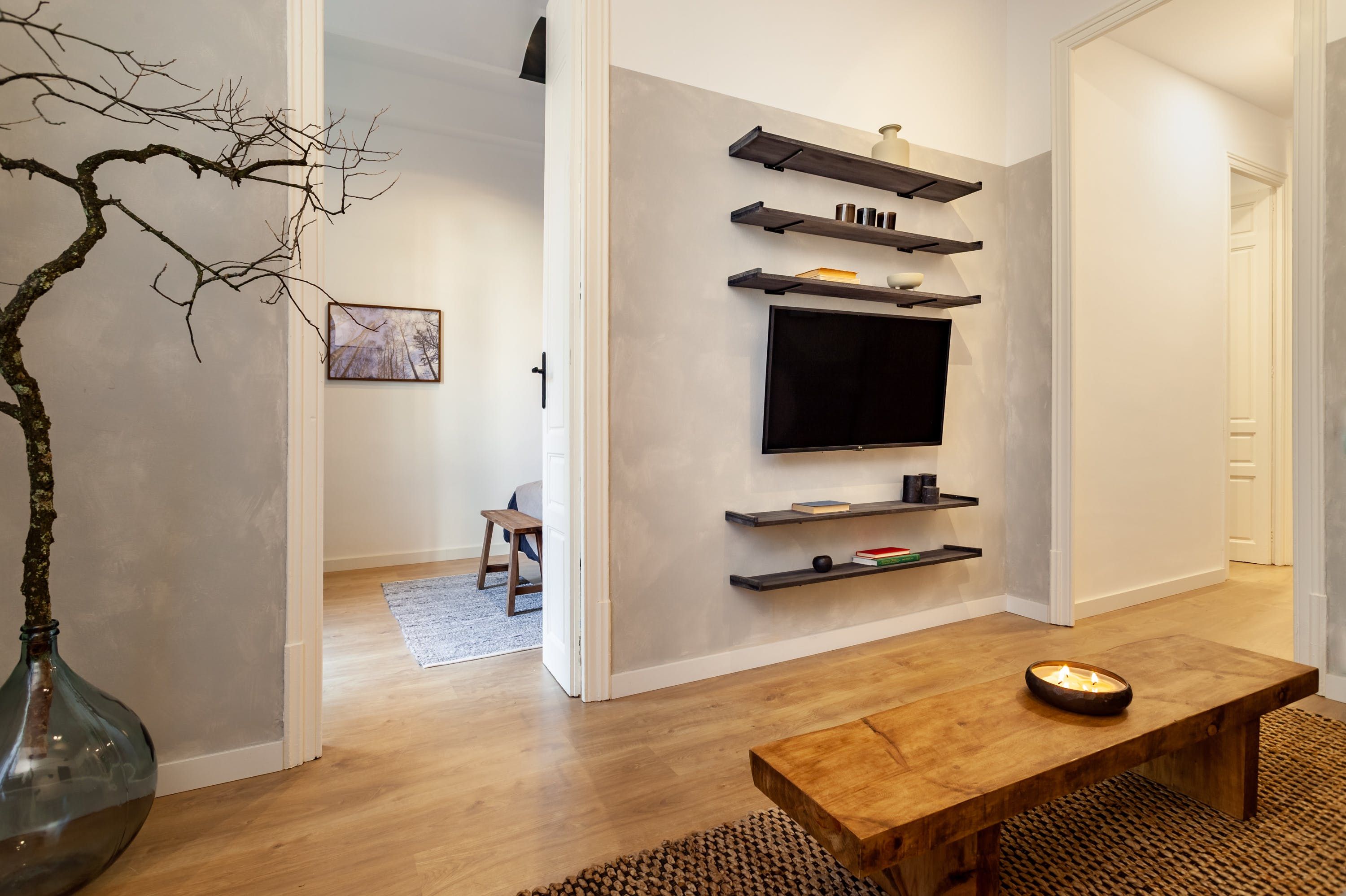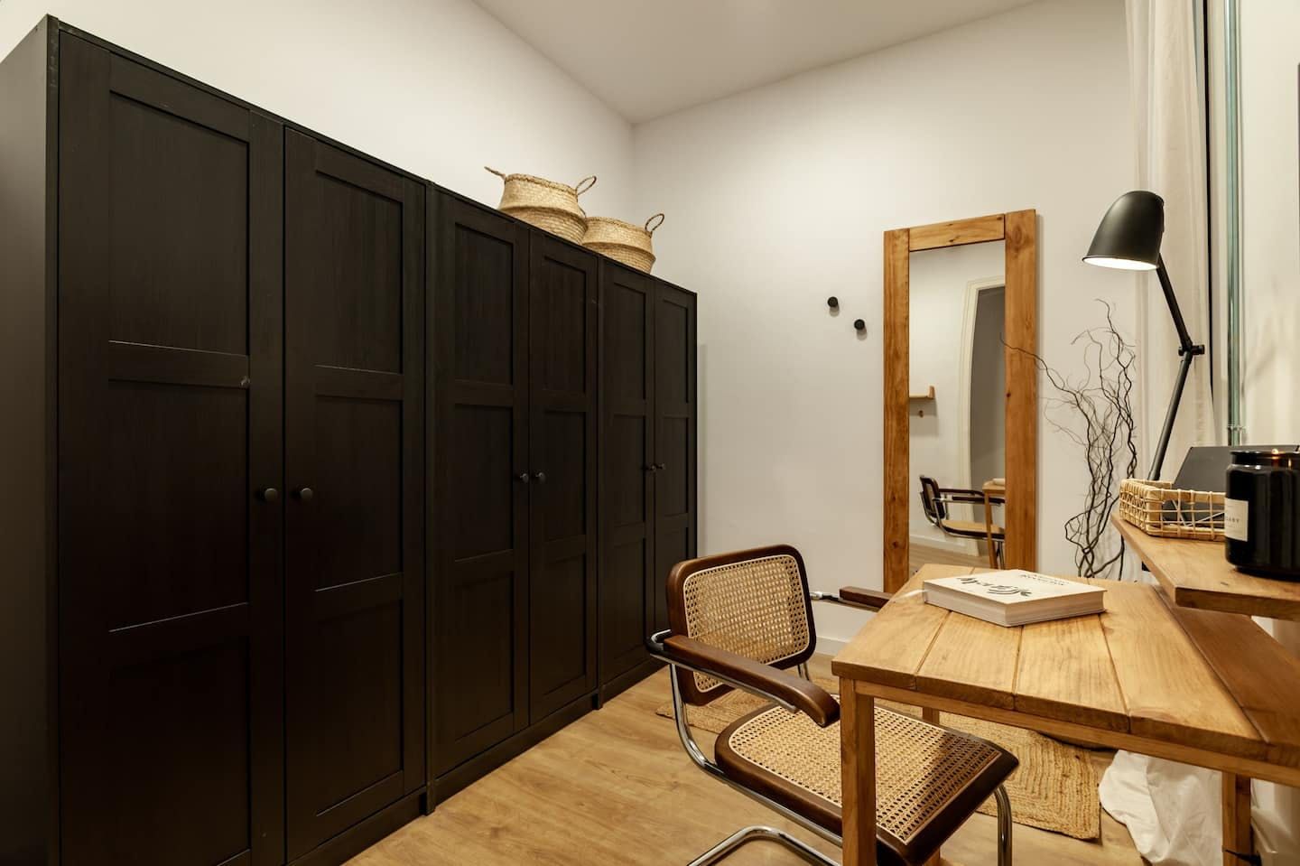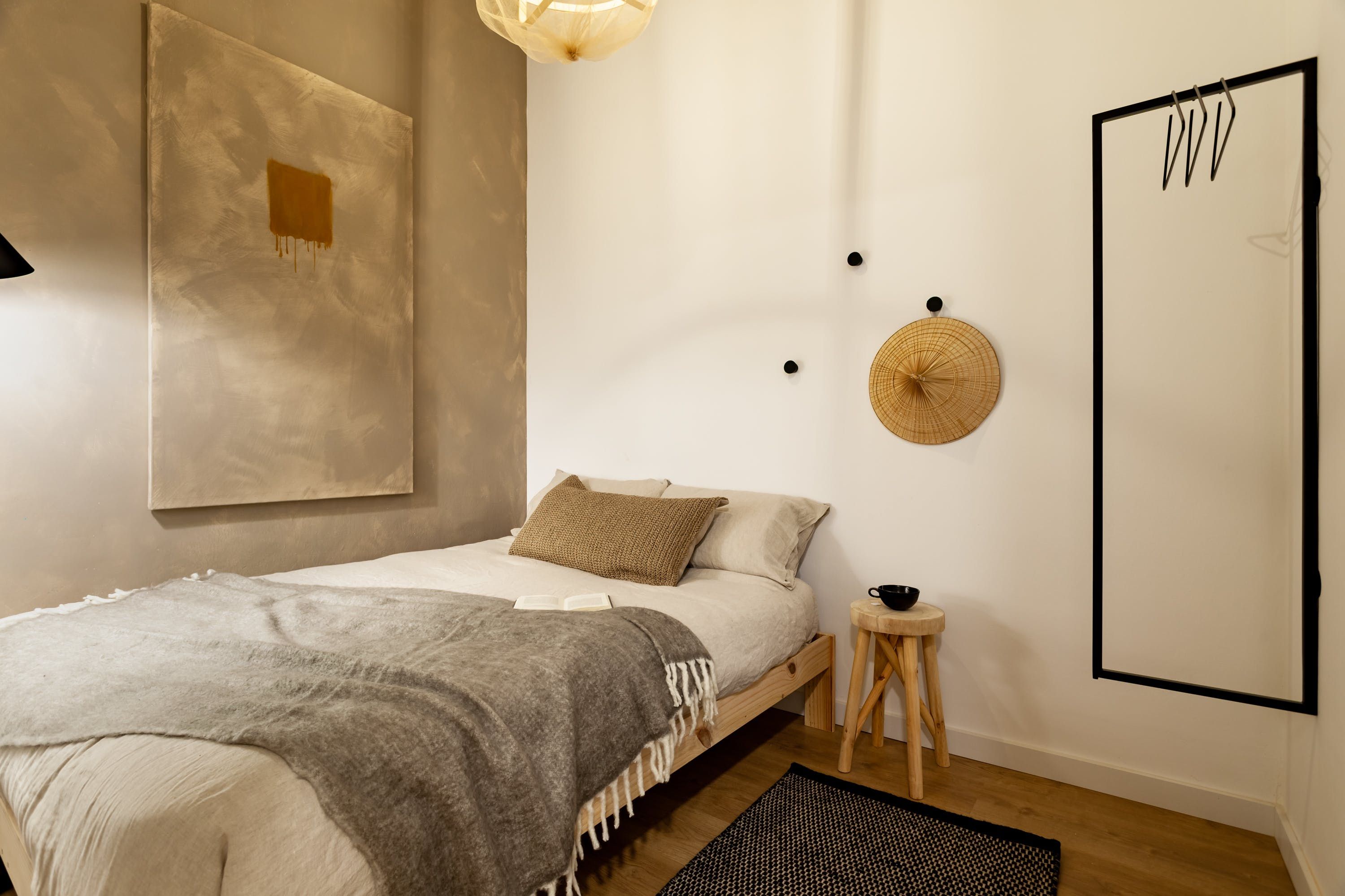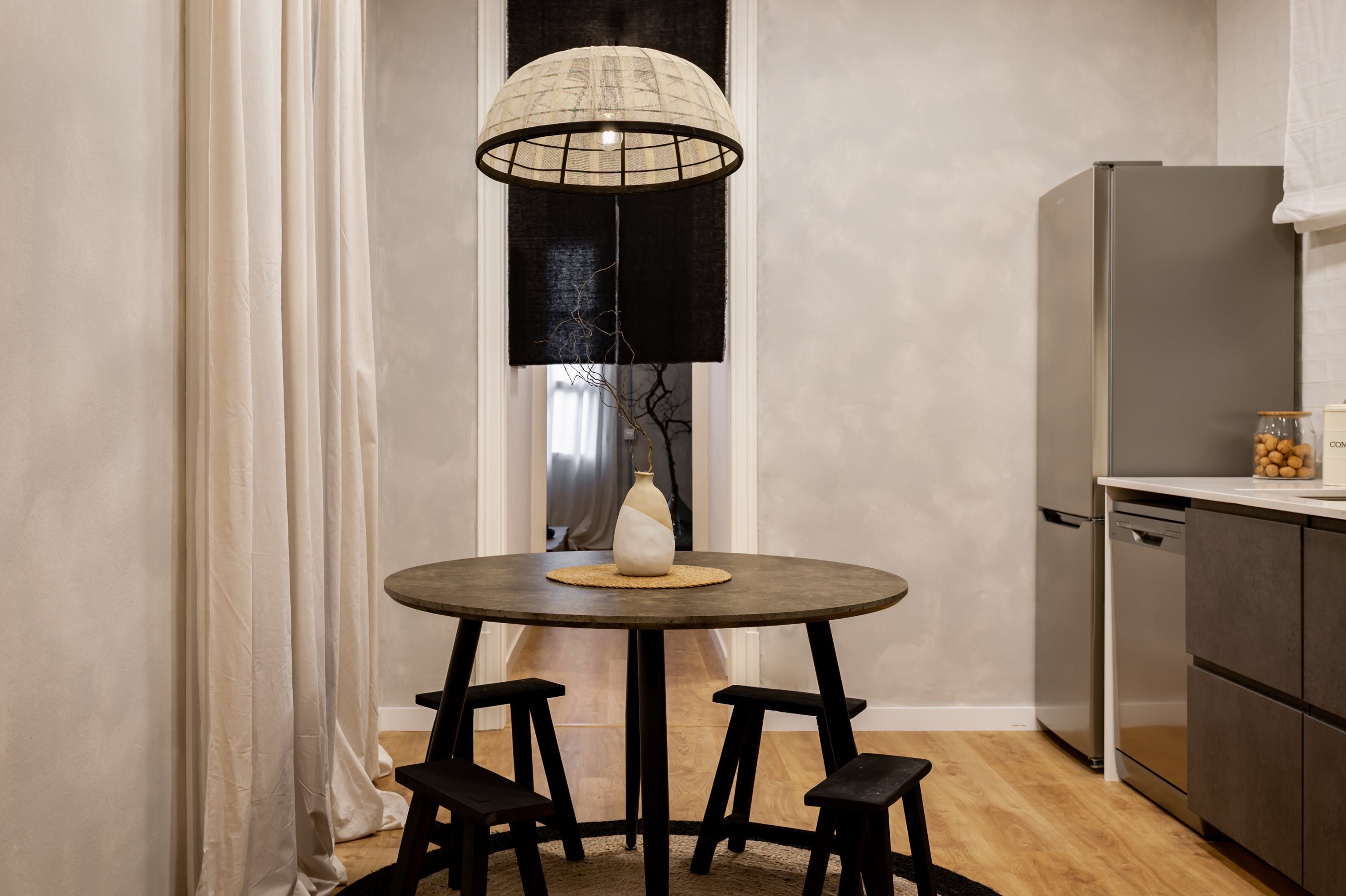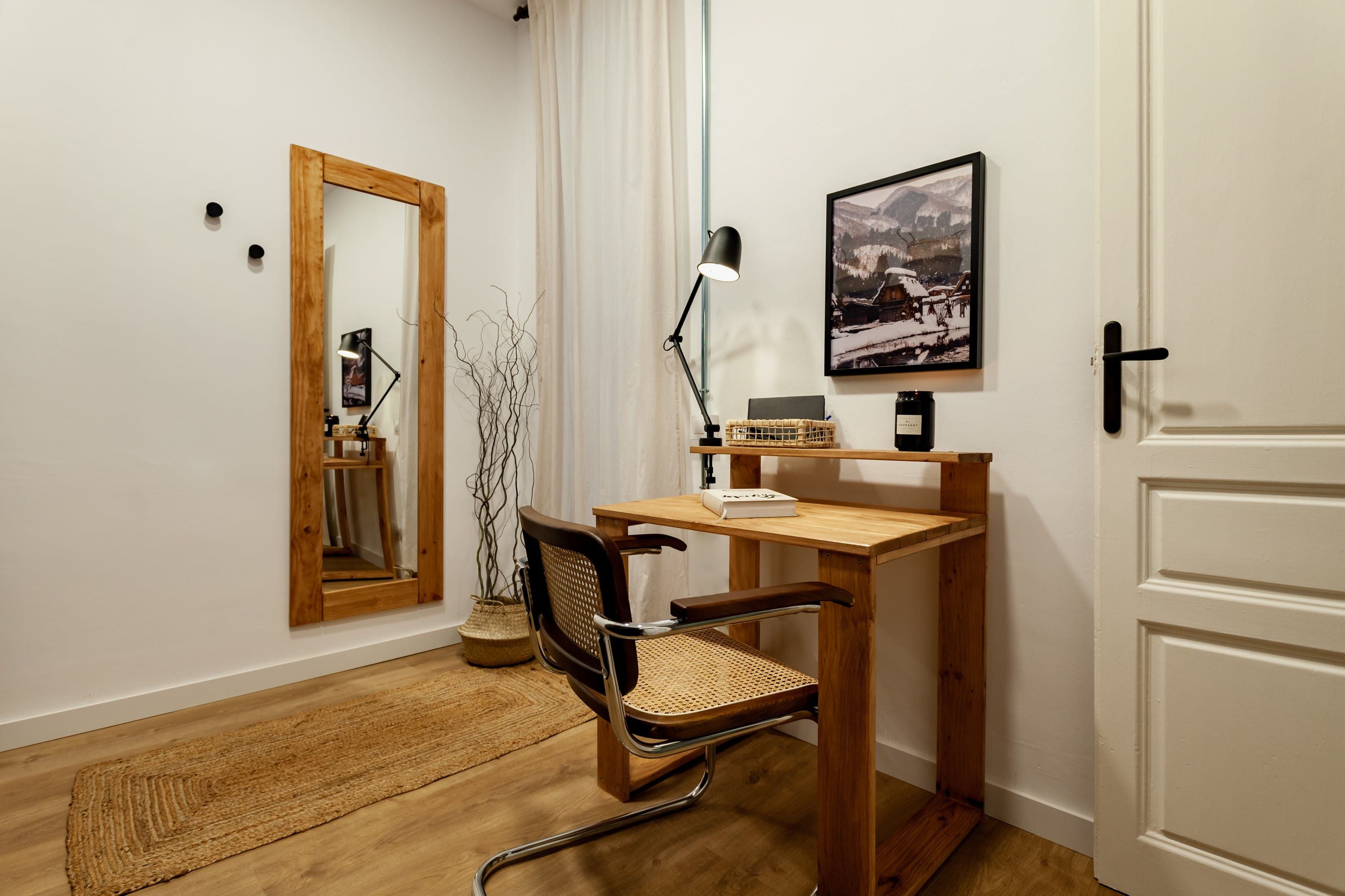 There's nothing average about this stylish apartment, just a fifteen-minute walk from the Sagrada Familia and aimed at longer stays. Set in a traditional period building, it's got all the character features you could hope for – the high, vaulted ceilings and tall French doors – along with a stunning terrace that adds valuable outdoor living space. And what a space it is. Typically backing onto other buildings, it's been cleverly screened with bamboo for privacy. And, like the rest of the apartment, there's a distinctly Japanese feel to the decor here. The host has taken calming elements of feng shui and created an outdoor lounge complete with dining table, sofa area and sun lounger – all underneath a timber pergola. Step inside the flat and you'll find a comfortable living room, a smart kitchen with everything you'll need, two relaxing bedrooms and a modern bathroom. An extra surprise comes in the form of a separate office – ideal if you're going to be working during your long stay.