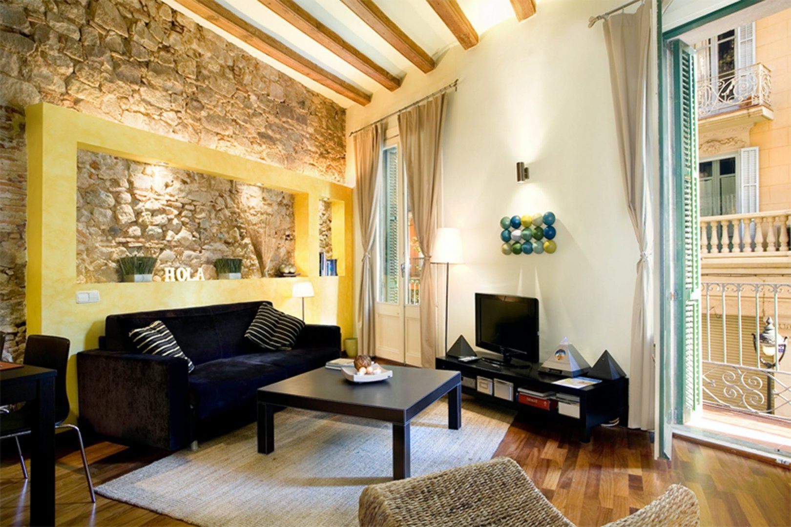 This loft apartment is on the first floor of a renovated old building in the heart of Barcelona's Gothic Quarter. From your doorstep, you can head straight to the cosy tapas bars and pavement cafes that fill the narrow, atmospheric streets. It’s just 50 meters away from the Gothic Church of St. Maria del Mar, the Picasso Museum, the Cathedral, and the port of Barcelona. The apartment retains some history – restored wood ceilings, original stone walls, and parquet flooring. While the kitchen is fully equipped and up-to-date. Two balconies off the living room looking out over the charming street provide a spot for fresh air.