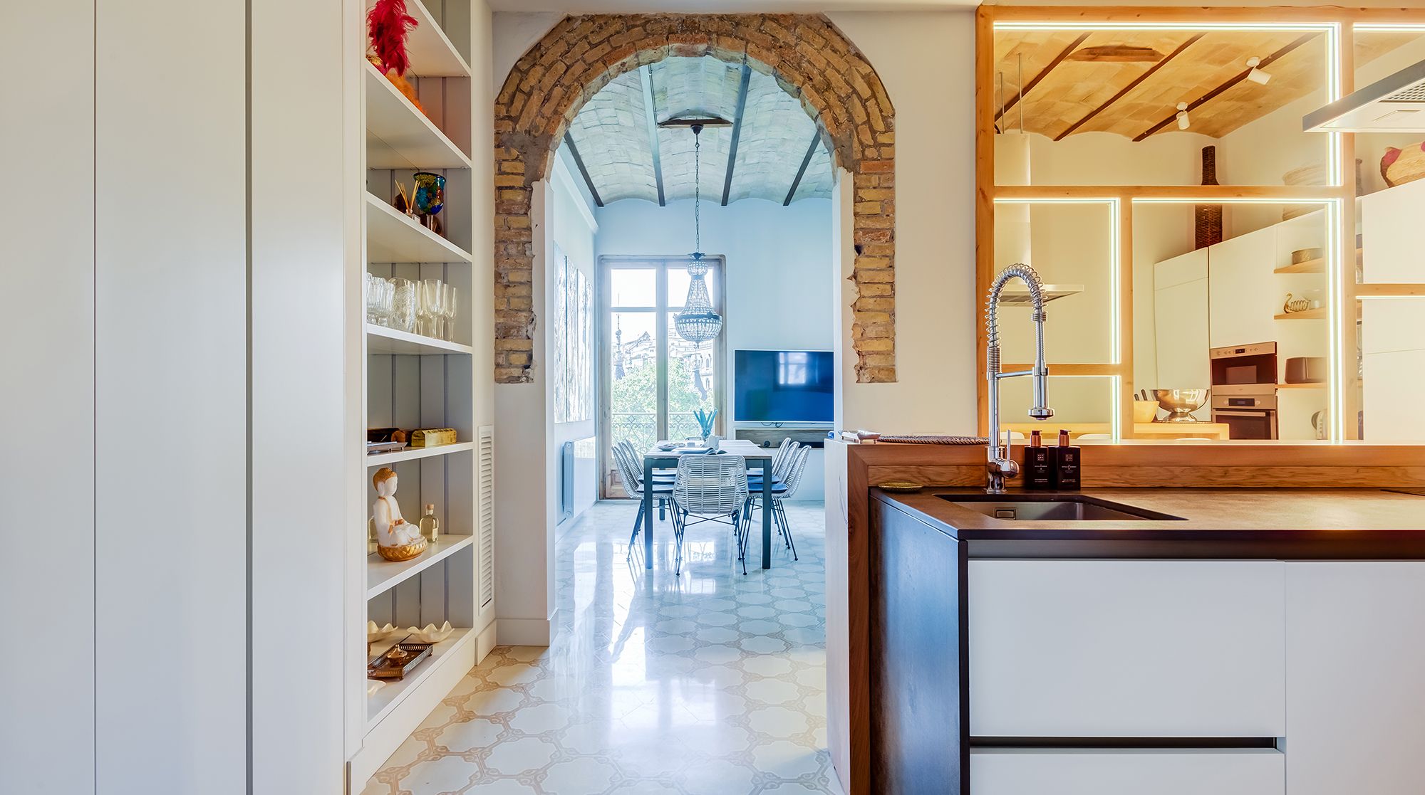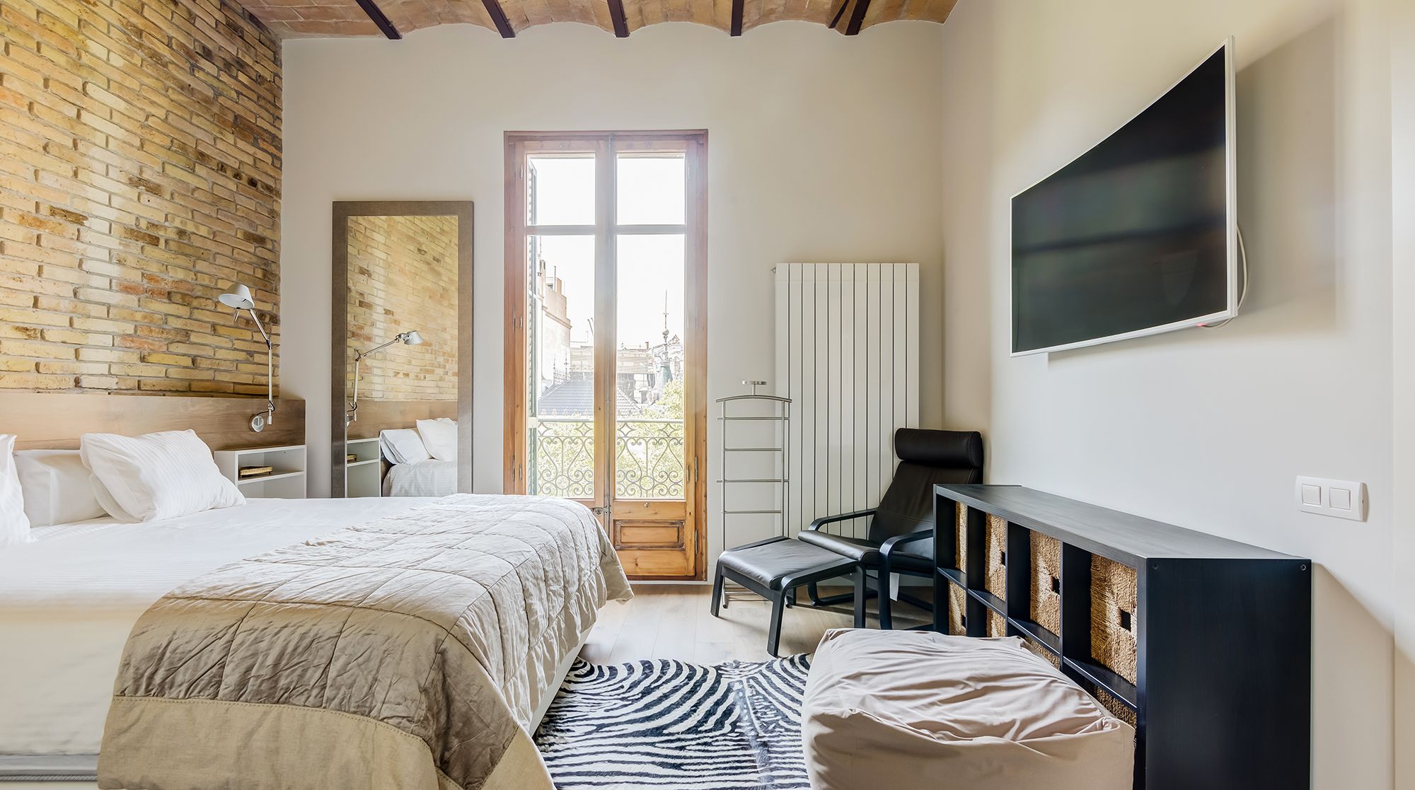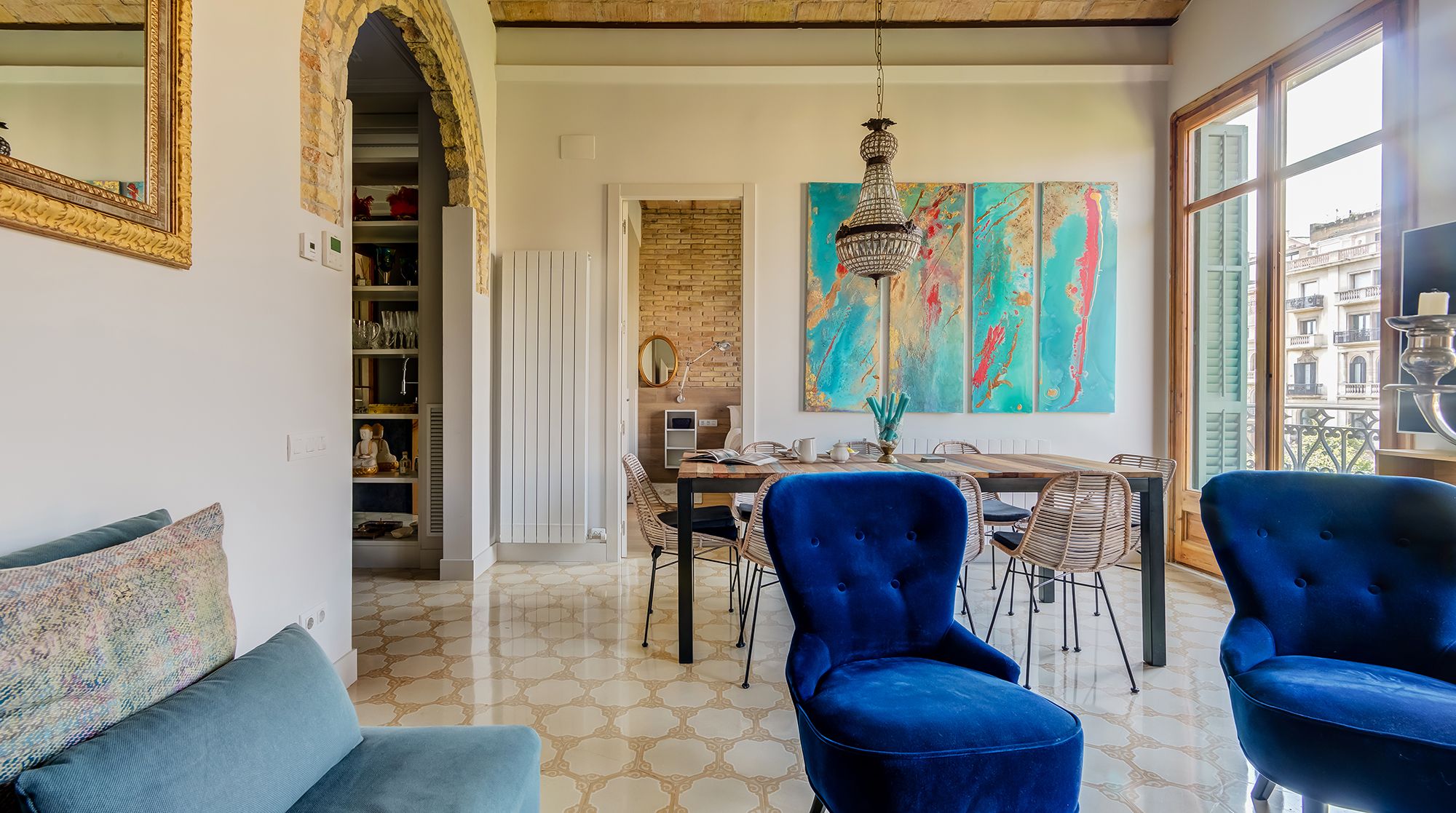 This is an elaborate, luxurious home that feels like an urban palace. Situated right in Avinguda Diagonal, the city's widest and most important avenue, Carmilla is only minutes away from La Pedrera, Casa Batlló, and the many wonderful restaurants of Eixample. With the gorgeous exposed brick walls and traditional arches separating the living room from the kitchen, this home deserves special praise for the well these features have been incorporated with modern elements.
