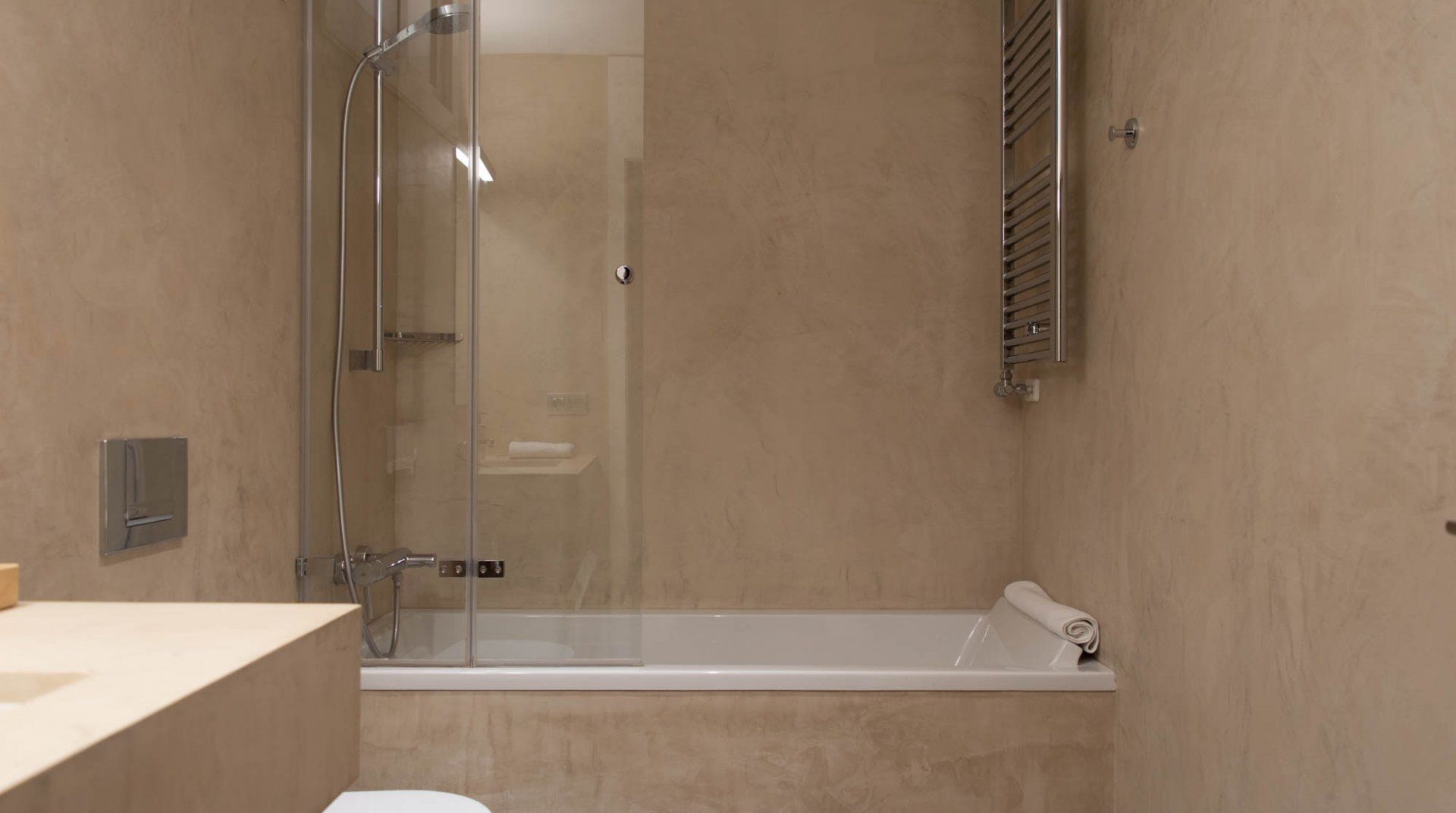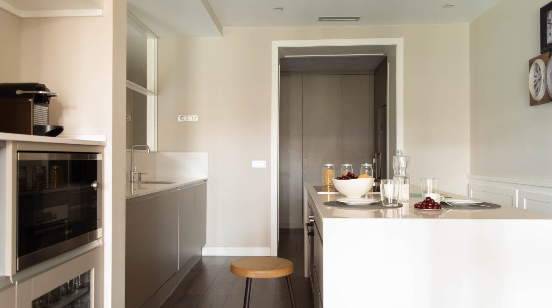 The interior is contemporary and inviting, with plenty of space for you and your clan to kick back between adventures. With its open-plan layout and elegant colour palette, echoing the facade of the Casa Batlló itself, it offers a free-flowing ambience of calm. We especially love the living space, where floor-to-ceiling arched windows – delightfully adorned with timber shutters and intricate iron railings – usher in floods of sunlight and an authentic Spanish balcony beckons you to admire spectacular street views. Spend mornings roosted here, sipping coffee with the sun on your face before slipping out to explore. Amidst the tree-lined avenue of Passeig de Gràcia and its cobbled alleyways, you'll find an array of restaurants, cafes and shops at your doorstep.