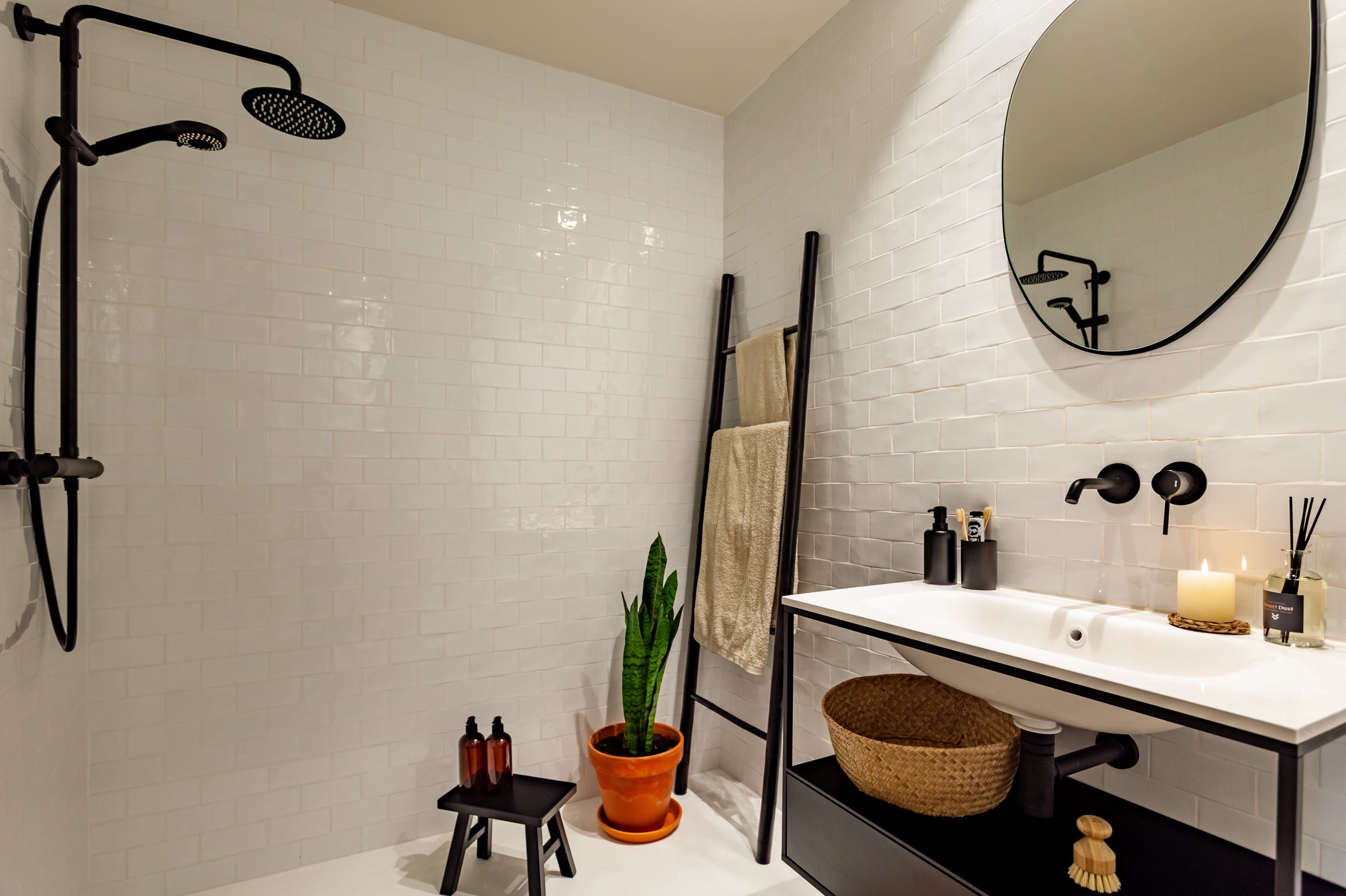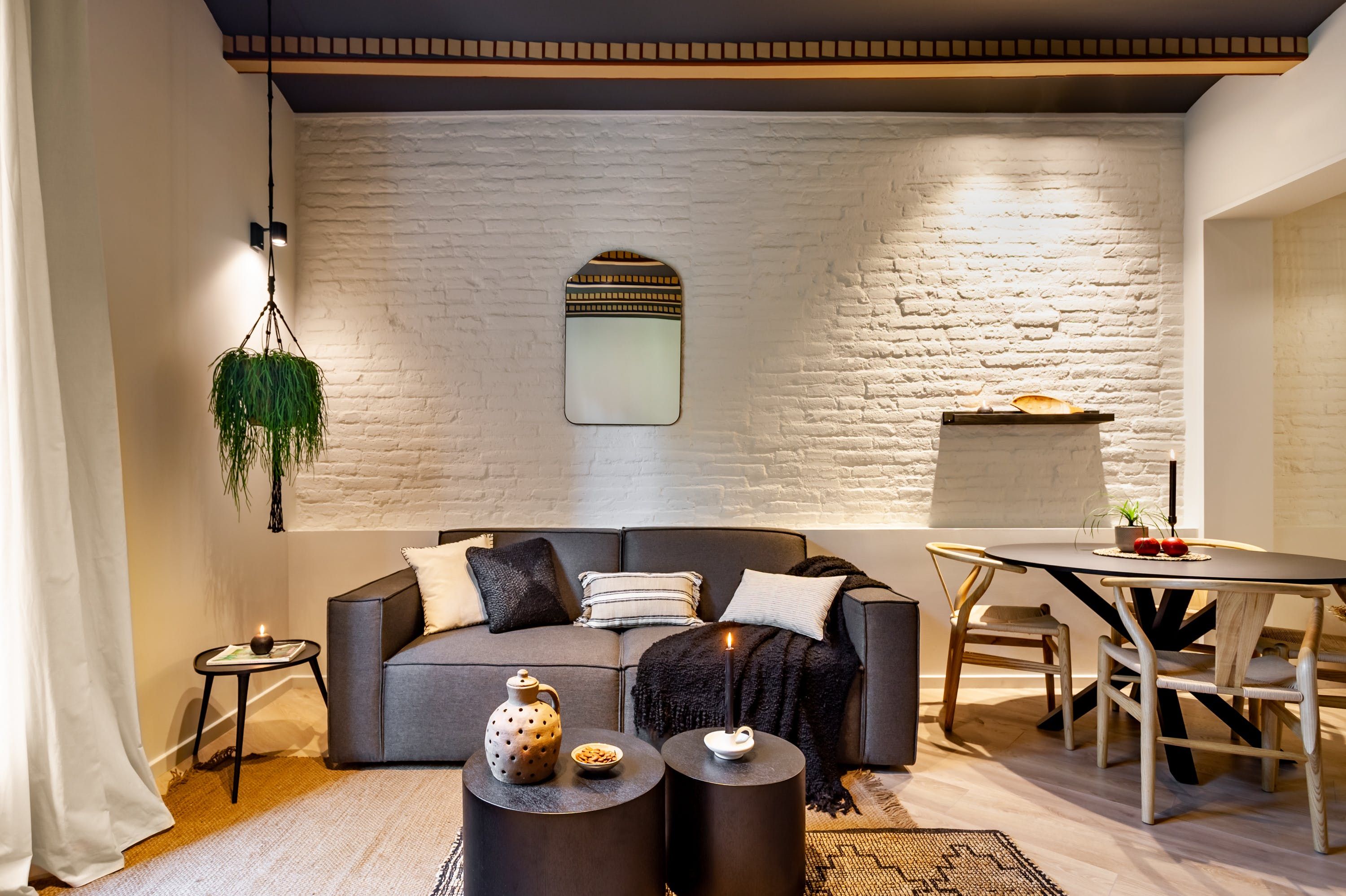 Inside your cool pad, you’ll find a soothing blend of natural tones sitting alongside eye-catching design elements like whitewashed brick walls and arched ceilings in the living area. Open up the French doors to let the breeze flow through as you relax on the sofa with a good book and a mug of coffee, or perch by the Juliet balcony with a glass of wine as you people-watch from your privileged position.