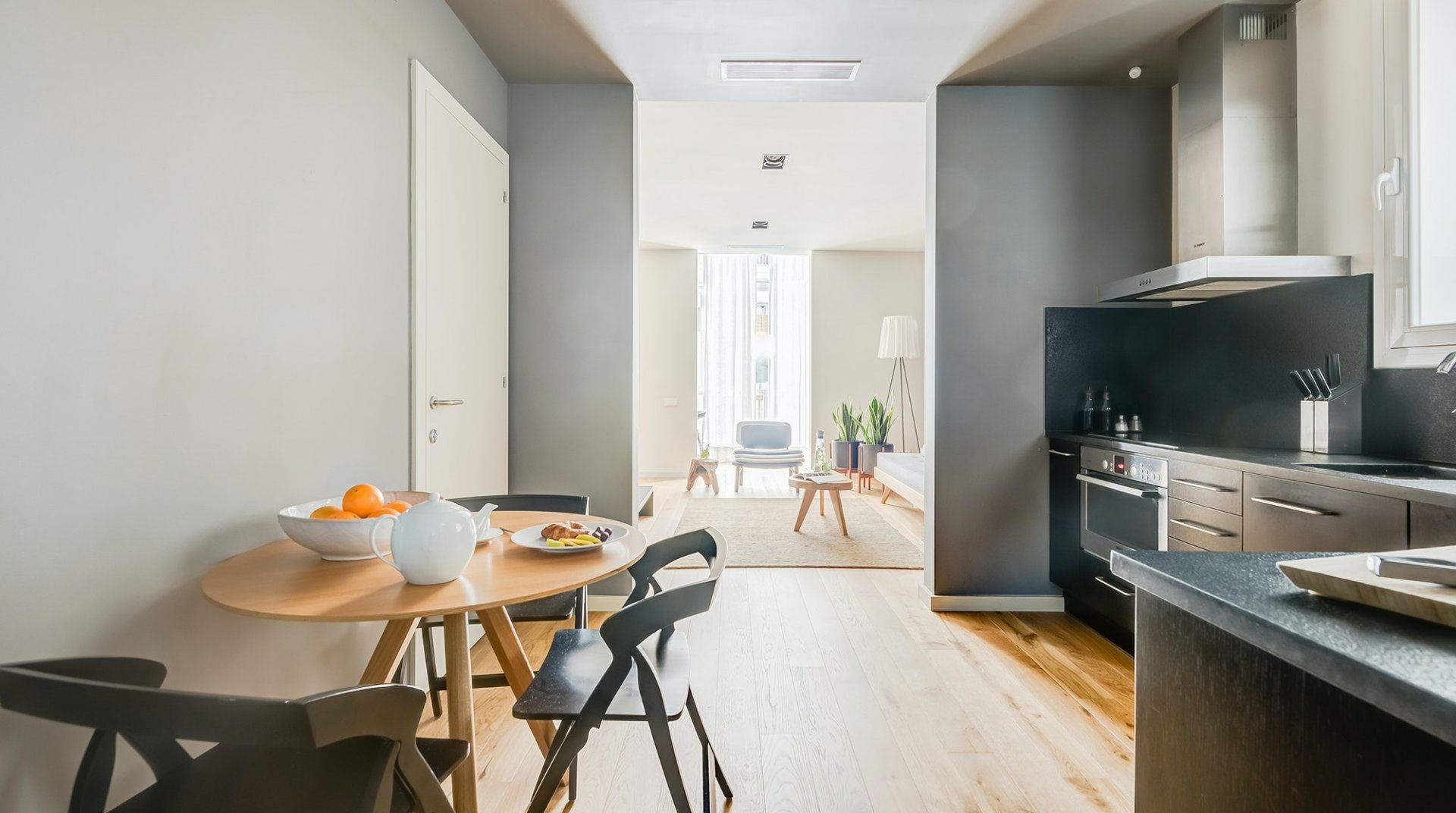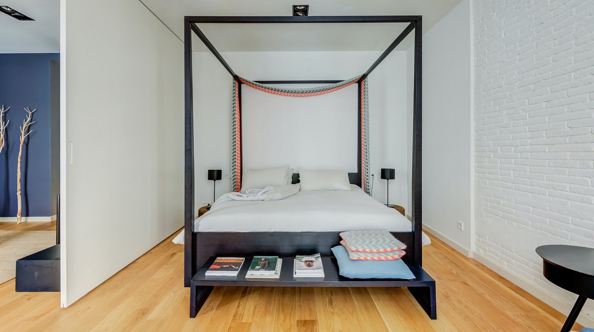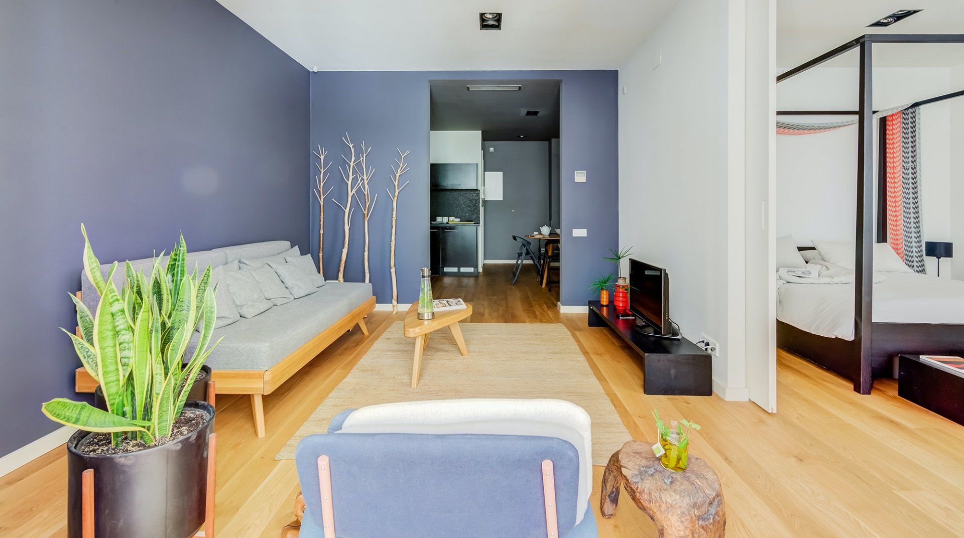 Located on the cusp of the Eixample neighbourhood, this apartment puts you in an excellent position to explore the city in style. It's right on the Ronda de la Universitat, a major thoroughfare in the city, but this sanctuary is pretty peaceful – thanks to it being on the inner side of the building, you get to enjoy the central location without the noise. We liked the splashes of mauve in the living room, as well as the use of natural materials. The kitchen is kitted out with basic seasonings and cooking ingredients, and there's a juicer and Nespresso machine to make mornings a delight. And the true standout feature of this home is the bedroom, with its impressive modern twist on a classic four-poster bed and painted brick wall. Step outside, and it's just a four-minute walk to the Plaça de Catalunya, and you can arrive at the labyrinthine Gothic Quarter in less than fifteen minutes.