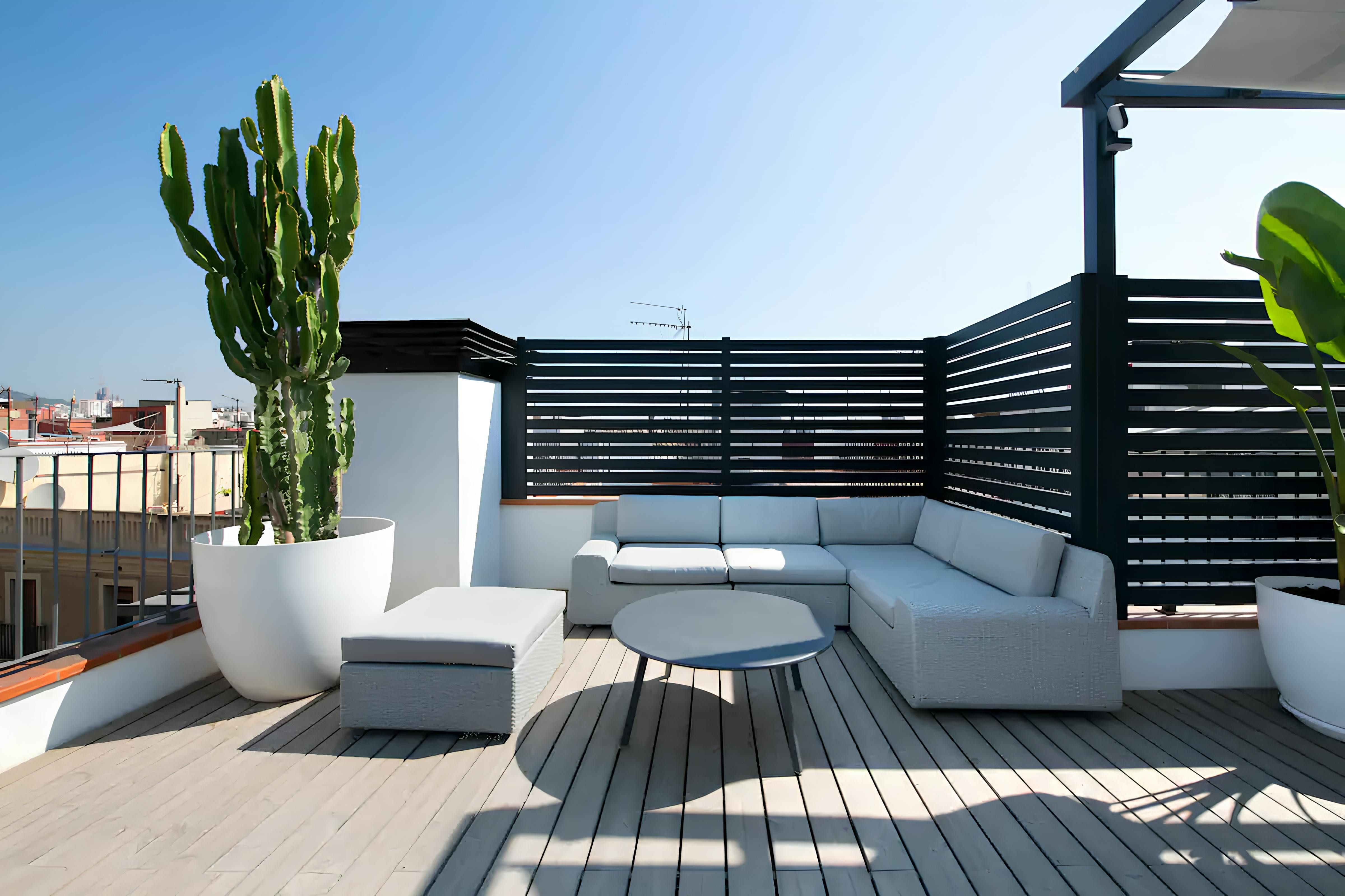Within walking distance of the Sagrada Família and Barcelona Cathedral, this penthouse apartment places you in a prime neighbourhood. Step outside and you'll find tapas bars, art galleries and shops tucked along cobbled streets. Back home, the space is bright and full of character, with exposed brick walls, wooden-beamed ceilings, and an office that doubles as an extra bedroom with a single sofa bed. The best part? Two terraces – one for breakfast and another for afternoon barbecues or sunset dinners with views across the city.