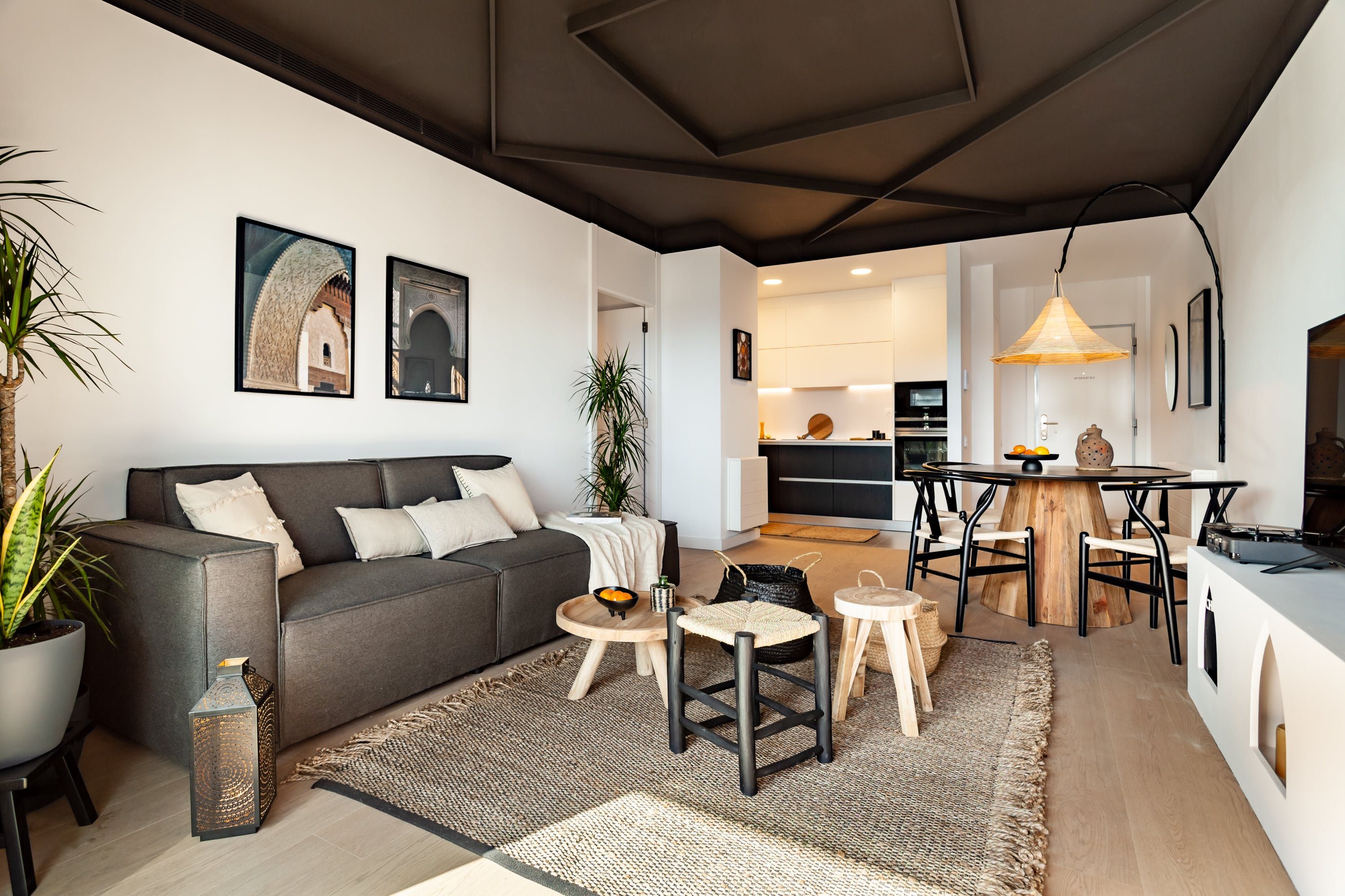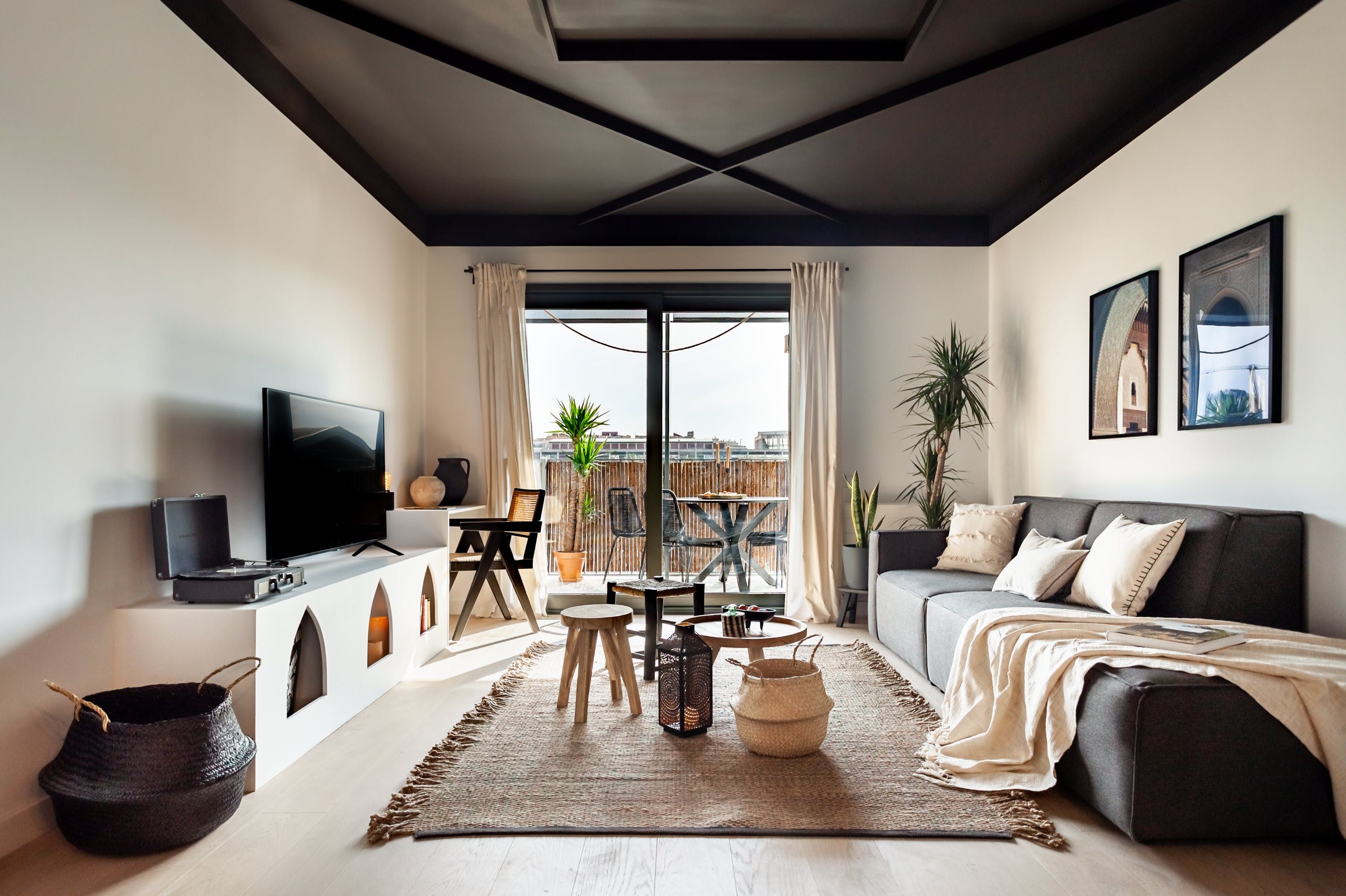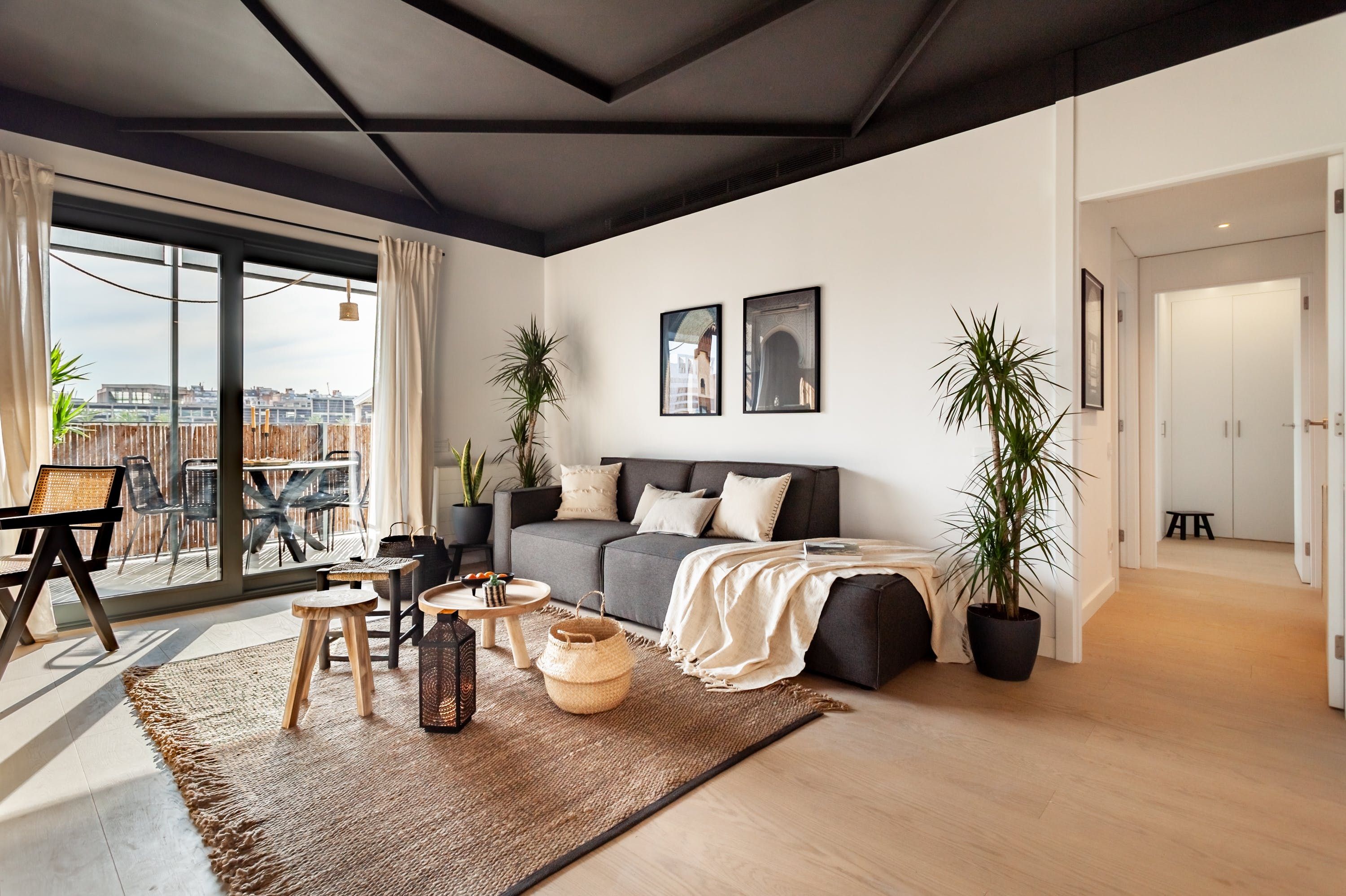 Surround yourself with style and sunshine at this modern home in central Barcelona. With a cosy private terrace, impeccably decorated interiors access to a shared swimming pool, the kitted-out apartment has more than just its stellar location going for it. Wake up in chic surroundings – we particularly love the living room's matte black ceiling – and enjoy breakfast in the morning sun, then head downstairs for a dip before venturing into the vibrant city streets.