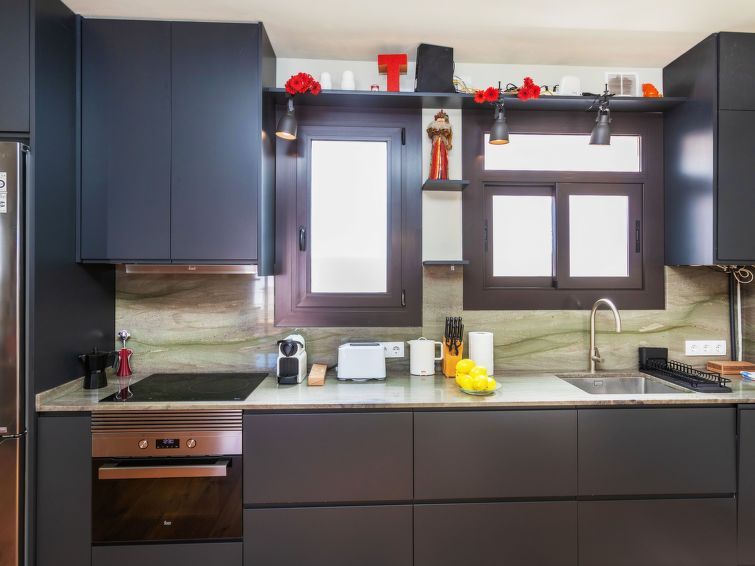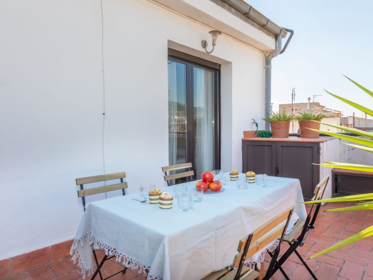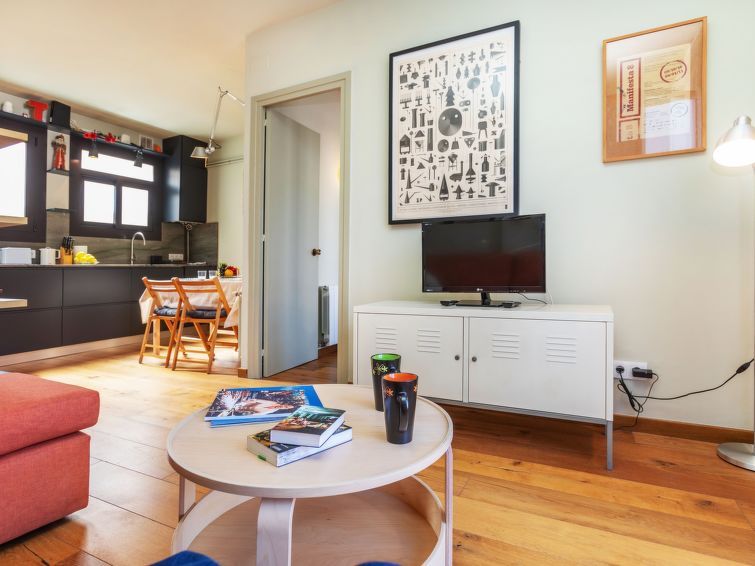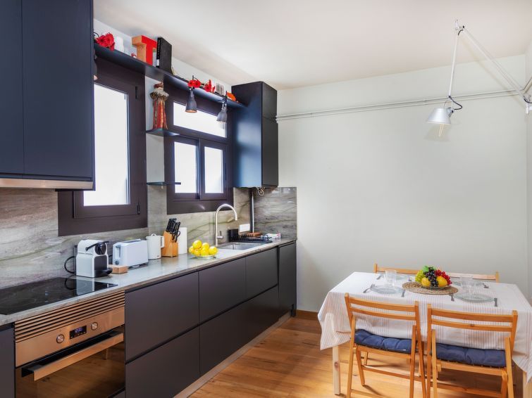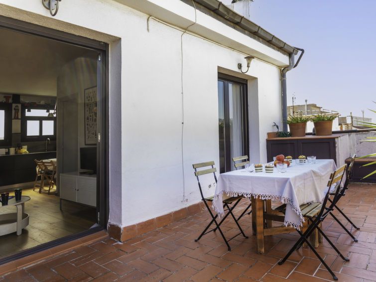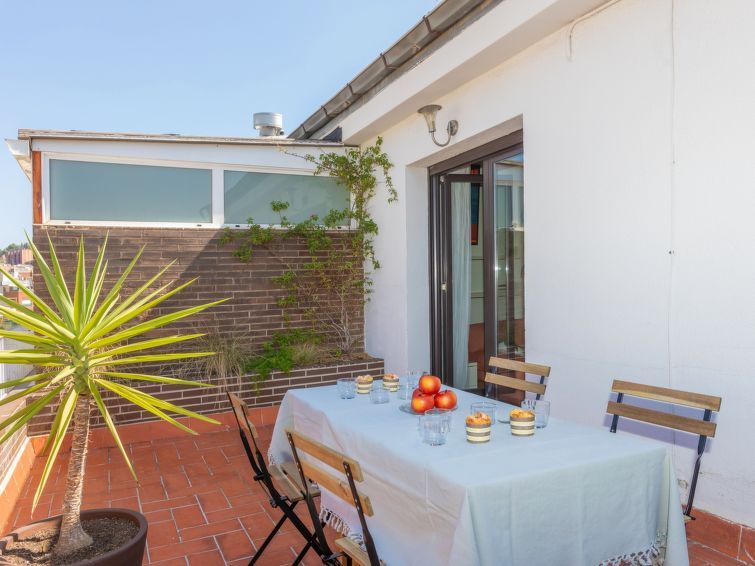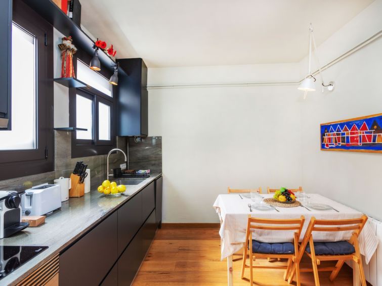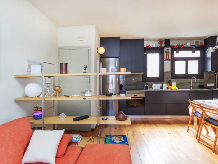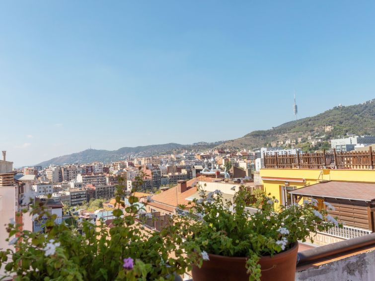 "Gràcia: Parc Güell", 2-room penthouse 46 m2 on 4th floor. Bright, practical and modern furnishings: living/dining room with dining table, digital TV and air conditioning. Exit to the terrace. 1 room with 1 french bed (160 cm, length 200 cm), shower/WC and gas heating. Kitchen (oven, dishwasher, 3 induction hot plates, toaster, microwave, freezer).