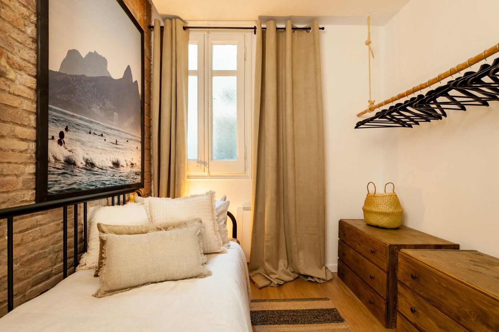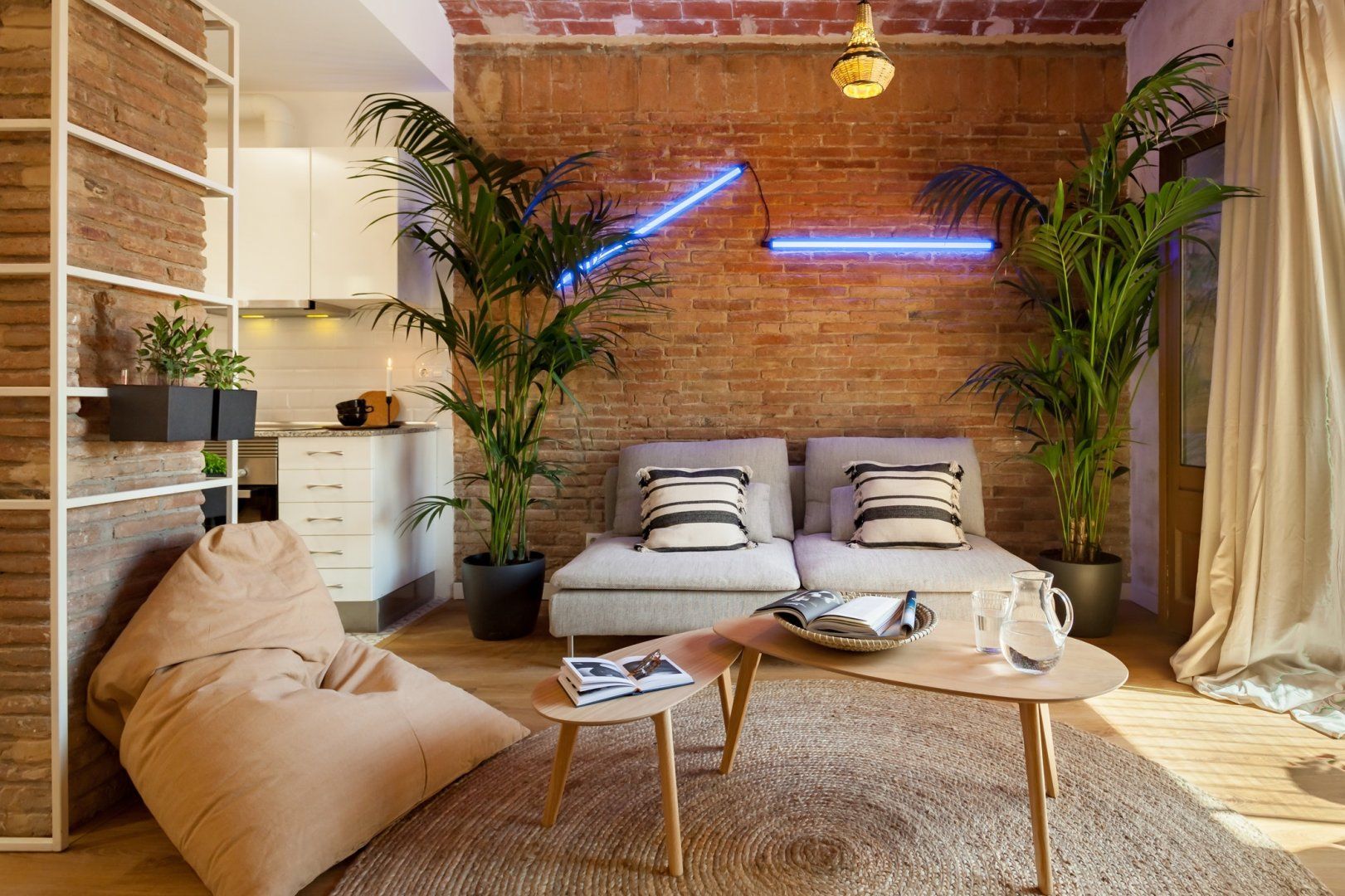 With its exposed brick walls, domed ceiling, bespoke neon lighting, Brazilian art and a plethora of plants, there’s a laid-back vibe here that instantly makes you feel like you're in a beachy haven. Our favourite spot in the home is the balcony with its wicker rocking chair and shaded cover. Start mornings off here with a cup of coffee before getting some work done in the cosy workspace. Then, set out to see the sights with ​​Gaudí’s beautiful Casa Milà a ten-minute walk away and Casa Batlló less than a fifteen-minute stroll. You'll also find leafy Las Ramblas a twenty-minute stroll away and La Sagrada Familia walkable in just under thirty minutes.