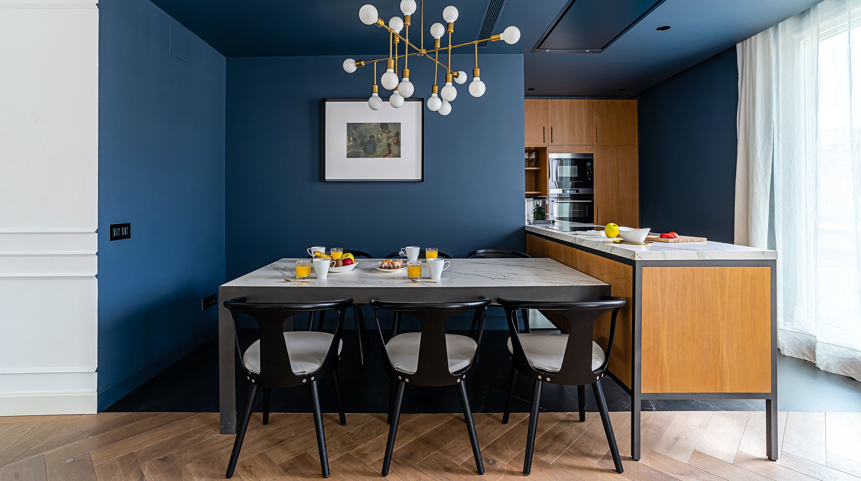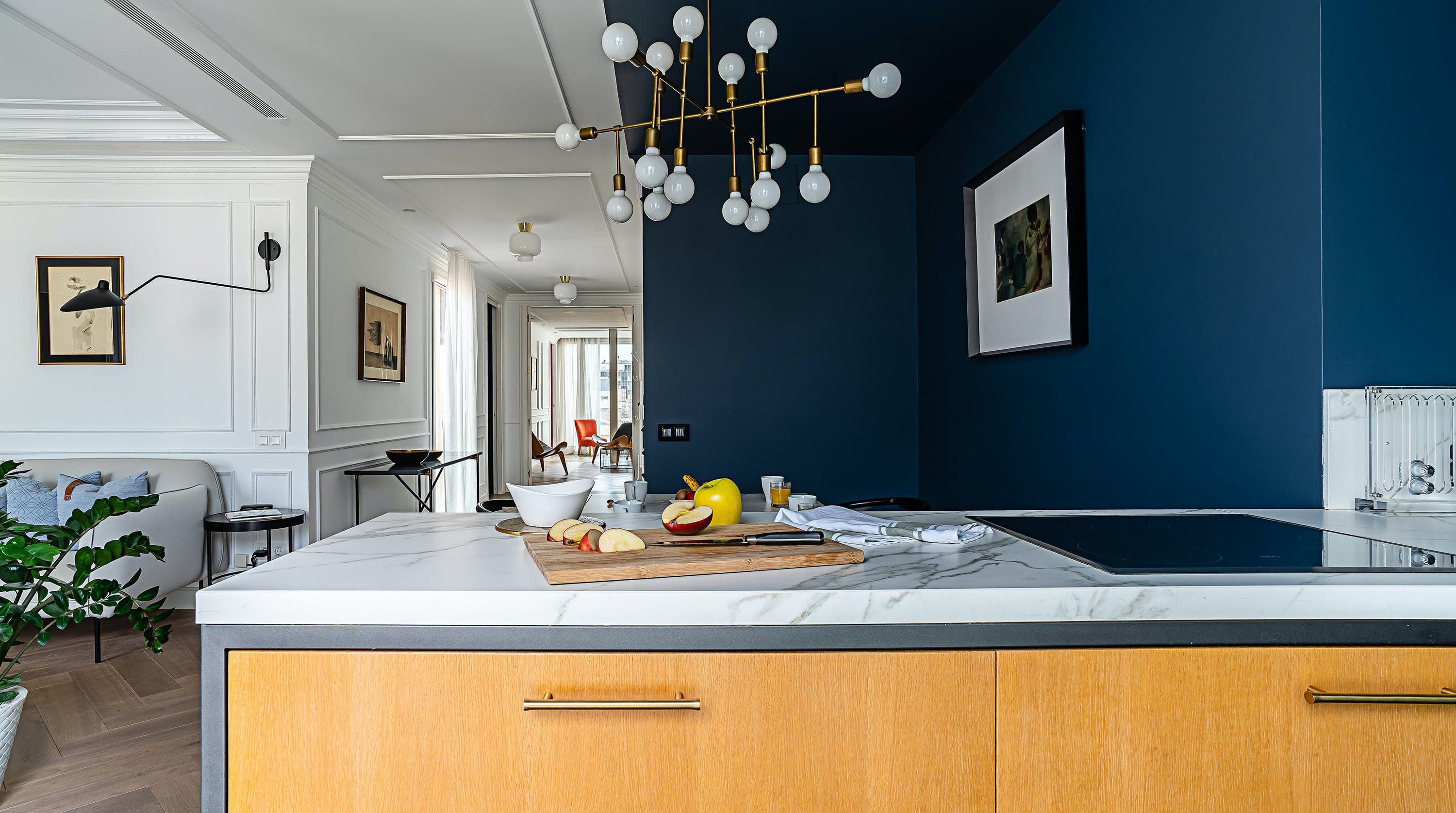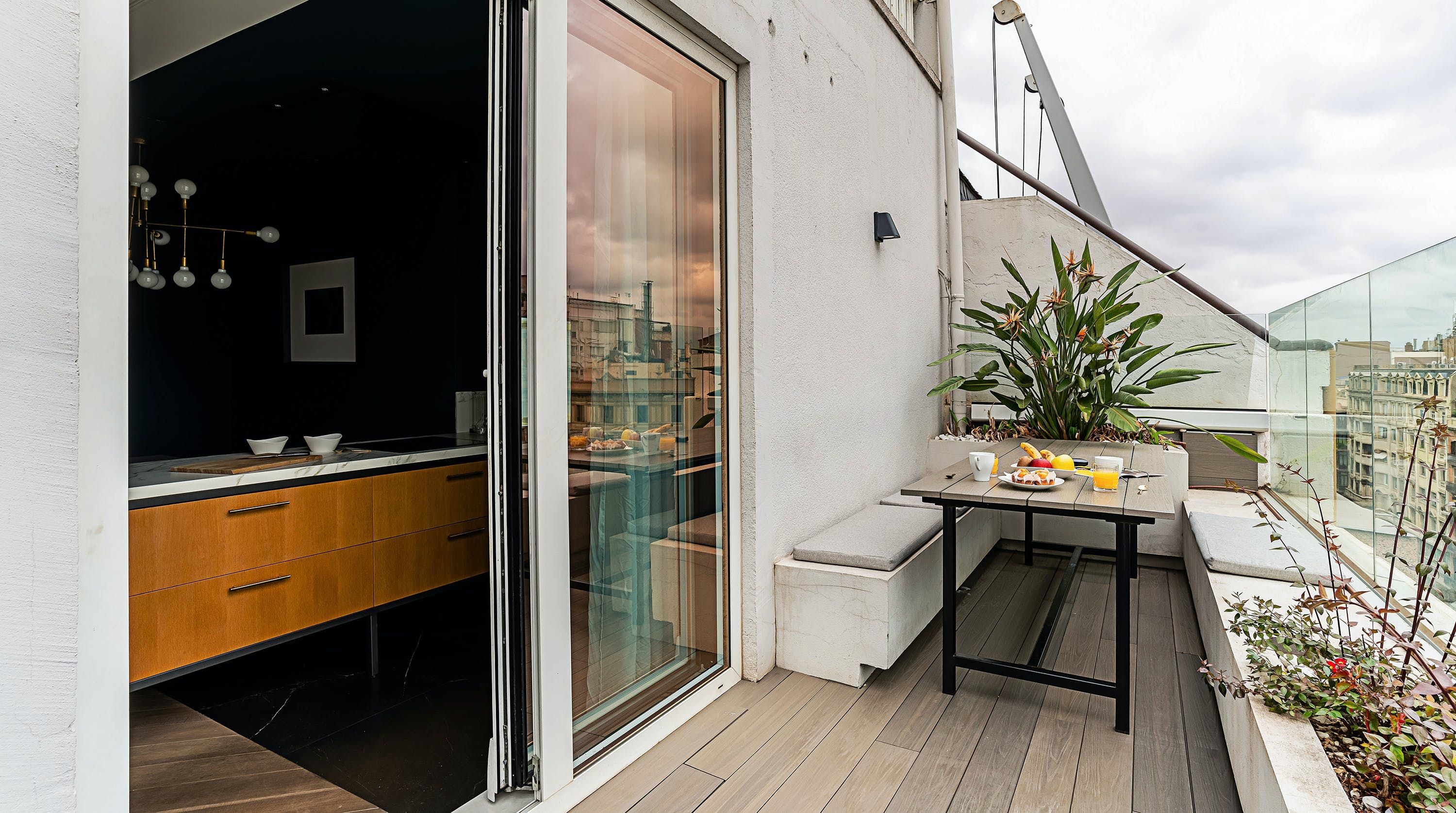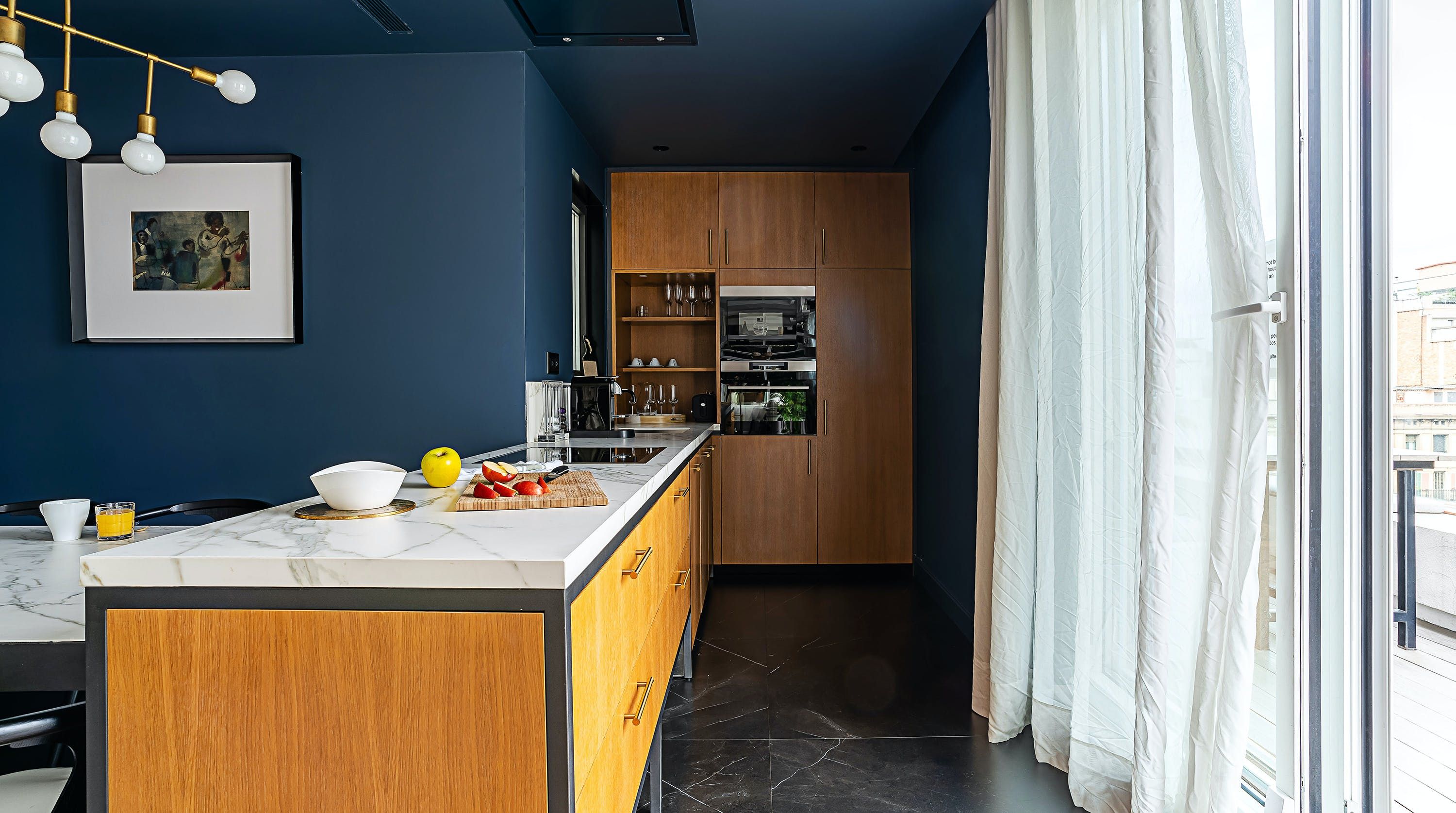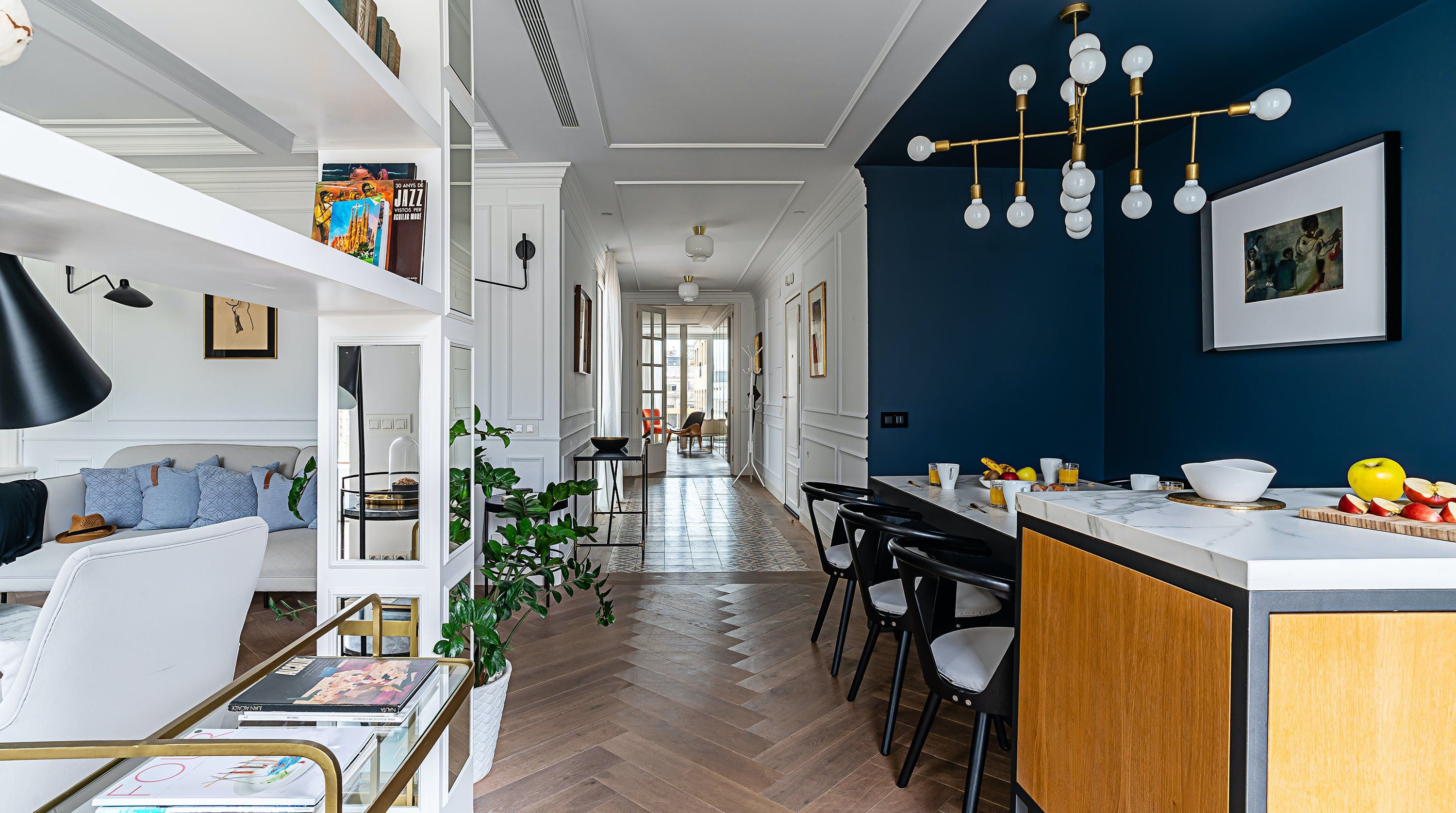 With its trendy colour palette and sleek modern design, this Eixample apartment offers first-class urban living. The marine blue accent wall makes the open-plan living space feel connected and cosy, while boiserie and marble-effect details add a touch of elegance. You’ll begin your mornings at the dining table with a traditional Catalan breakfast before nipping onto the balcony to bask in the glorious sunshine.