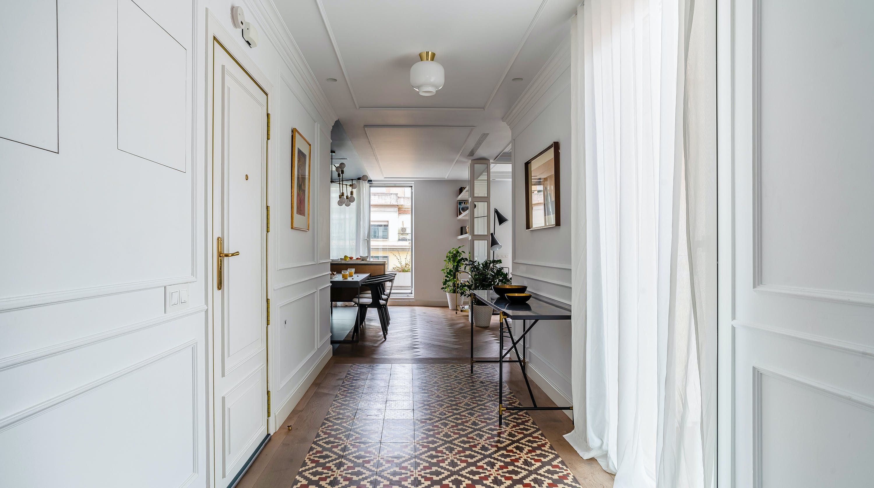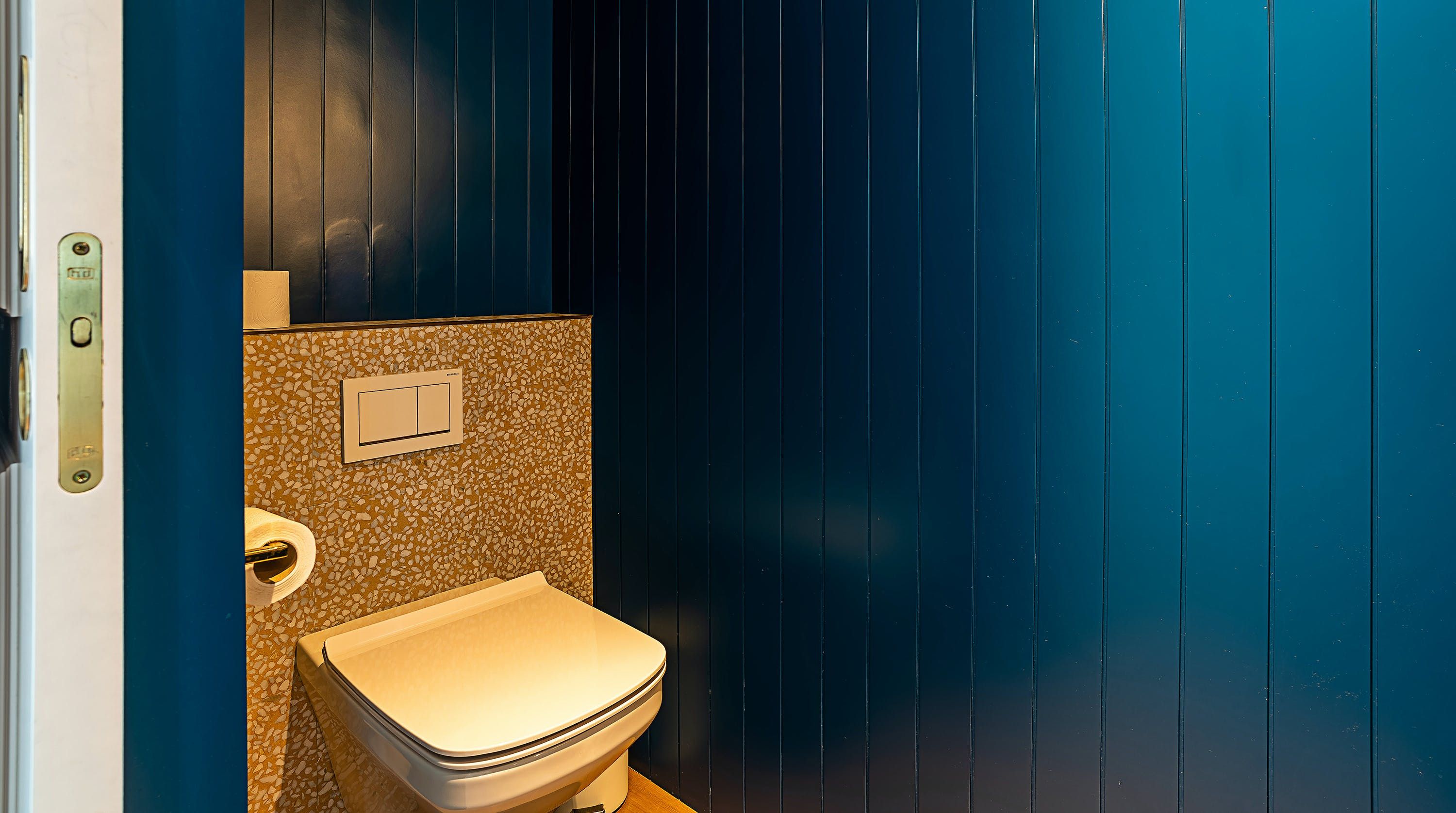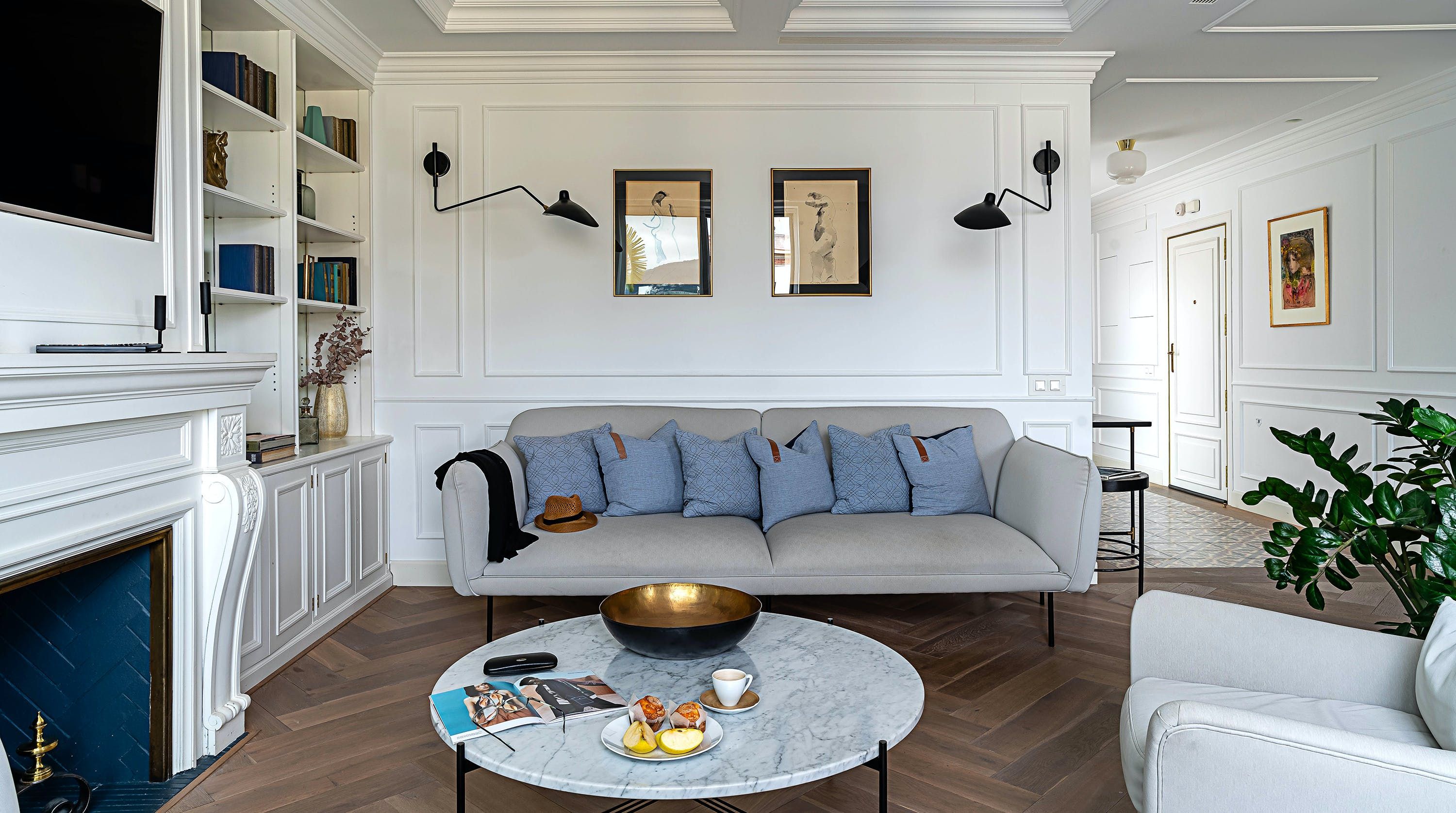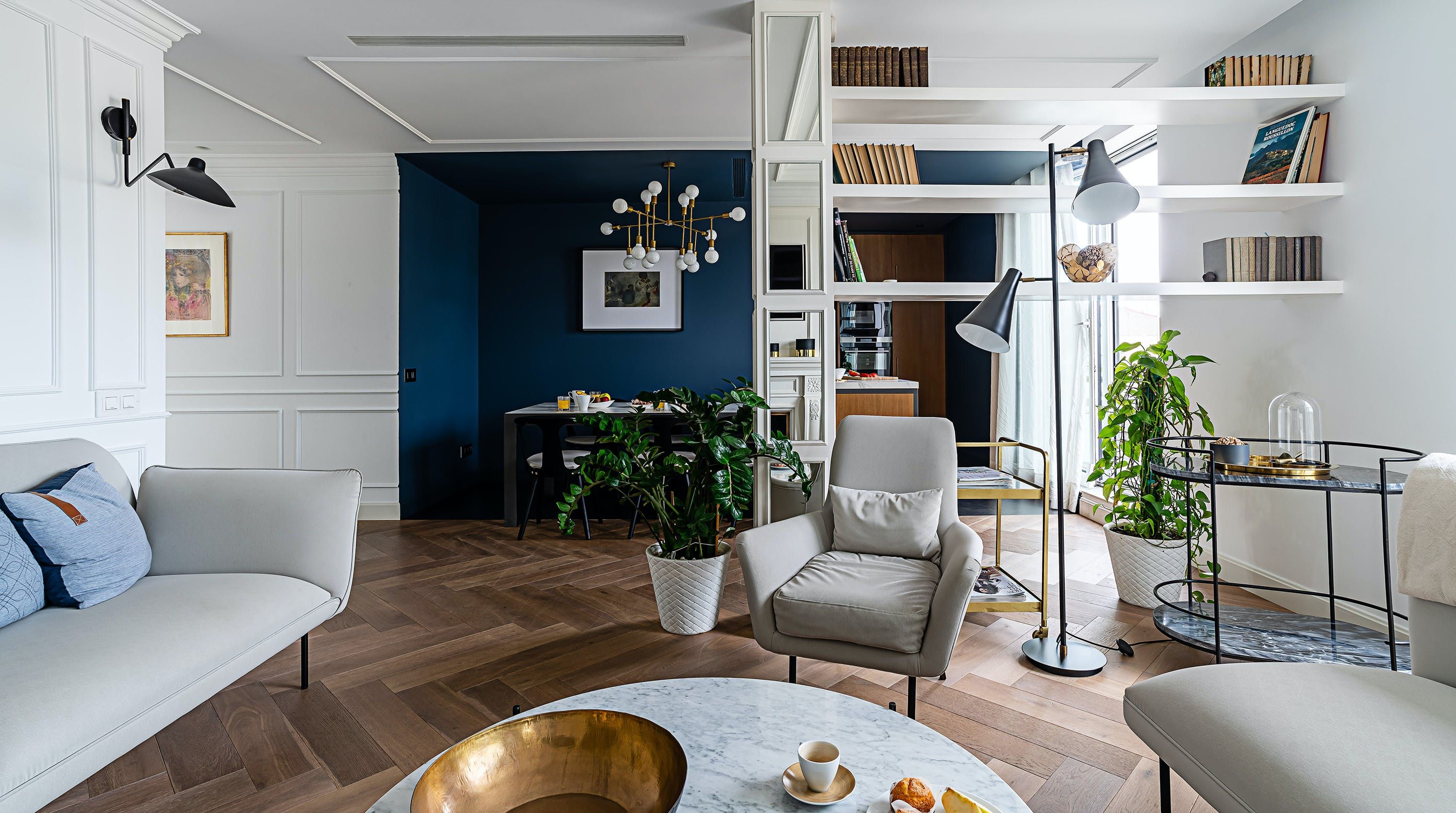 With its trendy colour palette and sleek modern design, this Eixample apartment offers first-class urban living. The marine blue accent wall makes the open-plan living space feel connected and cosy, while boiserie and marble-effect details add a touch of elegance. You’ll begin your mornings at the dining table with a traditional Catalan breakfast before nipping onto the balcony to bask in the glorious sunshine.