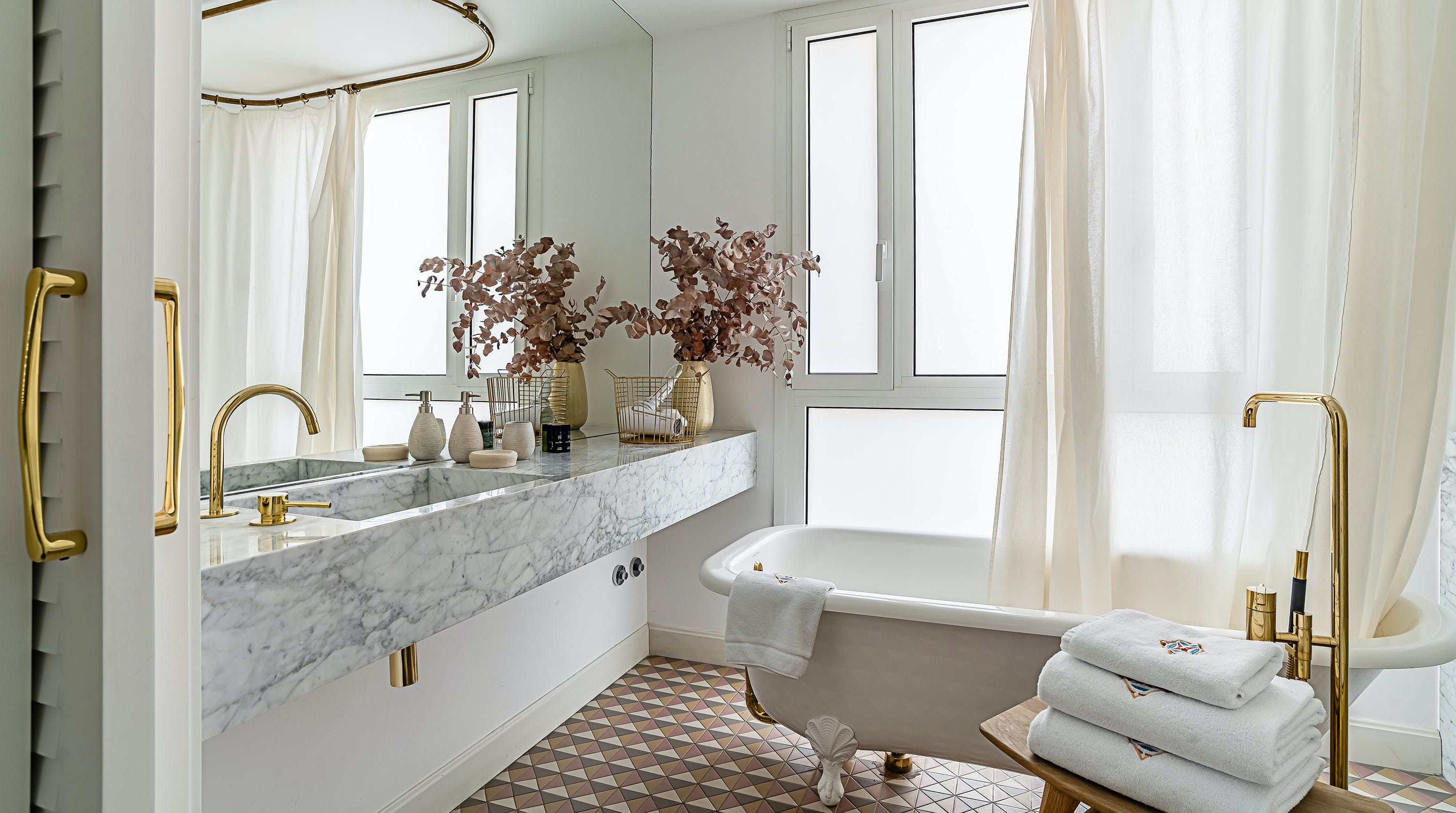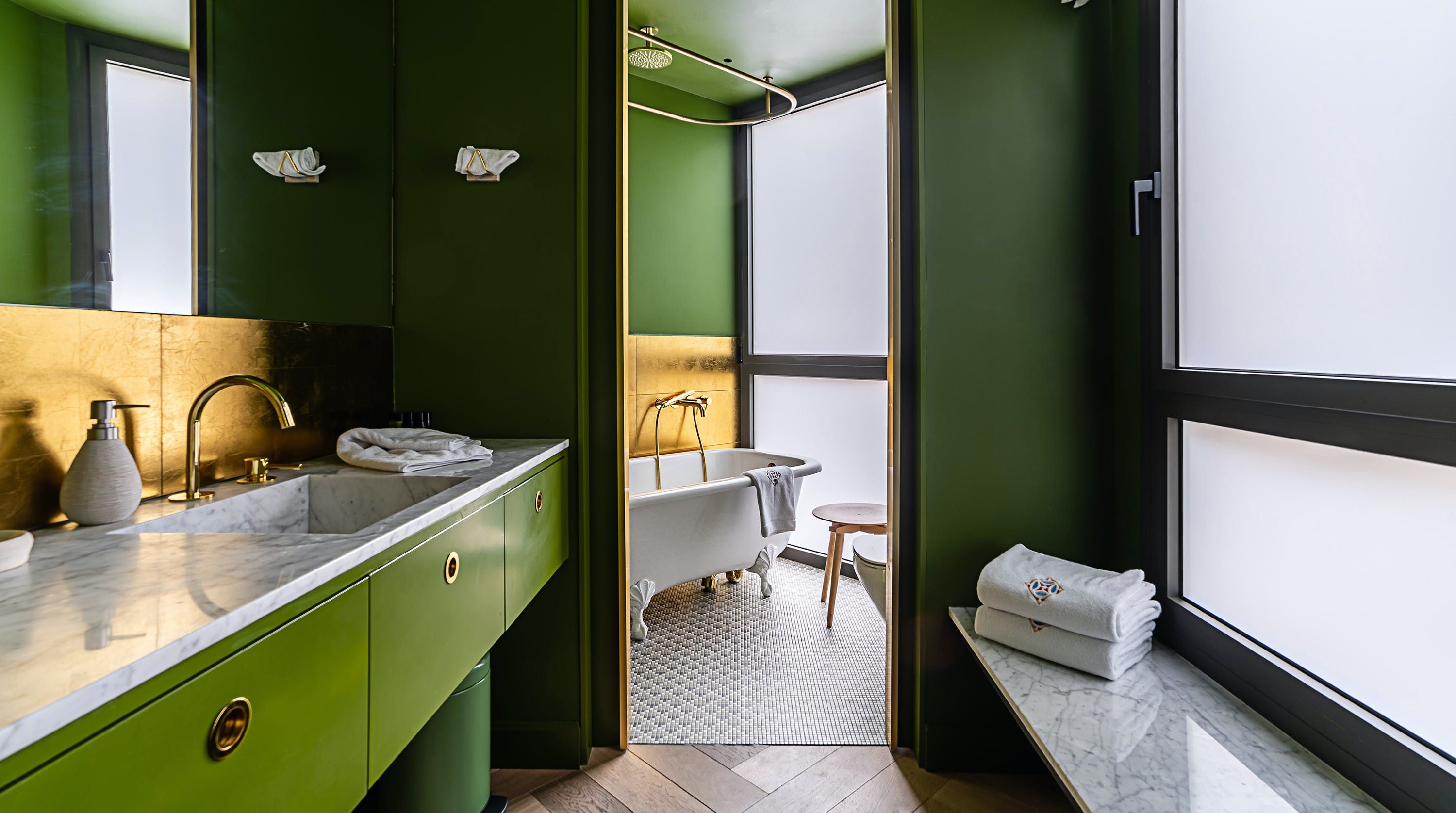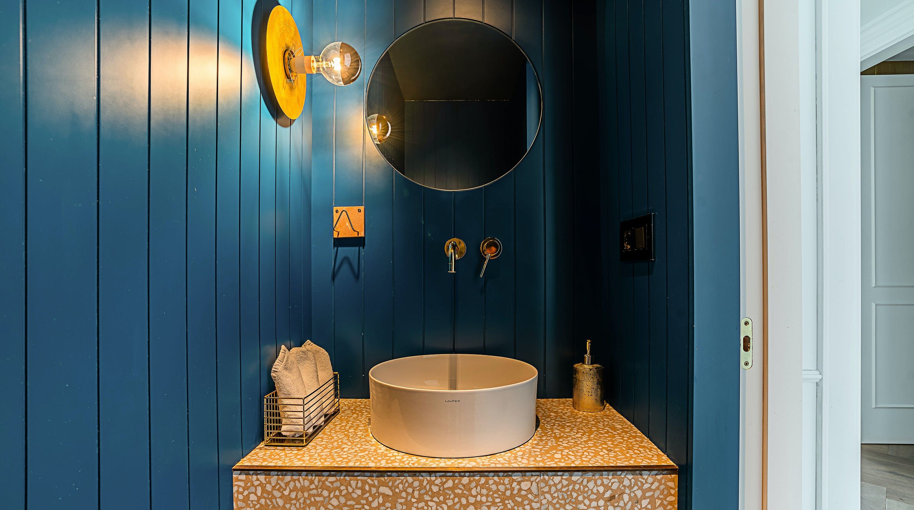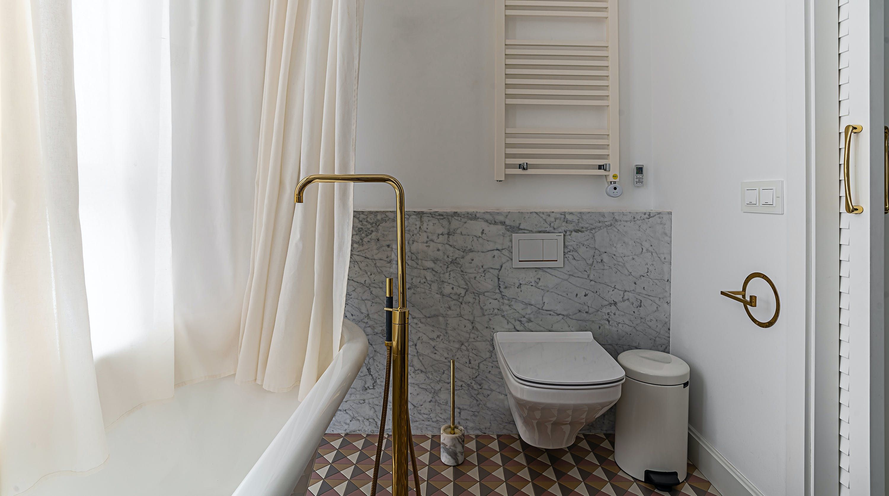 With its trendy colour palette and sleek modern design, this Eixample apartment offers first-class urban living. The marine blue accent wall makes the open-plan living space feel connected and cosy, while boiserie and marble-effect details add a touch of elegance. You’ll begin your mornings at the dining table with a traditional Catalan breakfast before nipping onto the balcony to bask in the glorious sunshine.