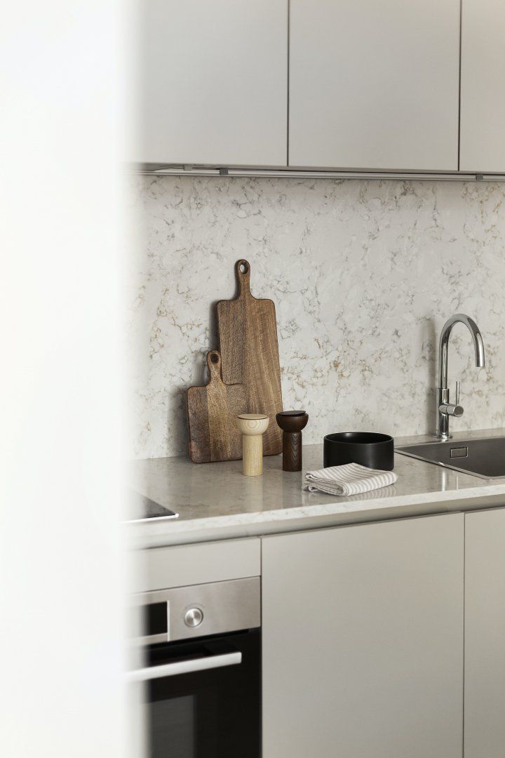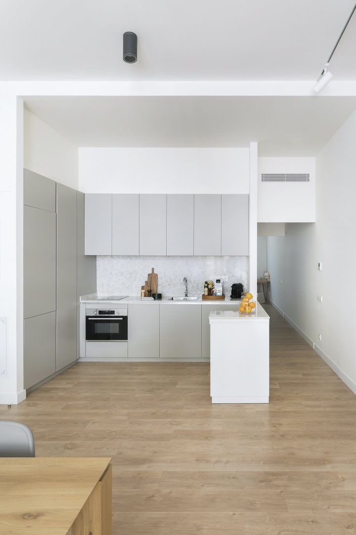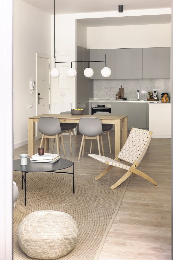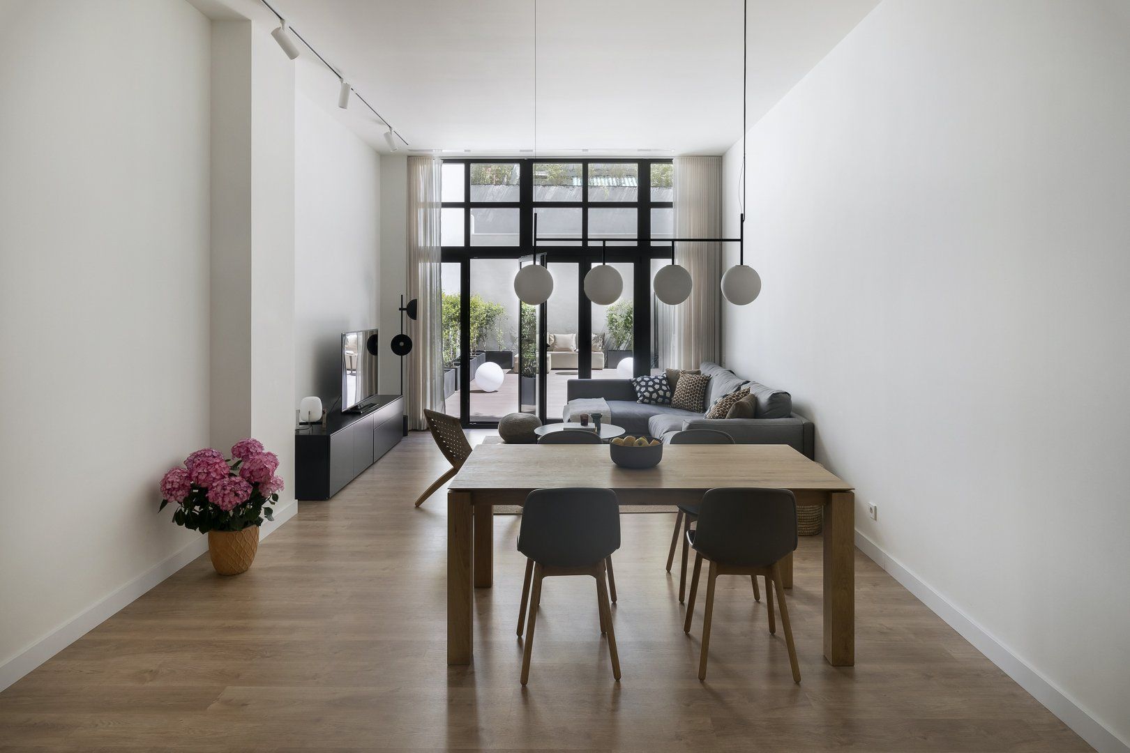 Long, bright, and airy, the living space stretches from a sleek, matte grey kitchen, all the way to glass doors to your private terrace. In between, the wooden floors play host to modern furnishings, strategically placed to create an excellent sense of space in this minimalist home.