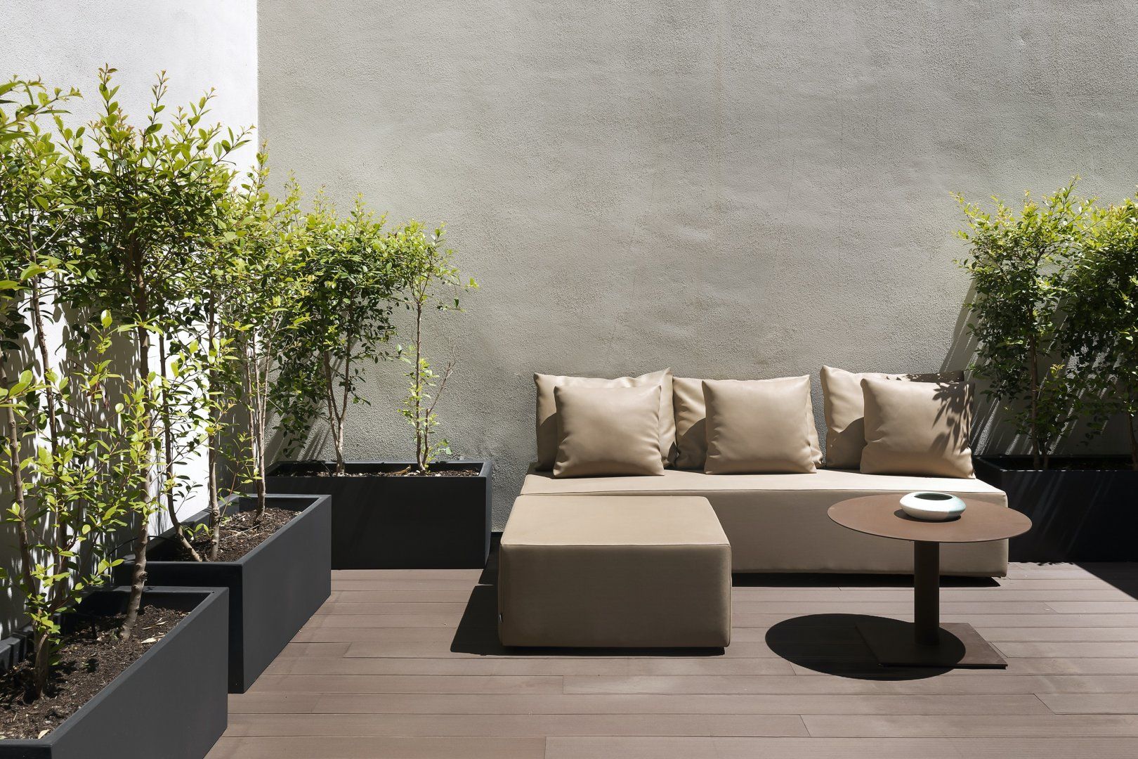 Wander the length of the room with a glass of tempranillo in hand, reaching the outdoor lounge at the end. Planters with leafy bushes make this secluded terrace feel extra private – perfect for reclining on the sofa with some music playing, olives on the side table, and a top-up of wine.