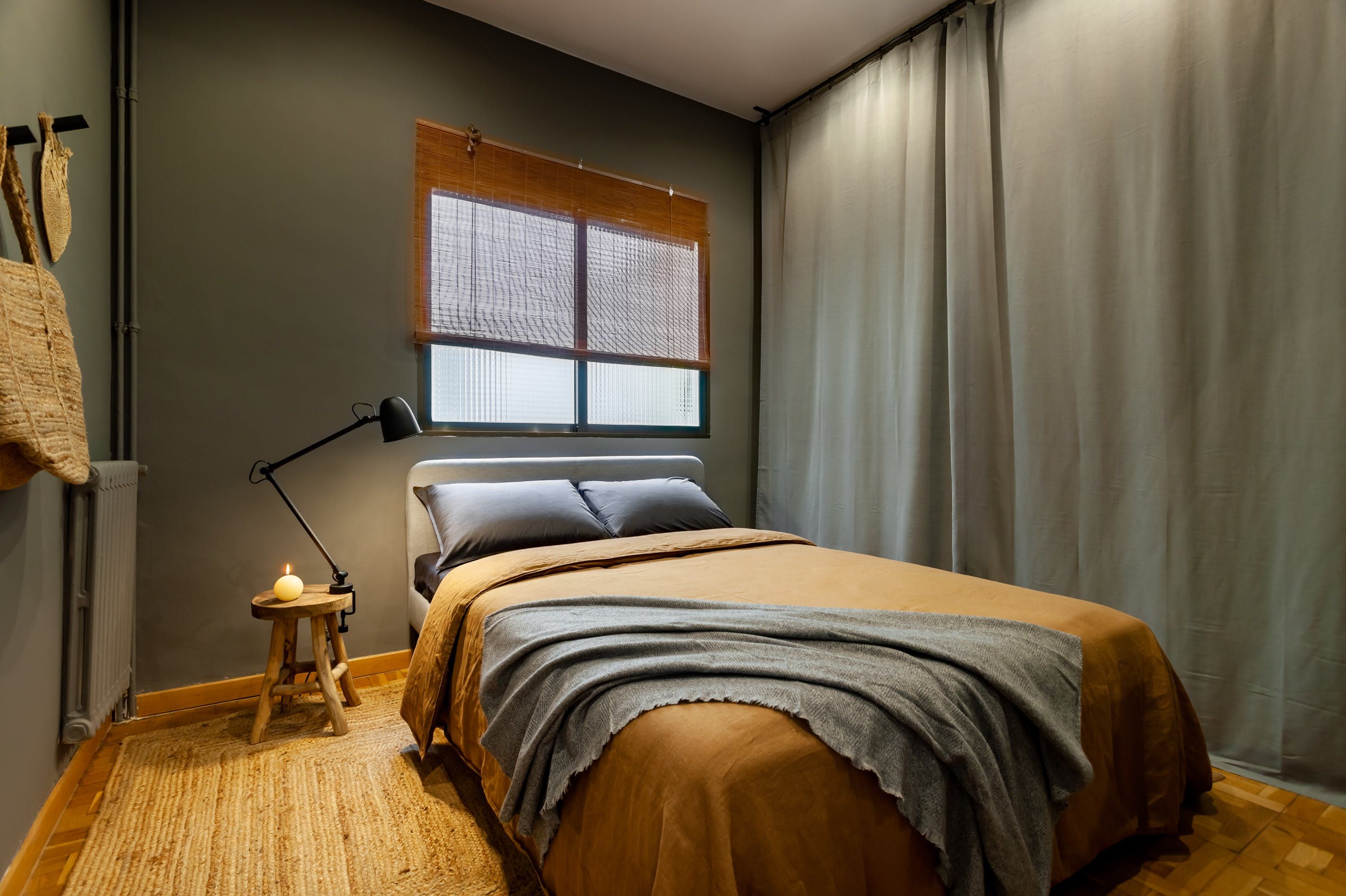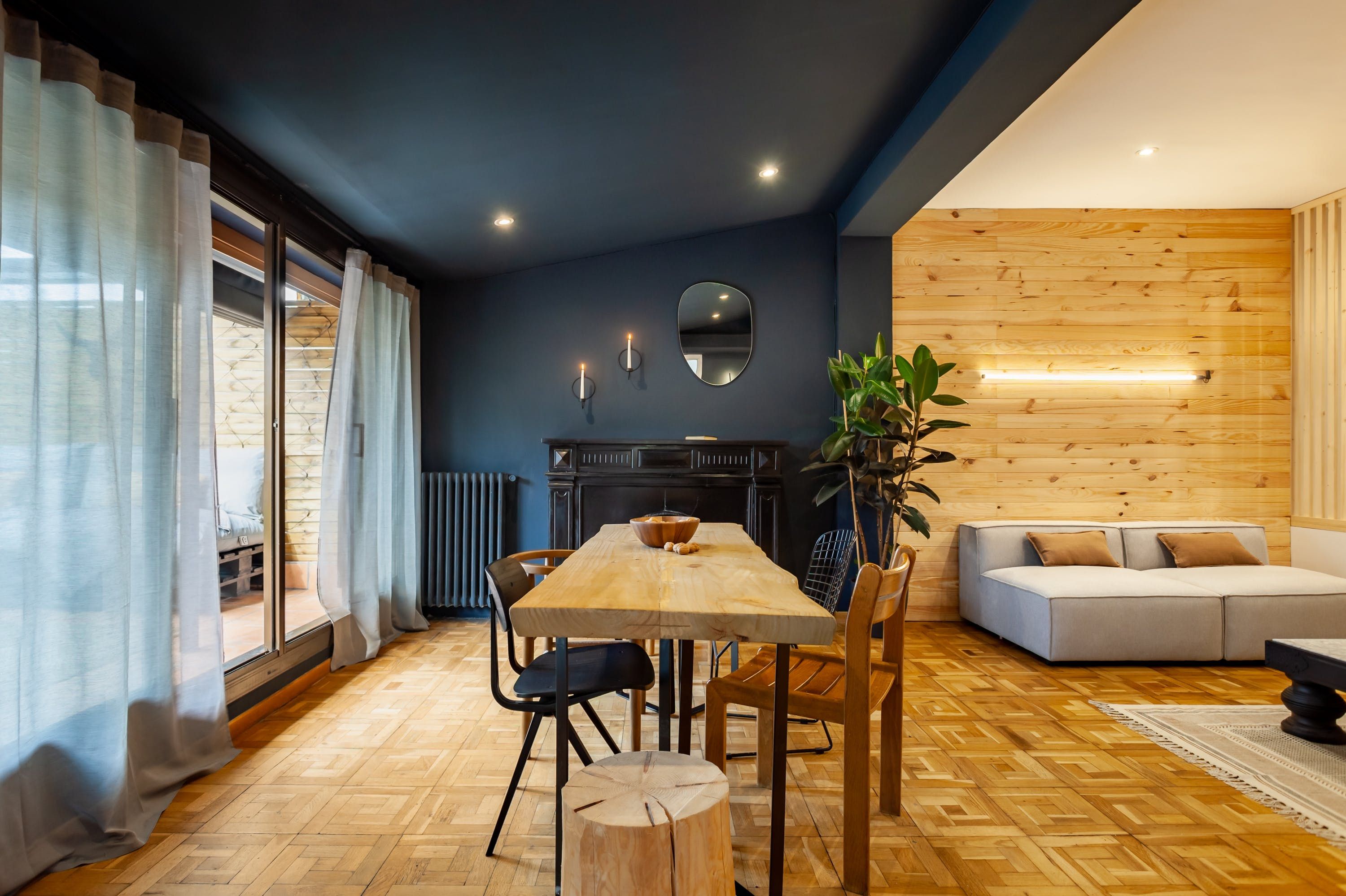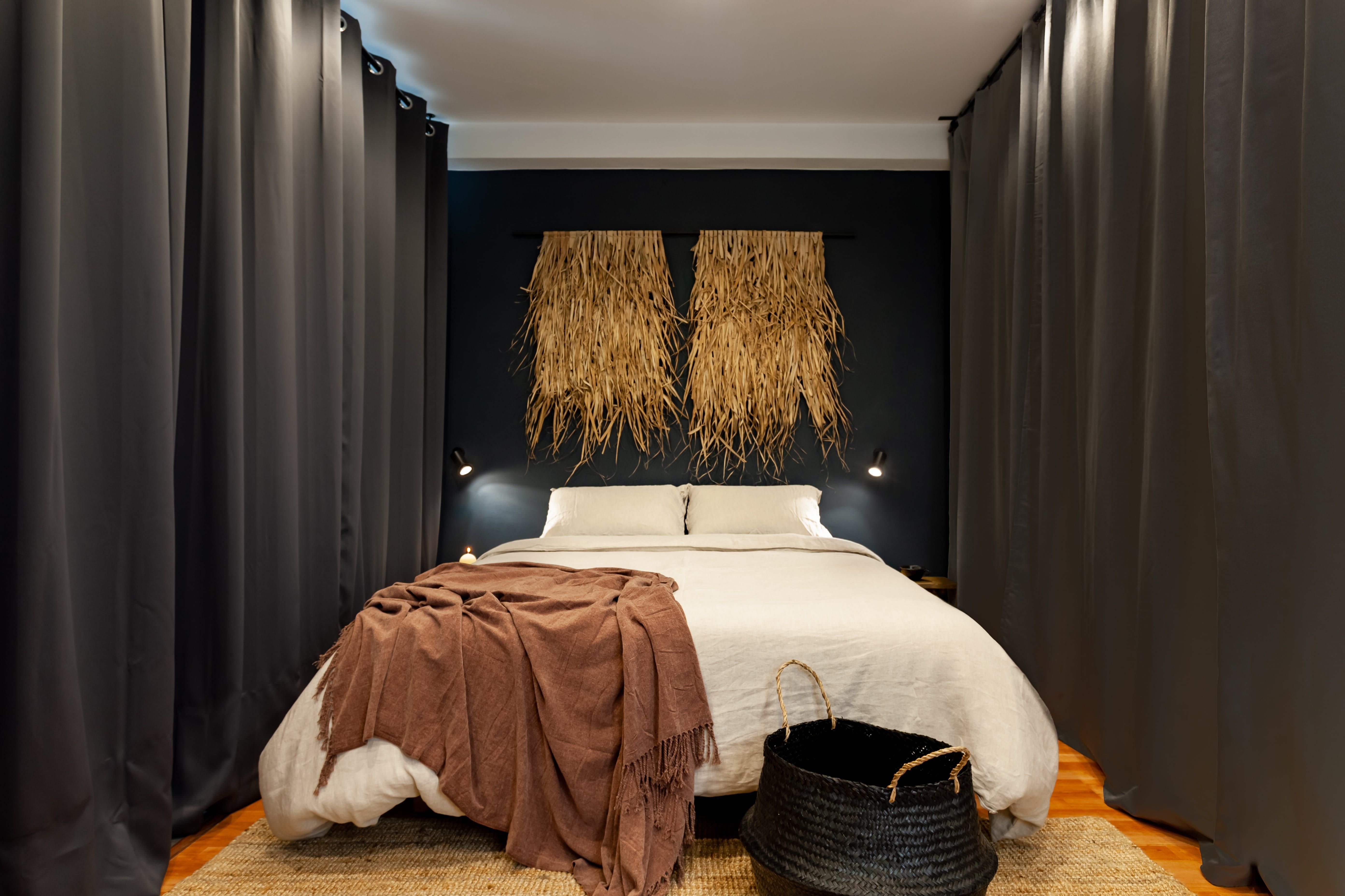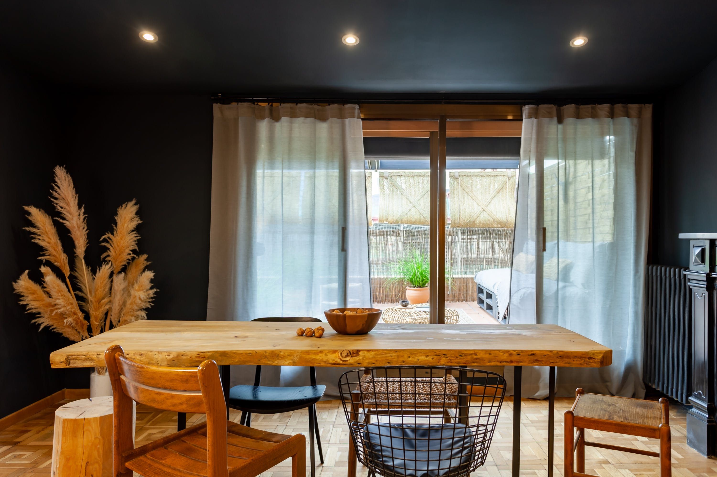 Grand, beautiful and stylishly bohemian, this apartment in Barcelona’s Eixample Esquerra neighbourhood provides a luxuriously relaxing stay within easy reach of the city’s most iconic sights. Inside, the decor has been playfully curated to juxtapose light and dark, with pale wood accents contrasting against deep-hued feature walls to create an intimate space that instantly feels soothing. We love the eclectic furnishings – from the low-slung sofa with its statement neon light to the mixture of chairs around the large dining table – and the original ornamental fireplace that adds a touch of grandeur to the laid-back, bohemian furnishings. The kitchen is any home cook’s dream with its neutral cabinetry, compact island and floor-to-ceiling blackboard, while the two bedrooms provide the perfect canvas for a dreamy night’s sleep with their earth-toned palettes and grasslands-inspired ornaments. Our favourite feature of the home, however, is the large private terrace equipped with a sofa, a table and chairs. Whether you’re kicking back with your morning coffee, gathering here over a jug of sangria or sitting down to a meal beneath the glow of the fairy lights, you’ll love having this outdoor space to catch some Spanish rays and indulge in the balmy air. Outside of your home, you’re a twenty-minute walk from Casa Milà, a thirty-five-minute stroll from La Sagrada Família, while all around you, Eixample Esquerra's art galleries, swish cafes, and luxury boutiques wait to be explored.