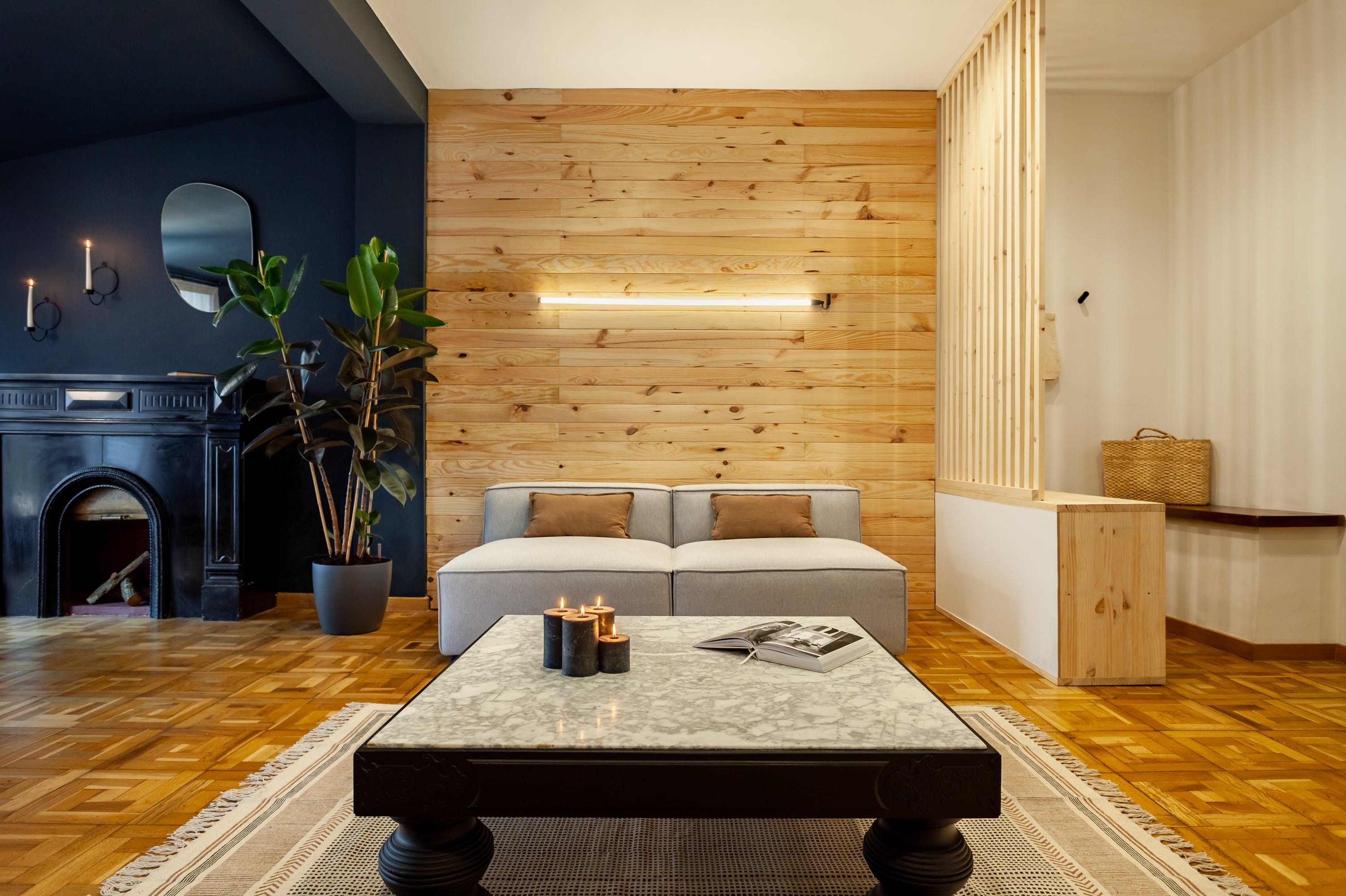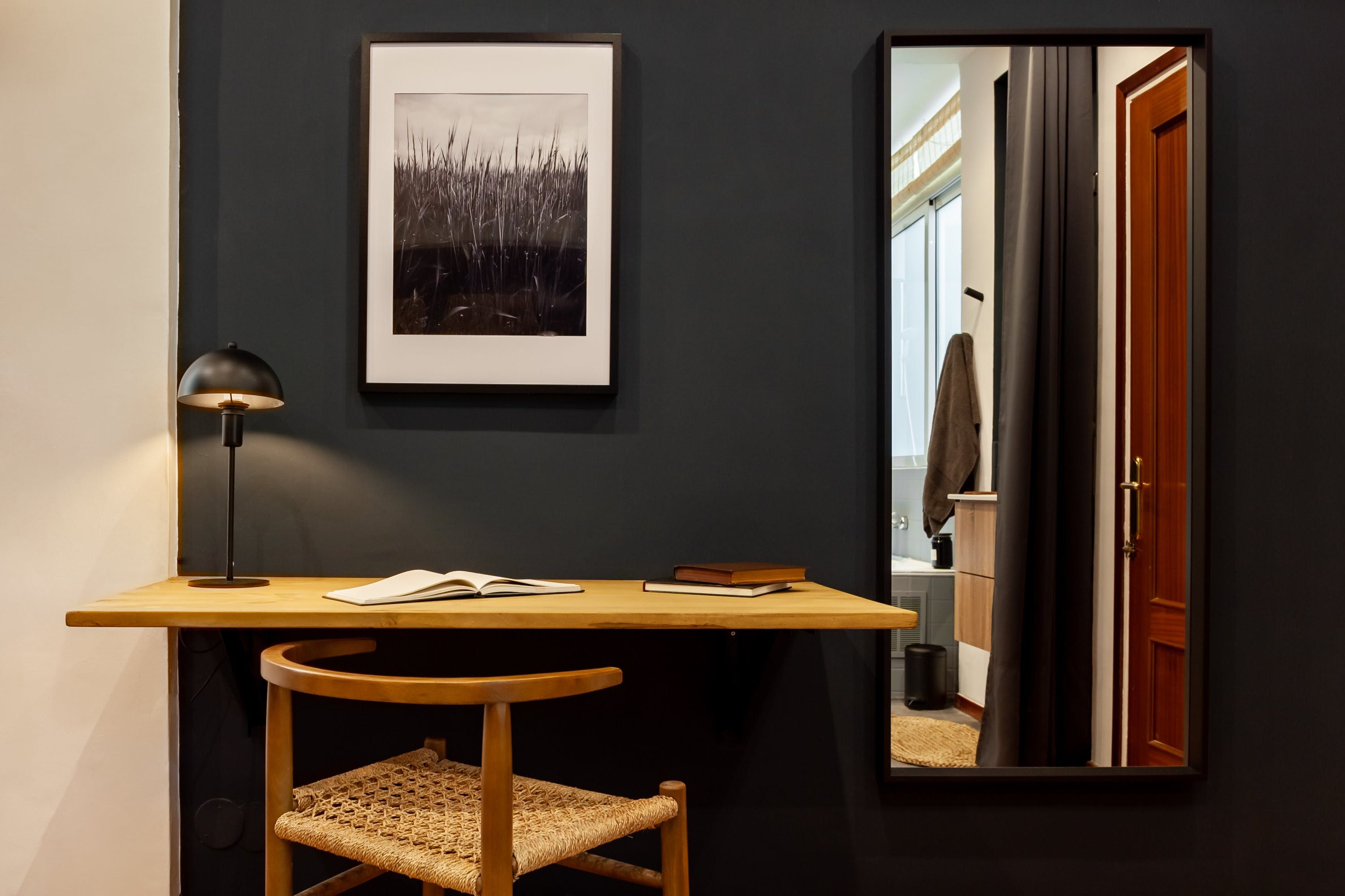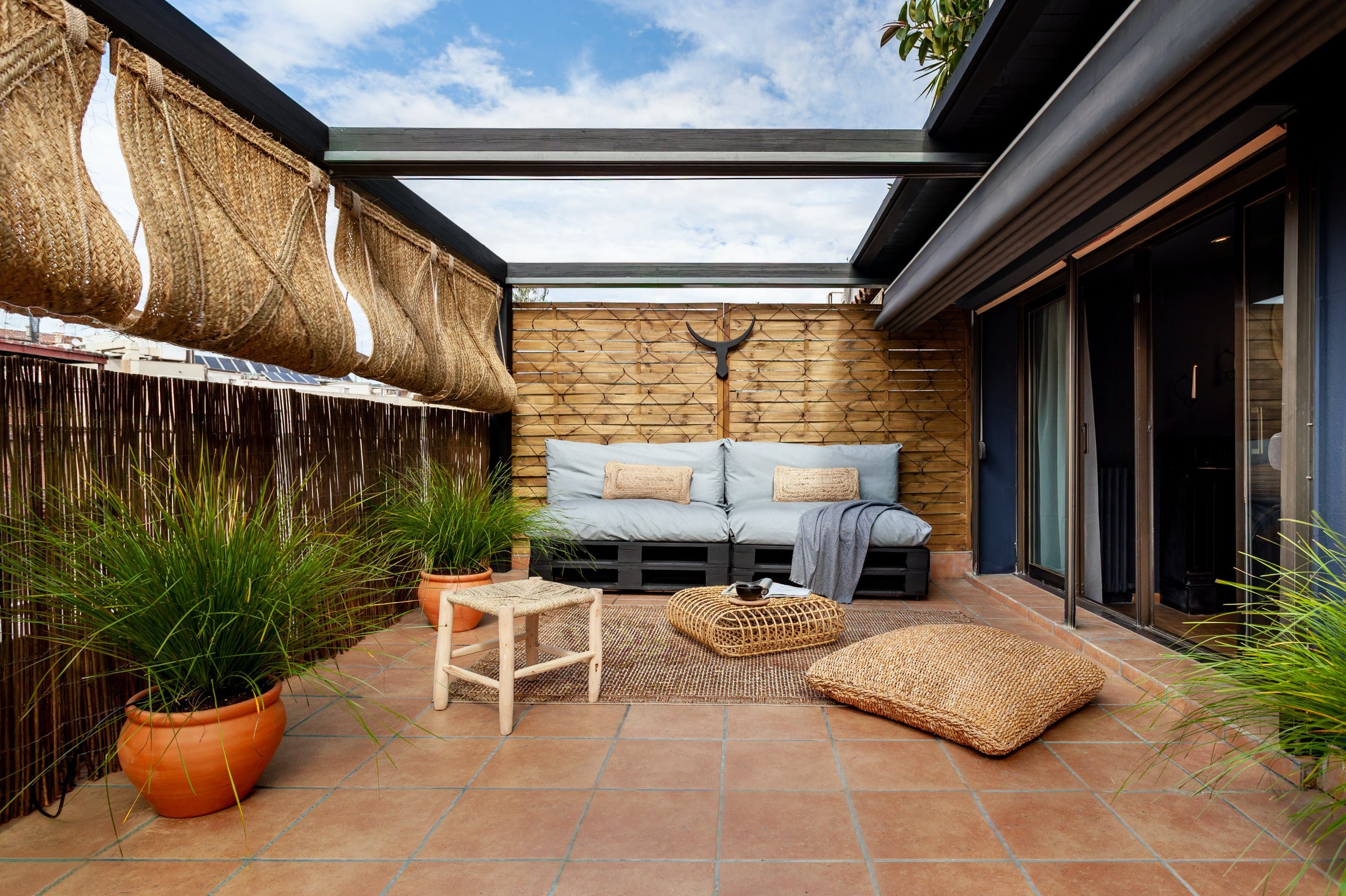 Grand, beautiful and stylishly bohemian, this apartment in Barcelona’s Eixample Esquerra neighbourhood provides a luxuriously relaxing stay within easy reach of the city’s most iconic sights. Inside, the decor has been playfully curated to juxtapose light and dark, with pale wood accents contrasting against deep-hued feature walls to create an intimate space that instantly feels soothing. We love the eclectic furnishings – from the low-slung sofa with its statement neon light to the mixture of chairs around the large dining table – and the original ornamental fireplace that adds a touch of grandeur to the laid-back, bohemian furnishings. The kitchen is any home cook’s dream with its neutral cabinetry, compact island and floor-to-ceiling blackboard, while the two bedrooms provide the perfect canvas for a dreamy night’s sleep with their earth-toned palettes and grasslands-inspired ornaments. Our favourite feature of the home, however, is the large private terrace equipped with a sofa, a table and chairs. Whether you’re kicking back with your morning coffee, gathering here over a jug of sangria or sitting down to a meal beneath the glow of the fairy lights, you’ll love having this outdoor space to catch some Spanish rays and indulge in the balmy air. Outside of your home, you’re a twenty-minute walk from Casa Milà, a thirty-five-minute stroll from La Sagrada Família, while all around you, Eixample Esquerra's art galleries, swish cafes, and luxury boutiques wait to be explored.