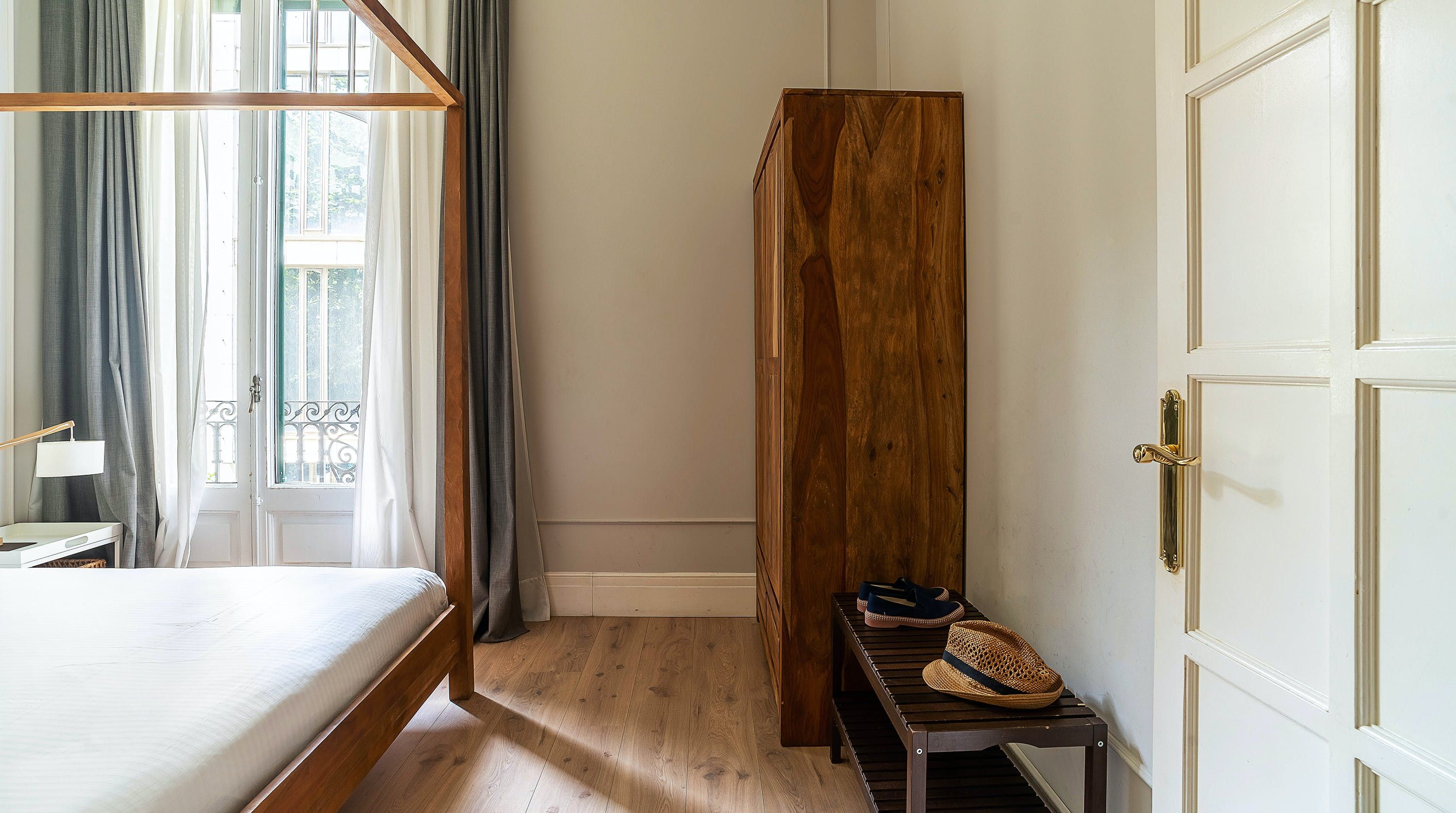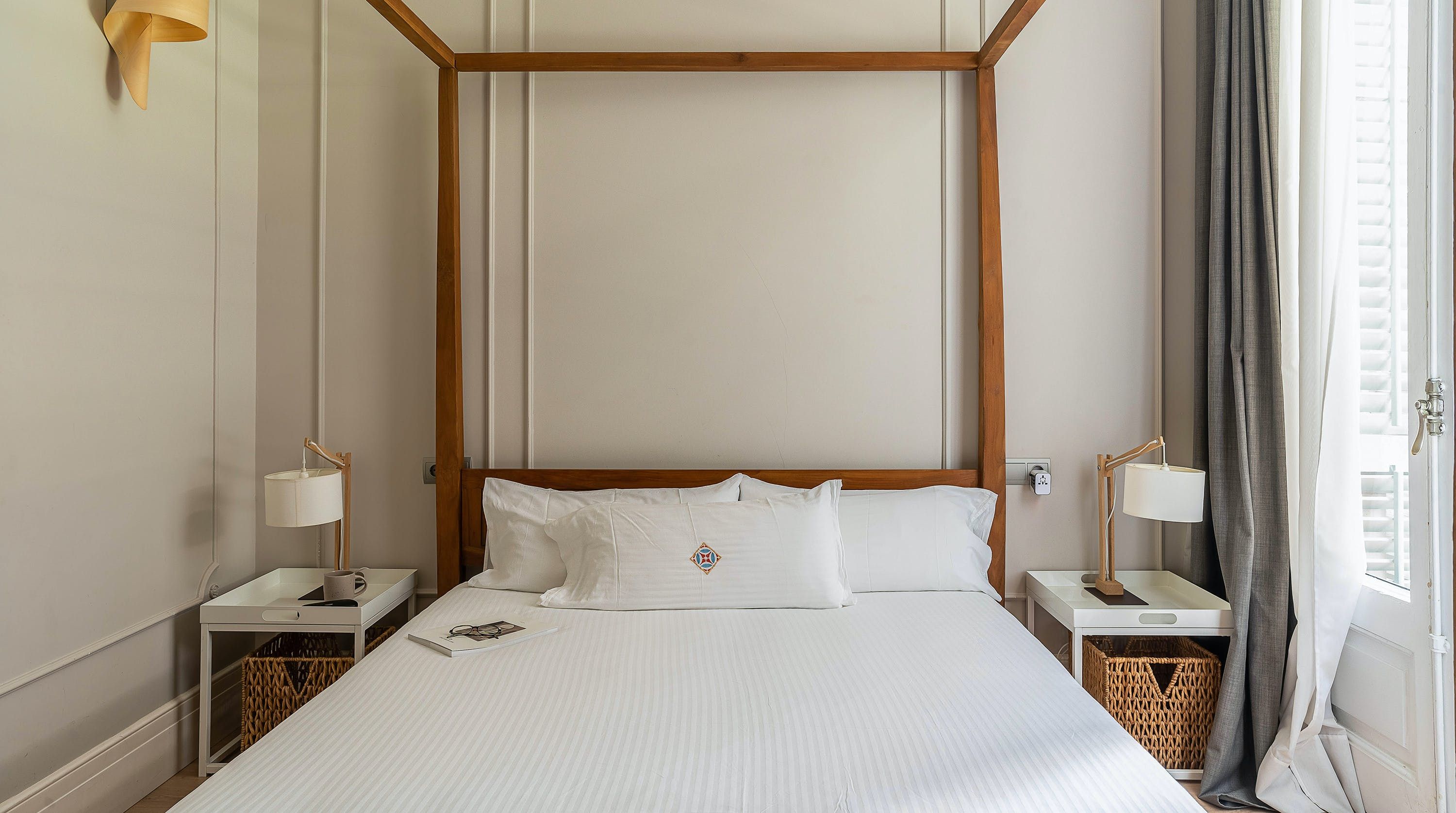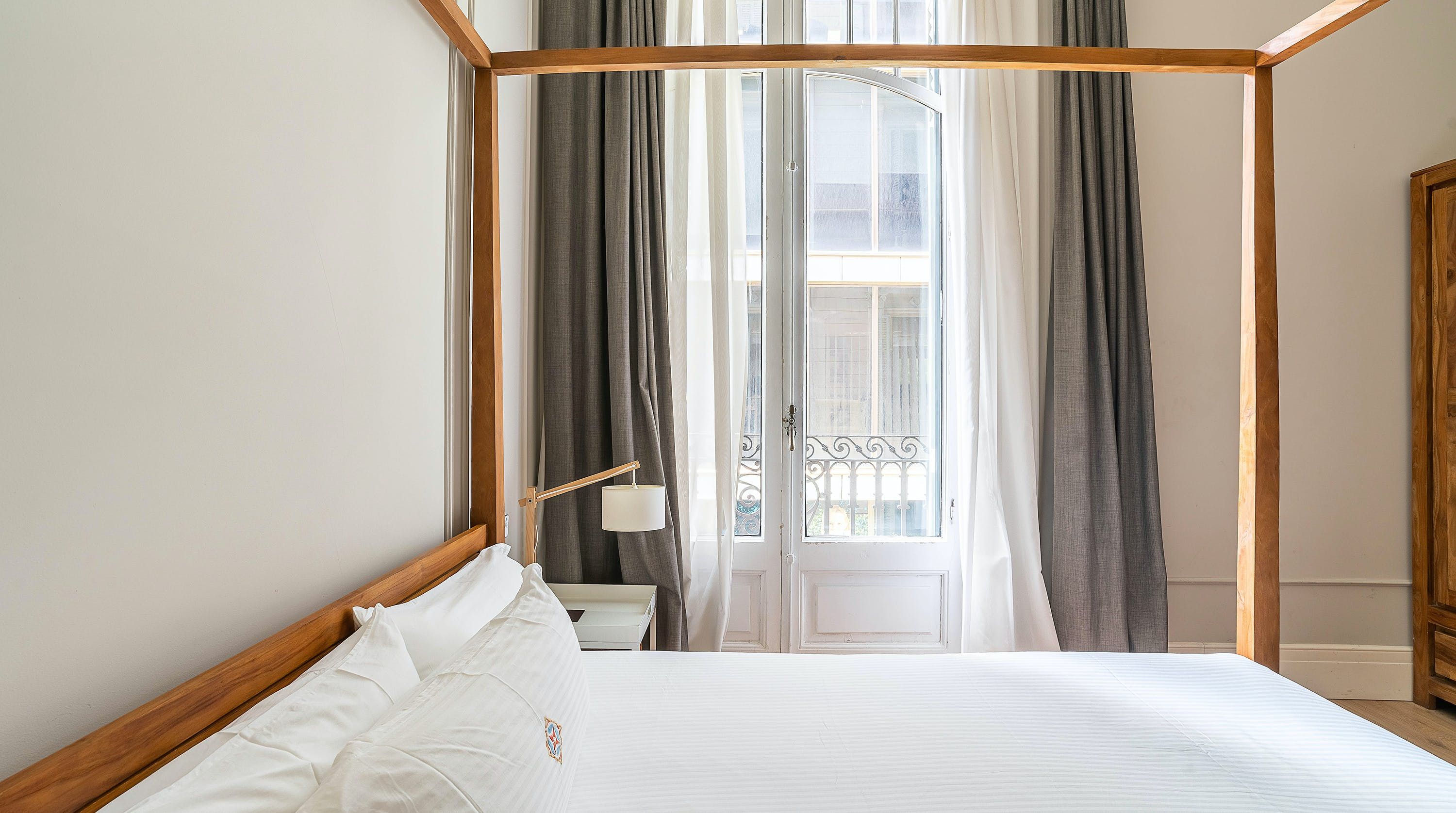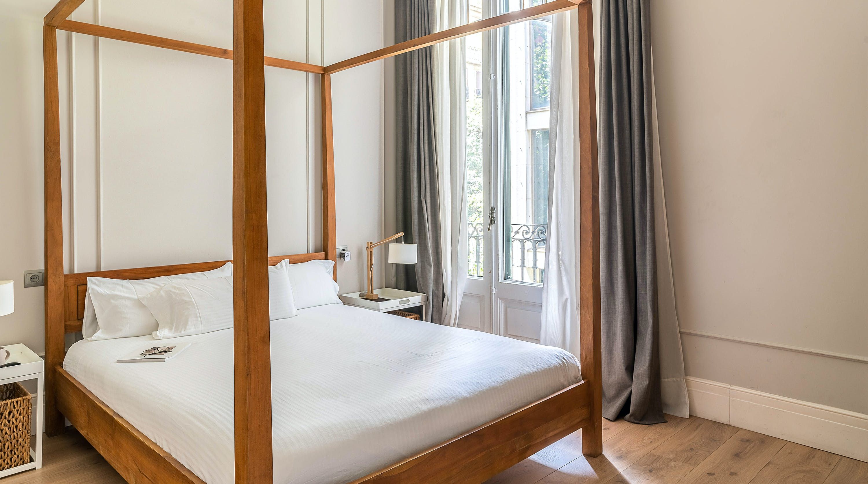 Back at this home, open the French doors to the balcony and have a seat on the comfy sofa after all that sightseeing. We love the high ceilings here and traditional wall mouldings. There's a gorgeous, modern four-poster bed as well – this place is perfect for a couple or friends looking for a bolt hole in Barcelona.