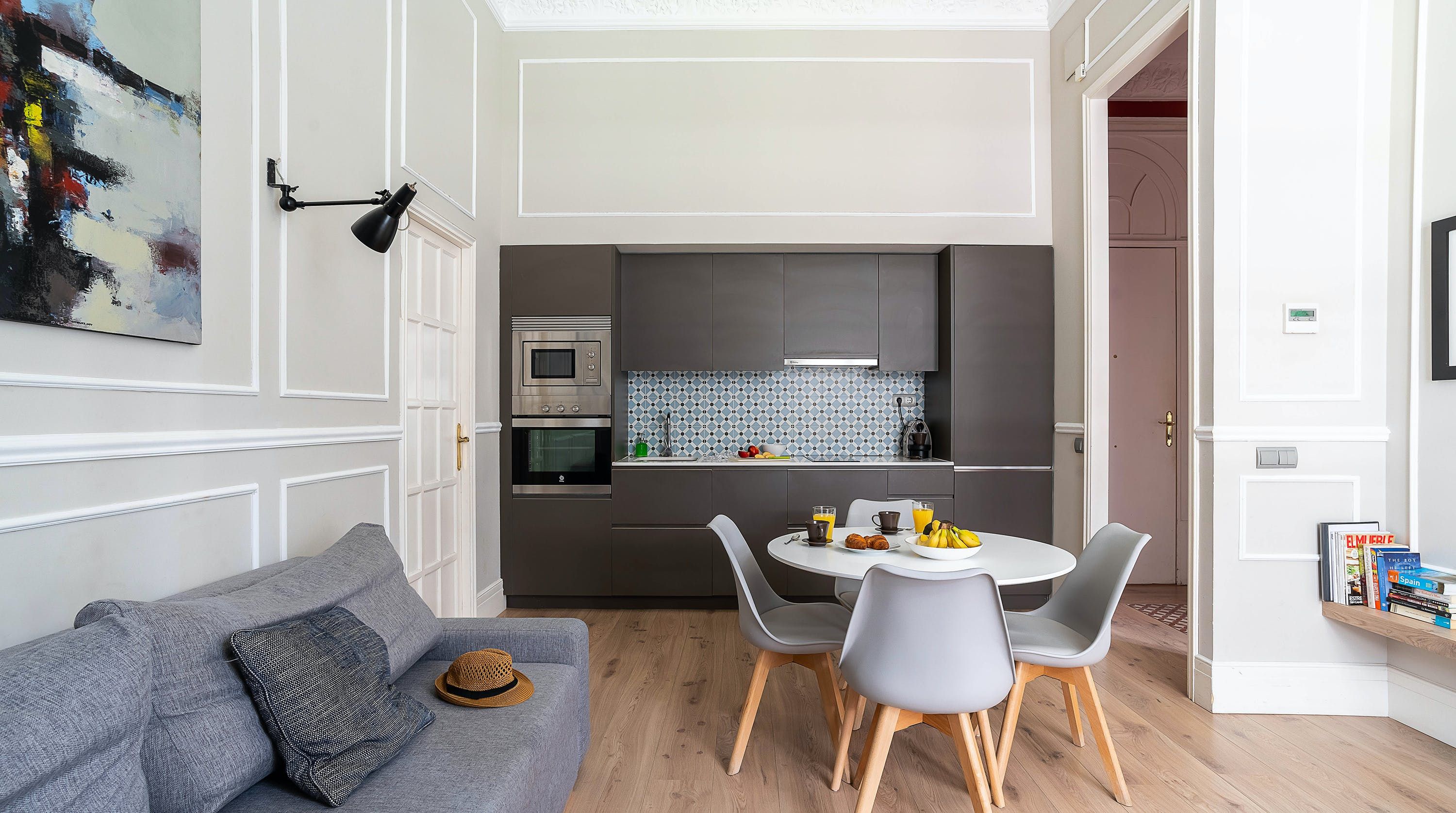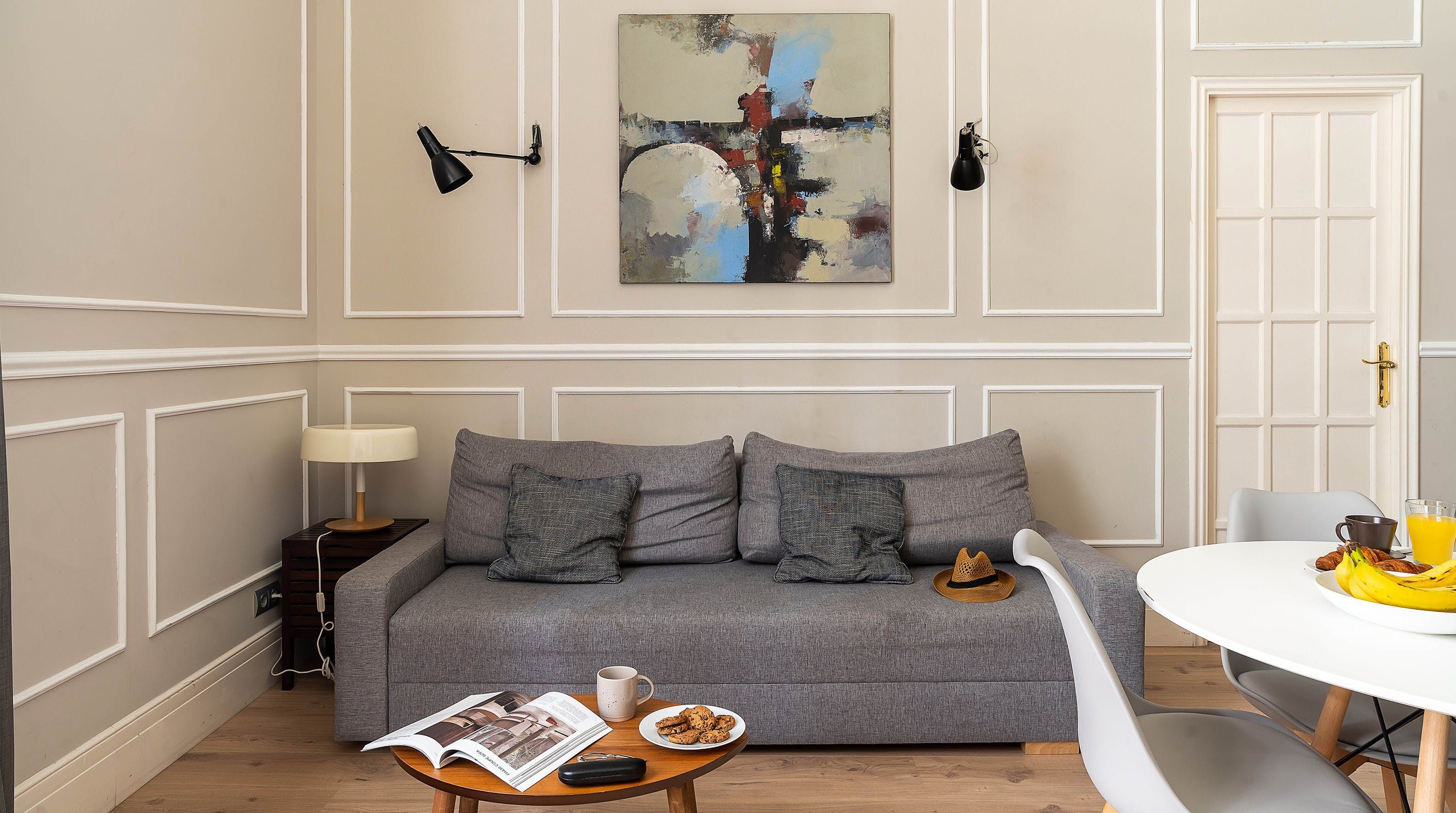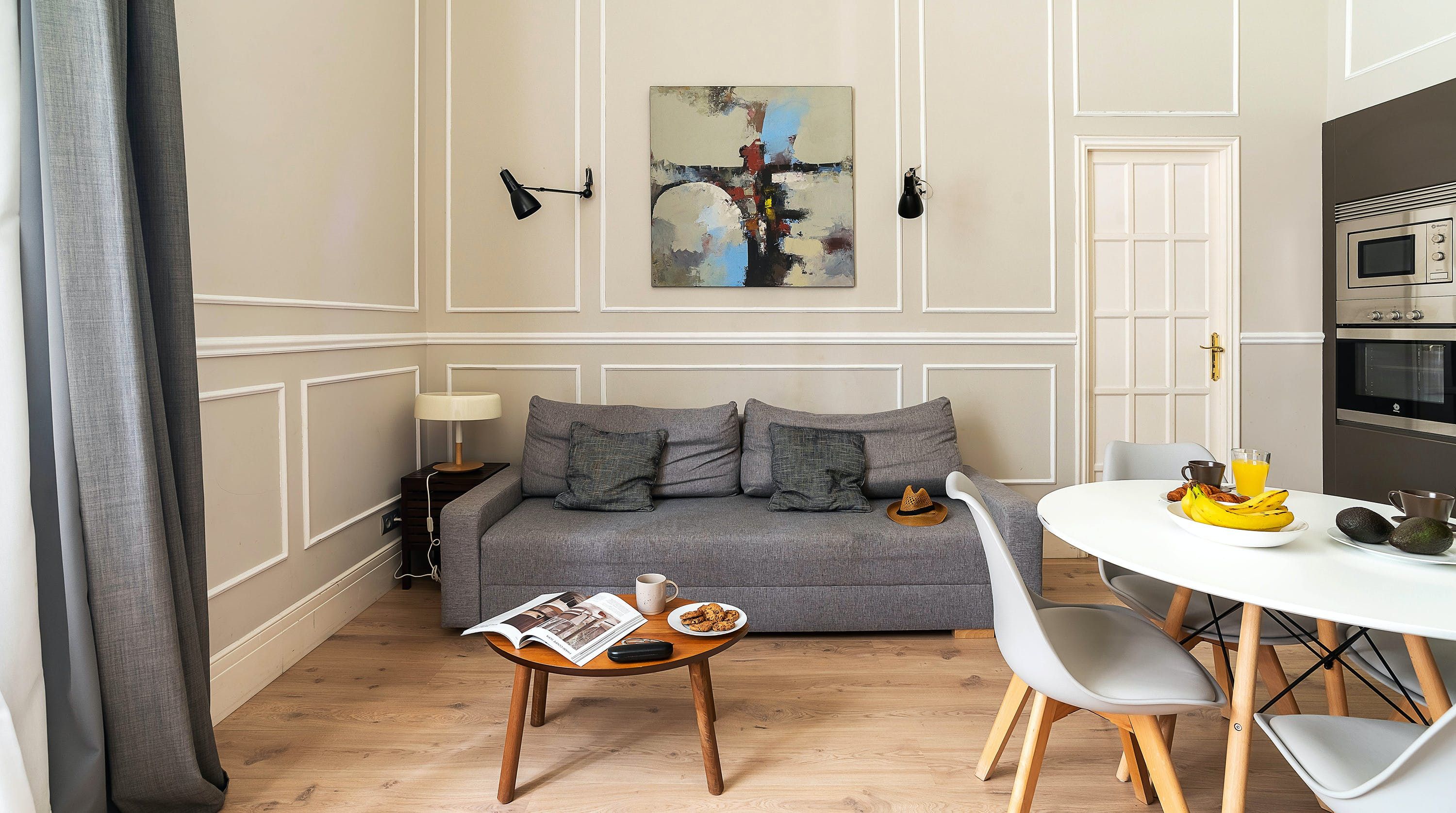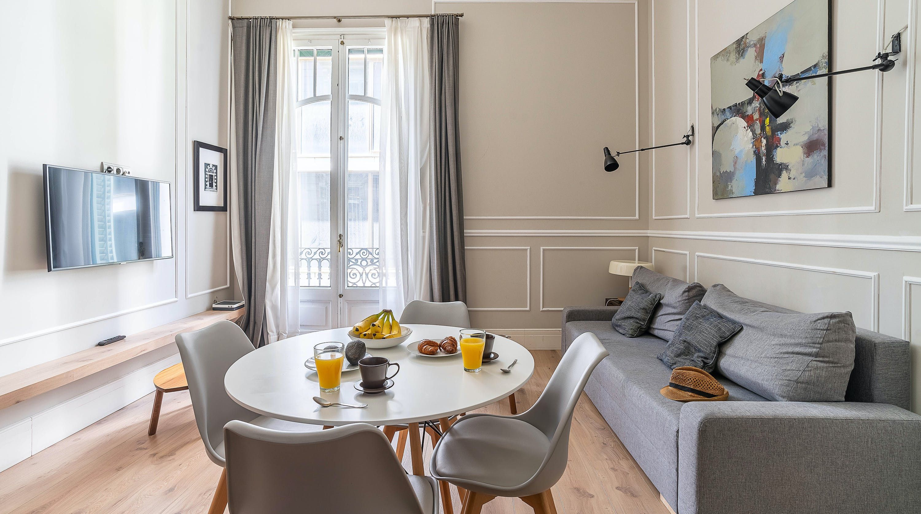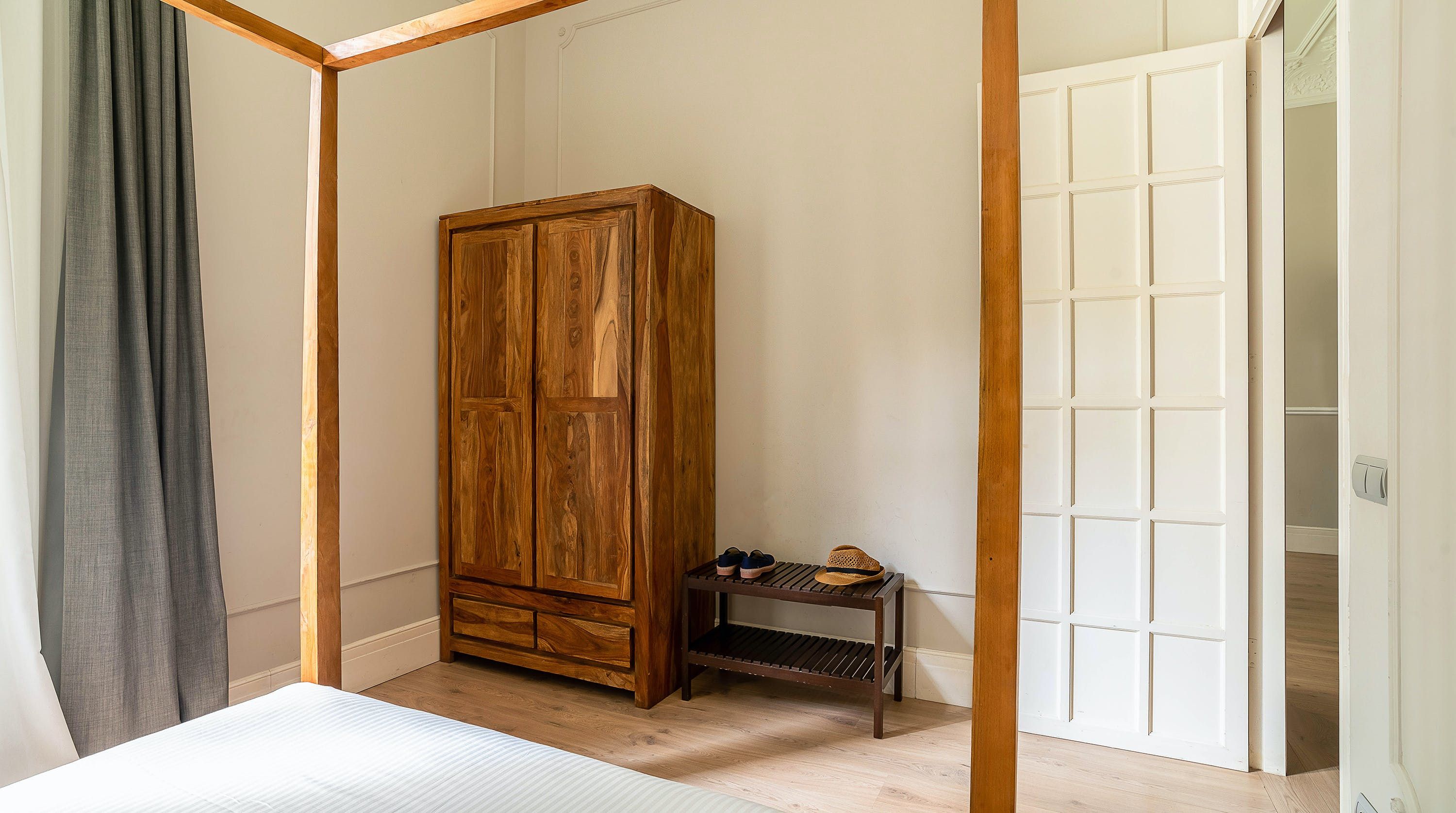 Back at this home, open the French doors to the balcony and have a seat on the comfy sofa after all that sightseeing. We love the high ceilings here and traditional wall mouldings. There's a gorgeous, modern four-poster bed as well – this place is perfect for a couple or friends looking for a bolt hole in Barcelona.