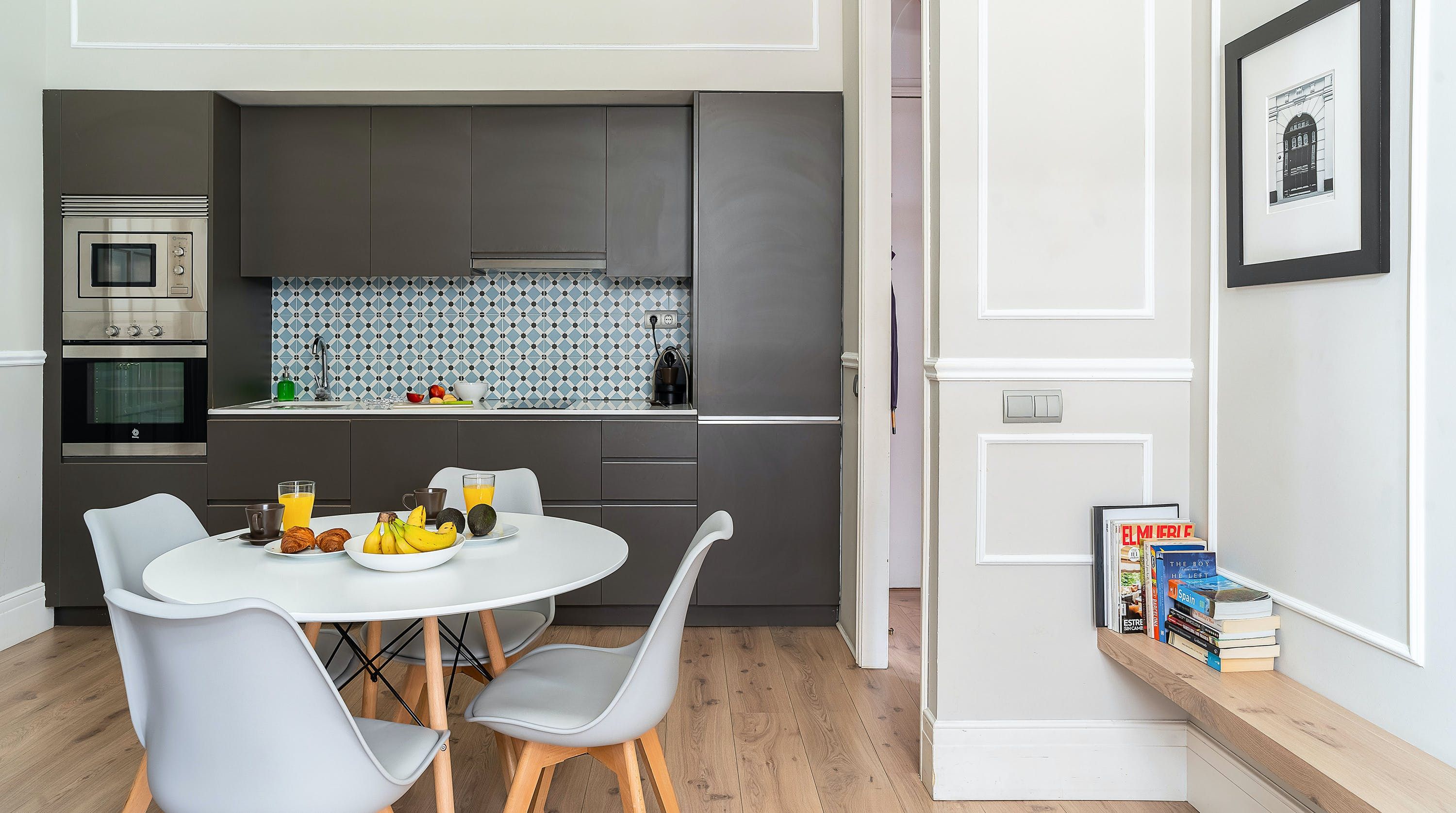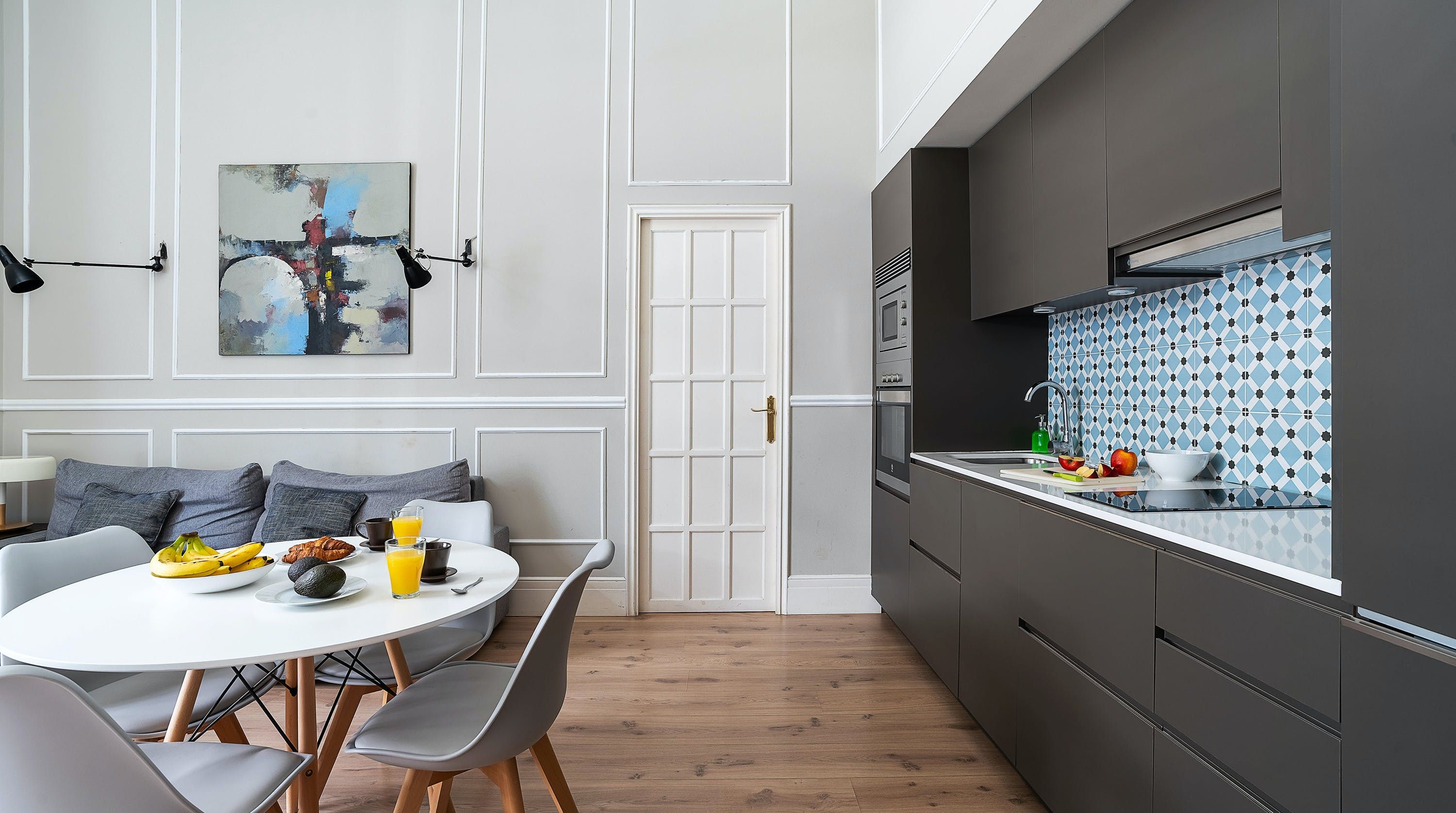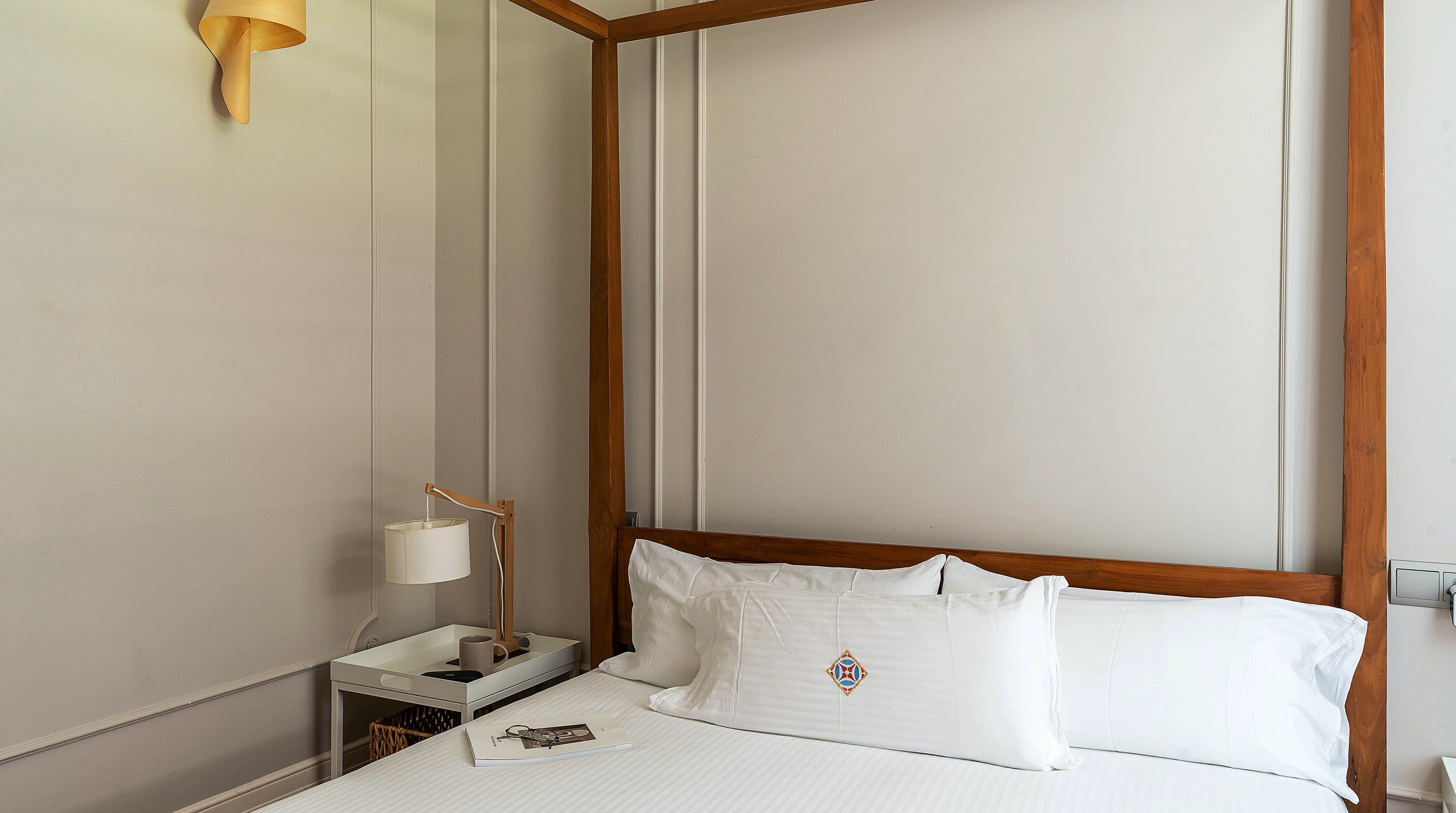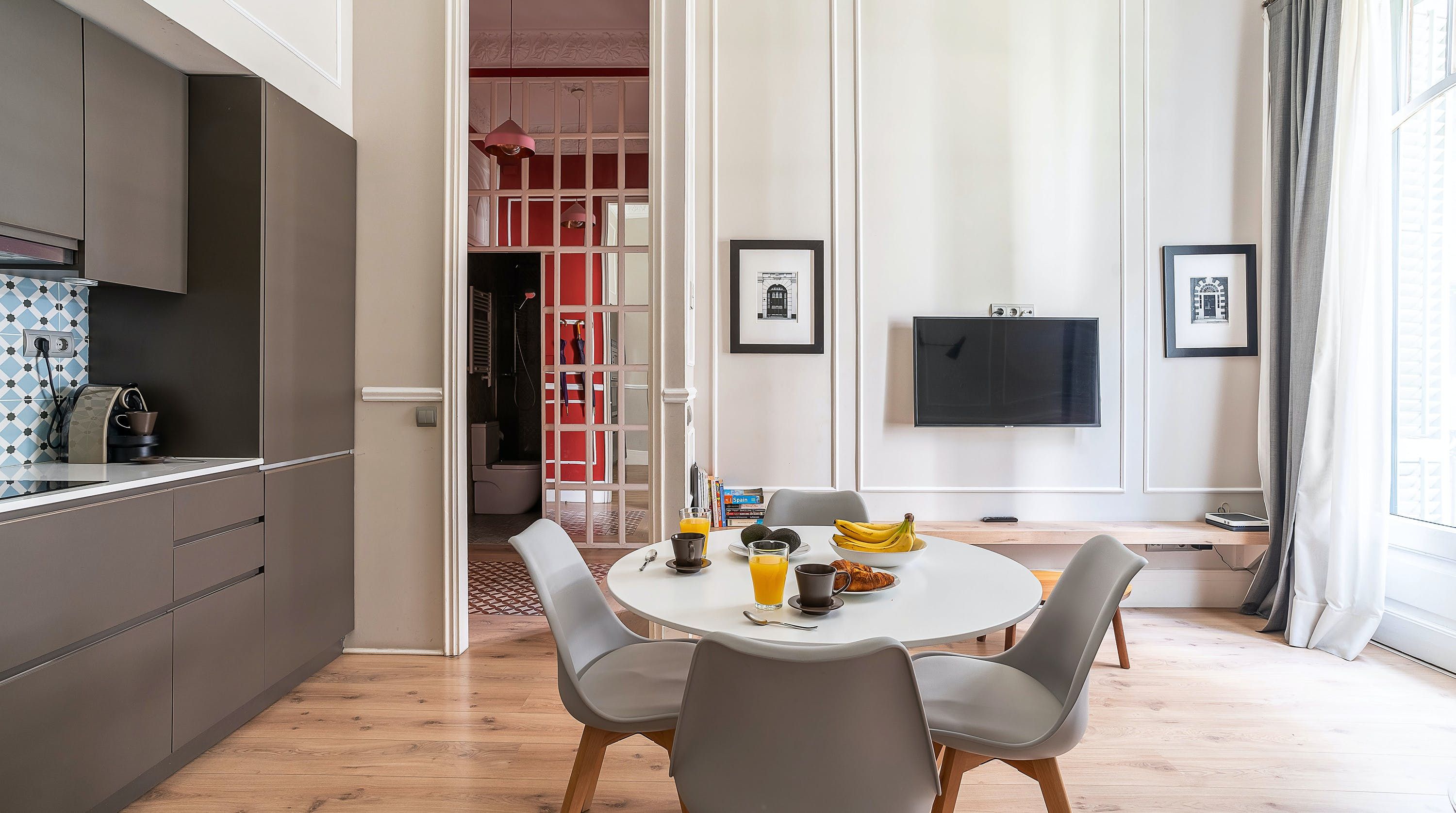Back at this home, open the French doors to the balcony and have a seat on the comfy sofa after all that sightseeing. We love the high ceilings here and traditional wall mouldings. There's a gorgeous, modern four-poster bed as well – this place is perfect for a couple or friends looking for a bolt hole in Barcelona.