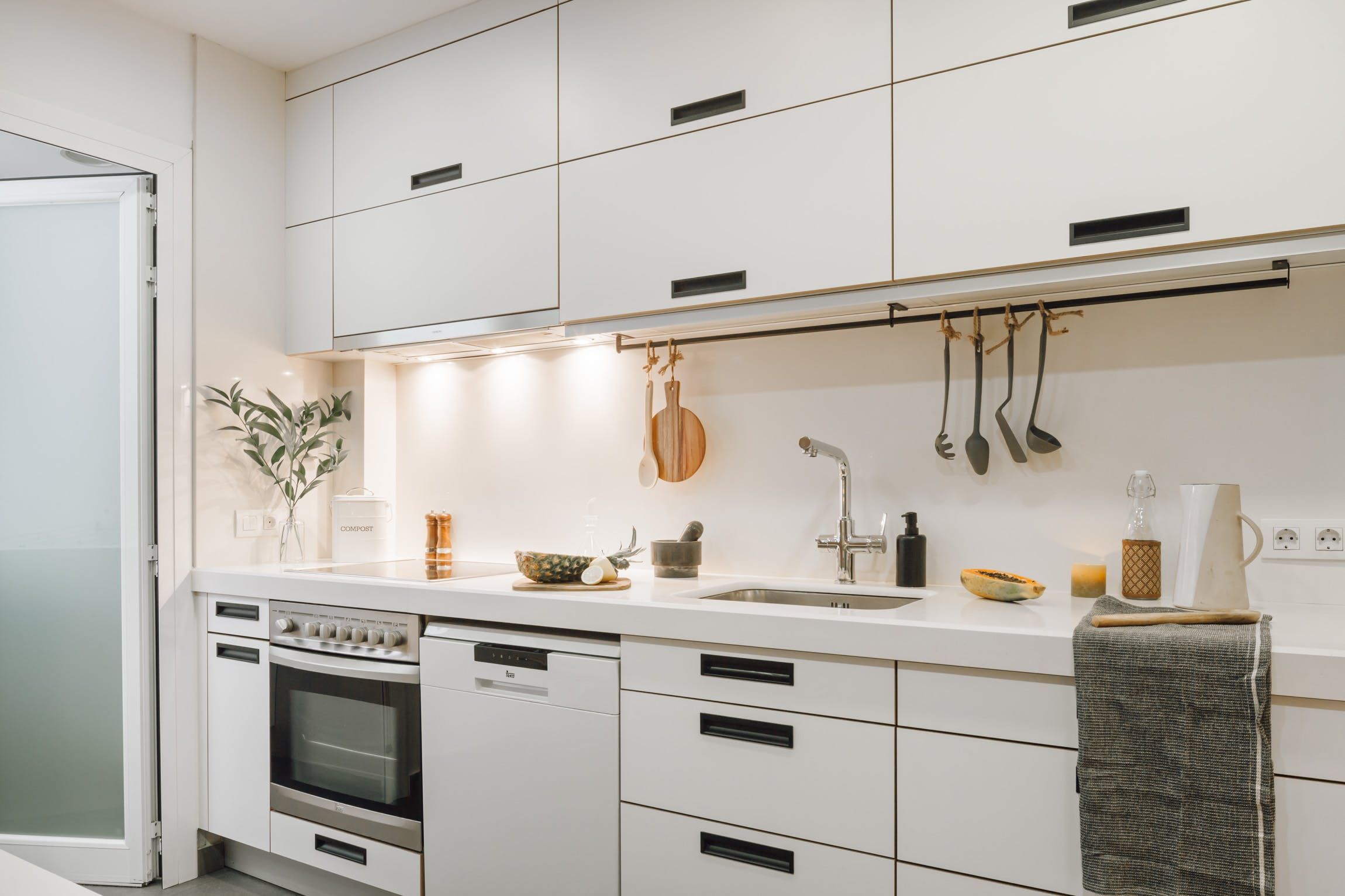 After a day of dashing about, you'll be welcomed by the bright and cosy living room, decorated with jungle-themed details, inviting you to kick back and relax with an evening of movies with your loved ones. You can also just pop on a record and enjoy a glass of wine out on the balcony. If you don’t feel like eating out, the sleek and modern kitchen will make putting together a delicious meal a work of moments.