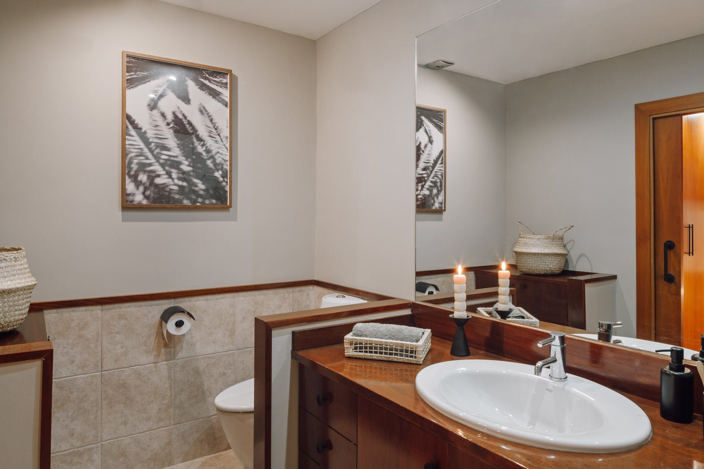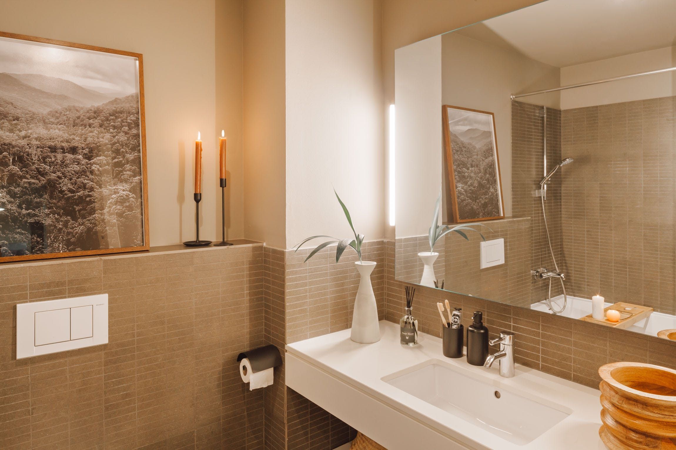Should you have some work to catch up on, or simply feel like having a moment to yourself, there’s also a lovely workspace, with a handsomely crafted desk and stylish shelves. For a night of restful sleep head over to the comfy bedrooms – factor in the spa-like ambience of the bathrooms, including one with a bathtub, and you’ve got everything you may need for a relaxing stay.