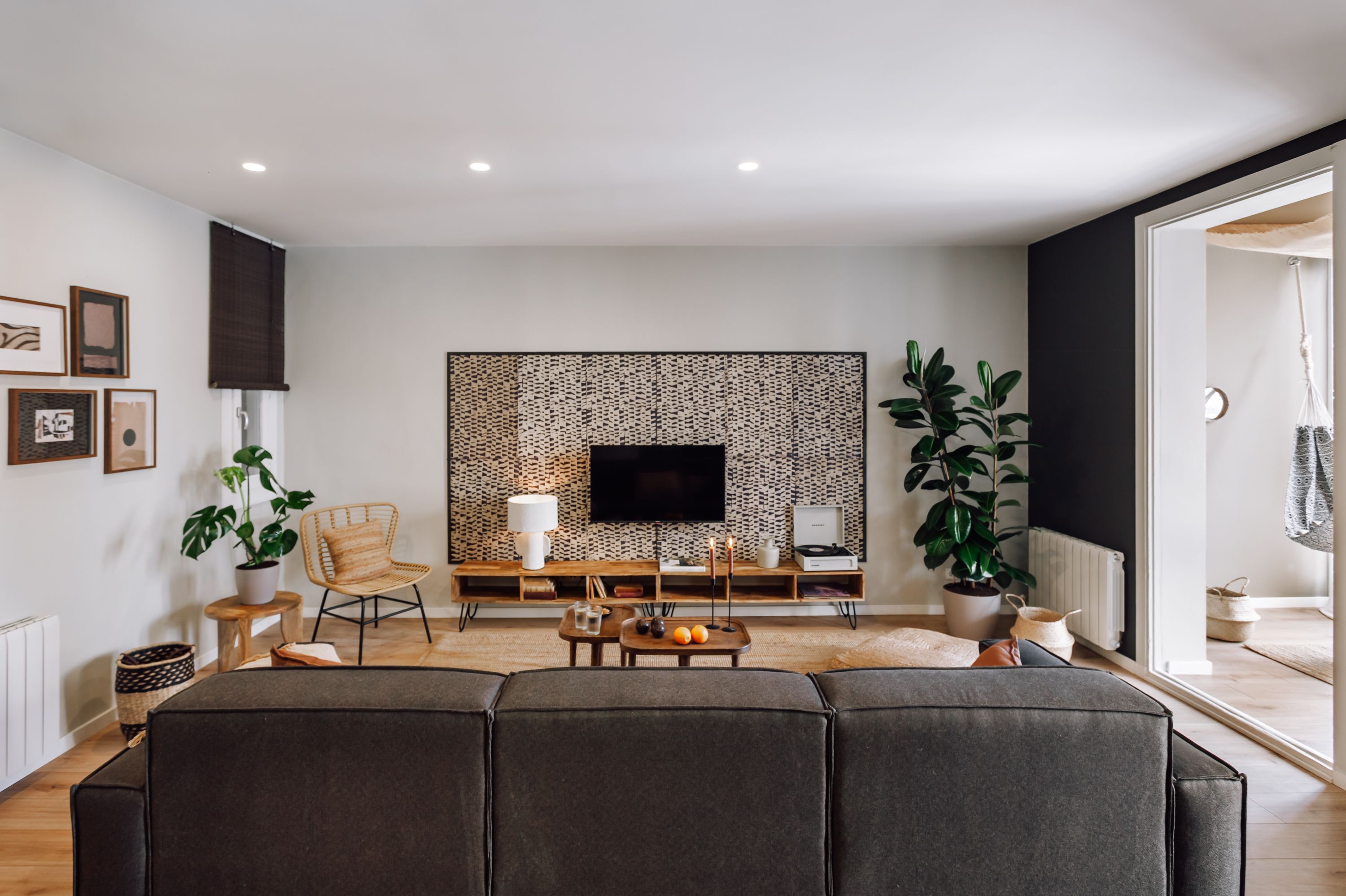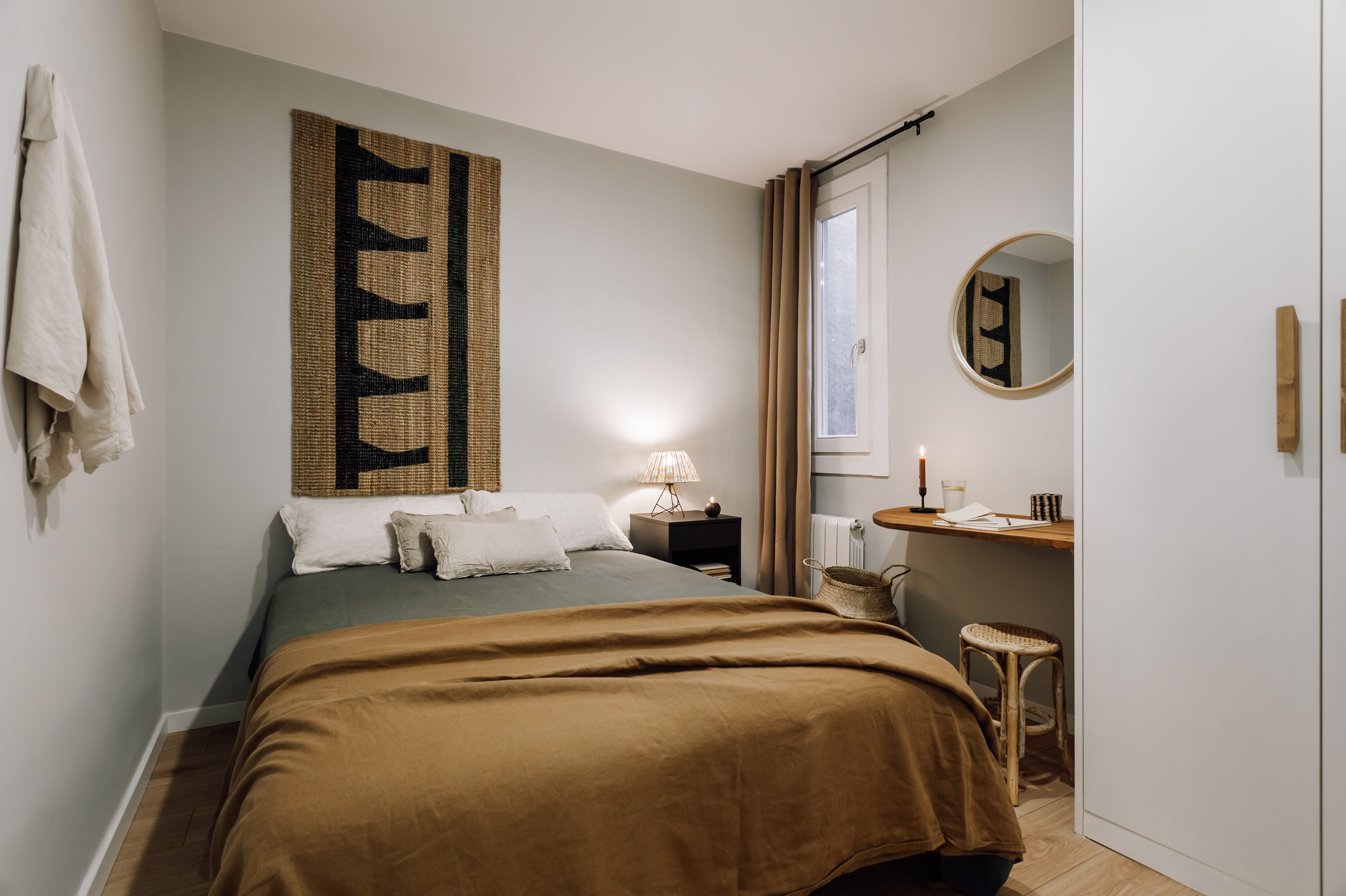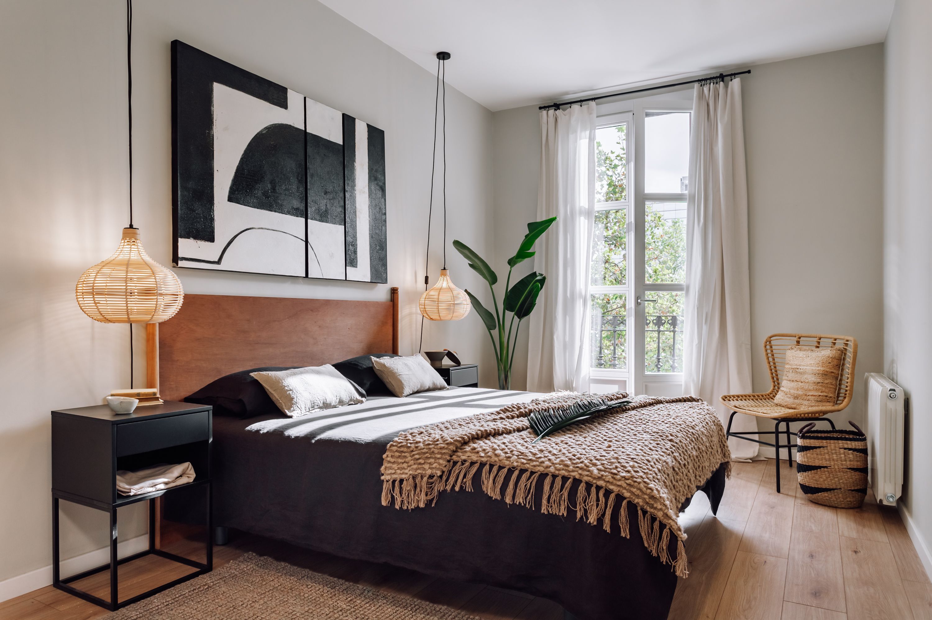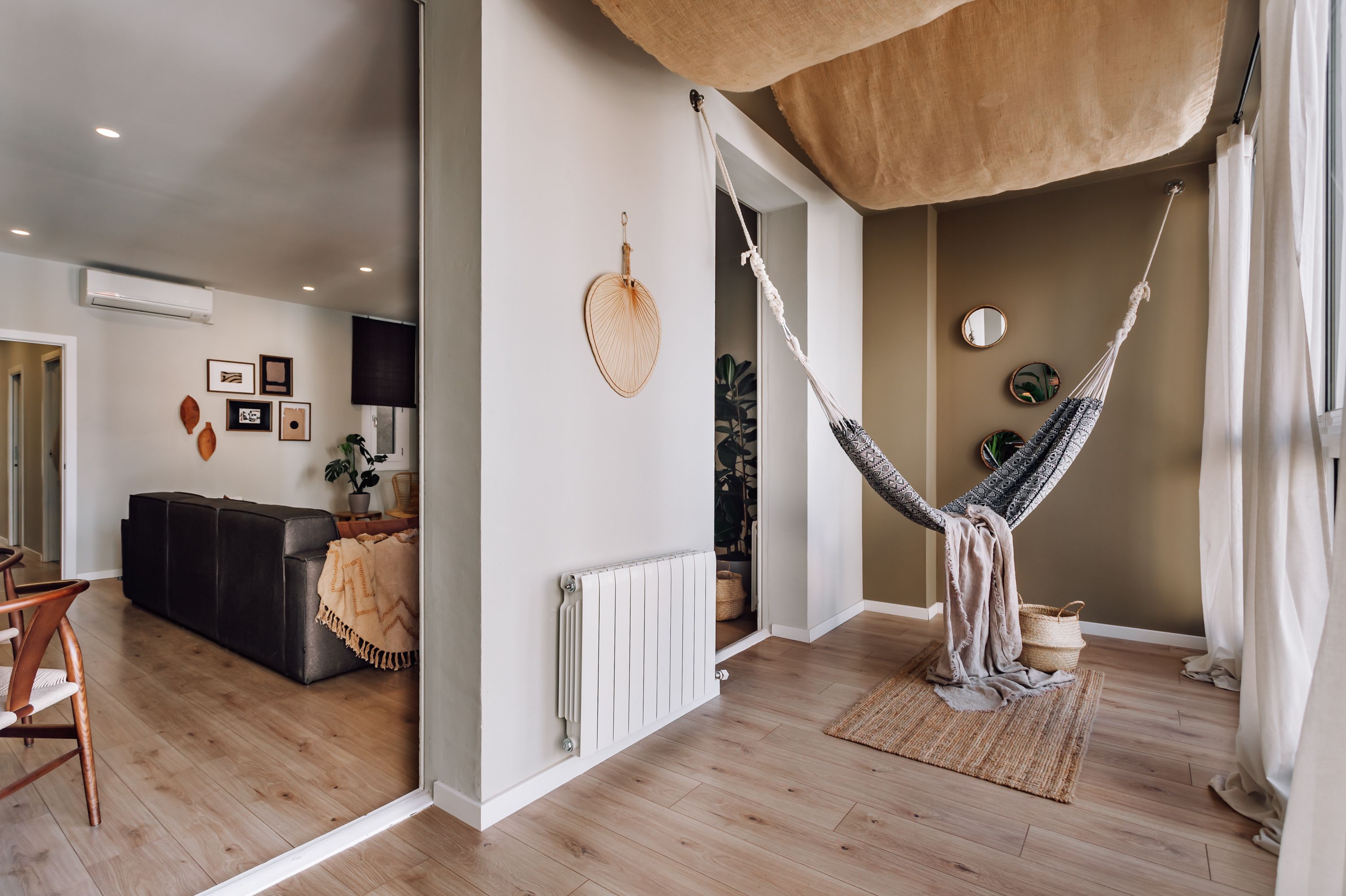 Perfectly placed, this stylish apartment has Barcelona’s best bits within easy reach. The Casa Milà and Sagrada Familia are within a twenty-minute walk of the building, and Somorrostro Beach is easily reached by metro. Those visiting on business will be pleased to know there’s a desk here for remote working, while those here for pleasure should make a beeline for the hammock. The home benefits from a balcony, but space is limited, so you won’t find anywhere to sit.