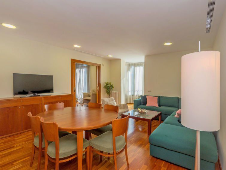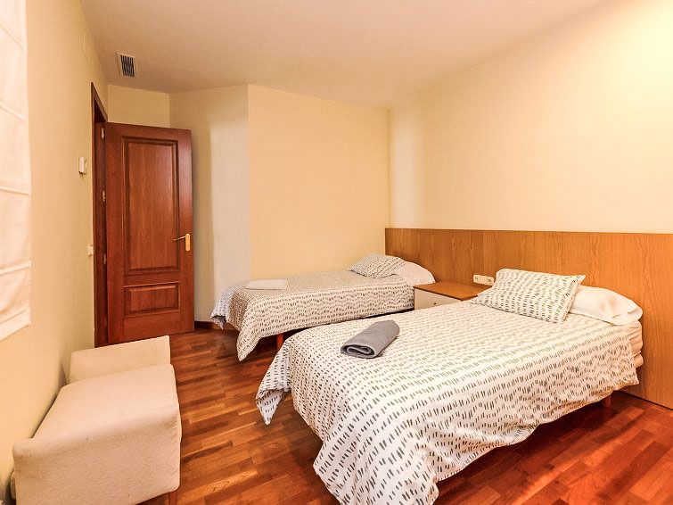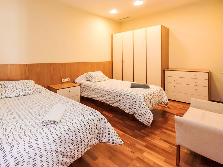 4-room apartment 100 m2 on 5th floor. Practical and comfortable furnishings: living/dining room with digital TV and air conditioning. 1 room with 2 beds (90 cm, length 190 cm). 1 room with 1 french bed (160 cm, length 190 cm). 1 room with 1 french bed (140 cm, length 190 cm), bath/WC.