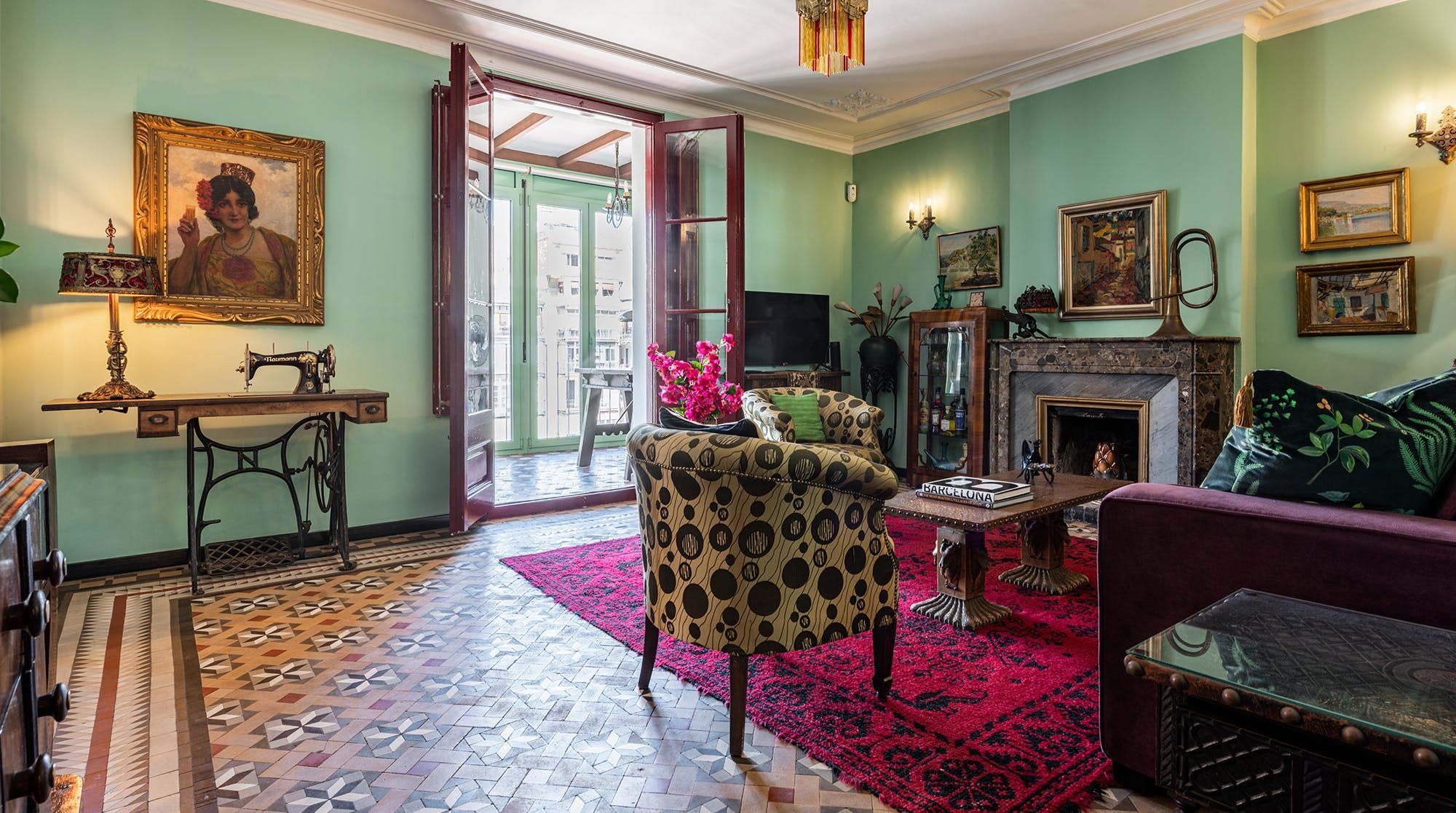 Immerse yourself in Old World Barcelona with this art-filled apartment situated just a few minutes walk from Plaça Catalunya. This newly renovated home greets you with a brilliant fusion of colours, patterns, and a creative mix of authentic furnishings that hearken to the stylish age of yesteryear. Walls are adorned with a varied collection of turn-of-the-century artwork in gilded frames, while the original floors are covered in antique mosaic tiling. Even the bathroom tiling is reminiscent of Gaudi's Modernism.