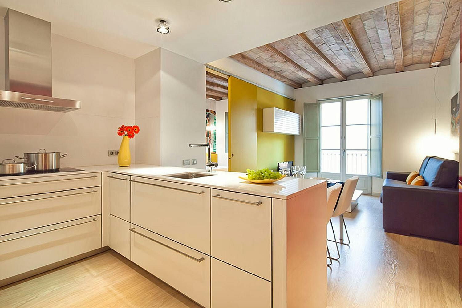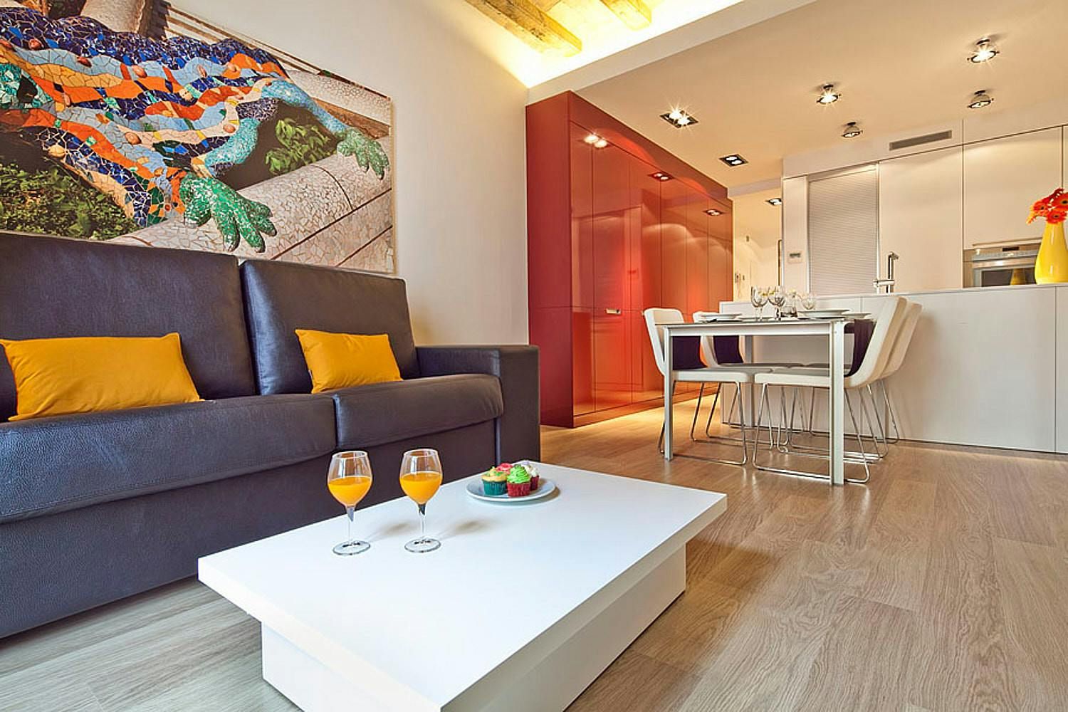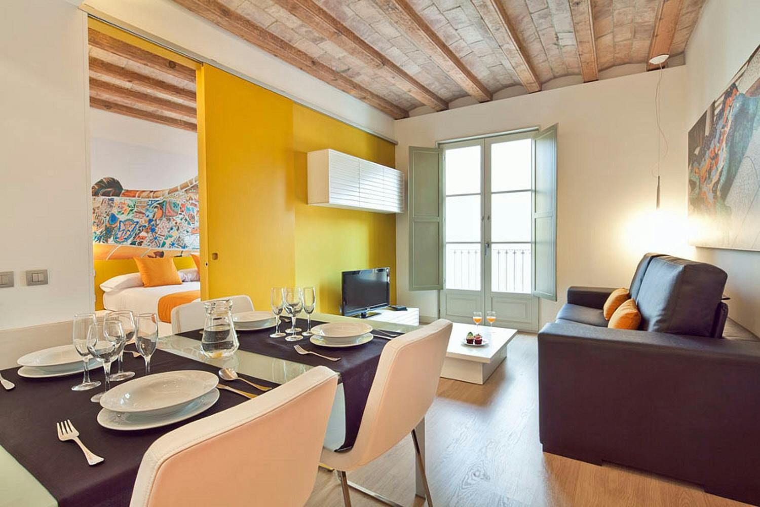 One of many similar apartments, this pad puts you smack-dab in the centre of Barcelona. Stroll down Las Ramblas, 100 metres away, and admire the Guadí architecture while doing a bit of shopping. Venture five minutes further and you'll hit Plaça de Catalunya, one of the most popular spots in the city. Two guests will sleep on a sofa bed here, and when it's in use, the socialising space isn't the biggest. There's also likely to be street noise since you're so central. That aside, with a cosy bedroom and full kitchen, it's a comfortable, practical spot to call home.